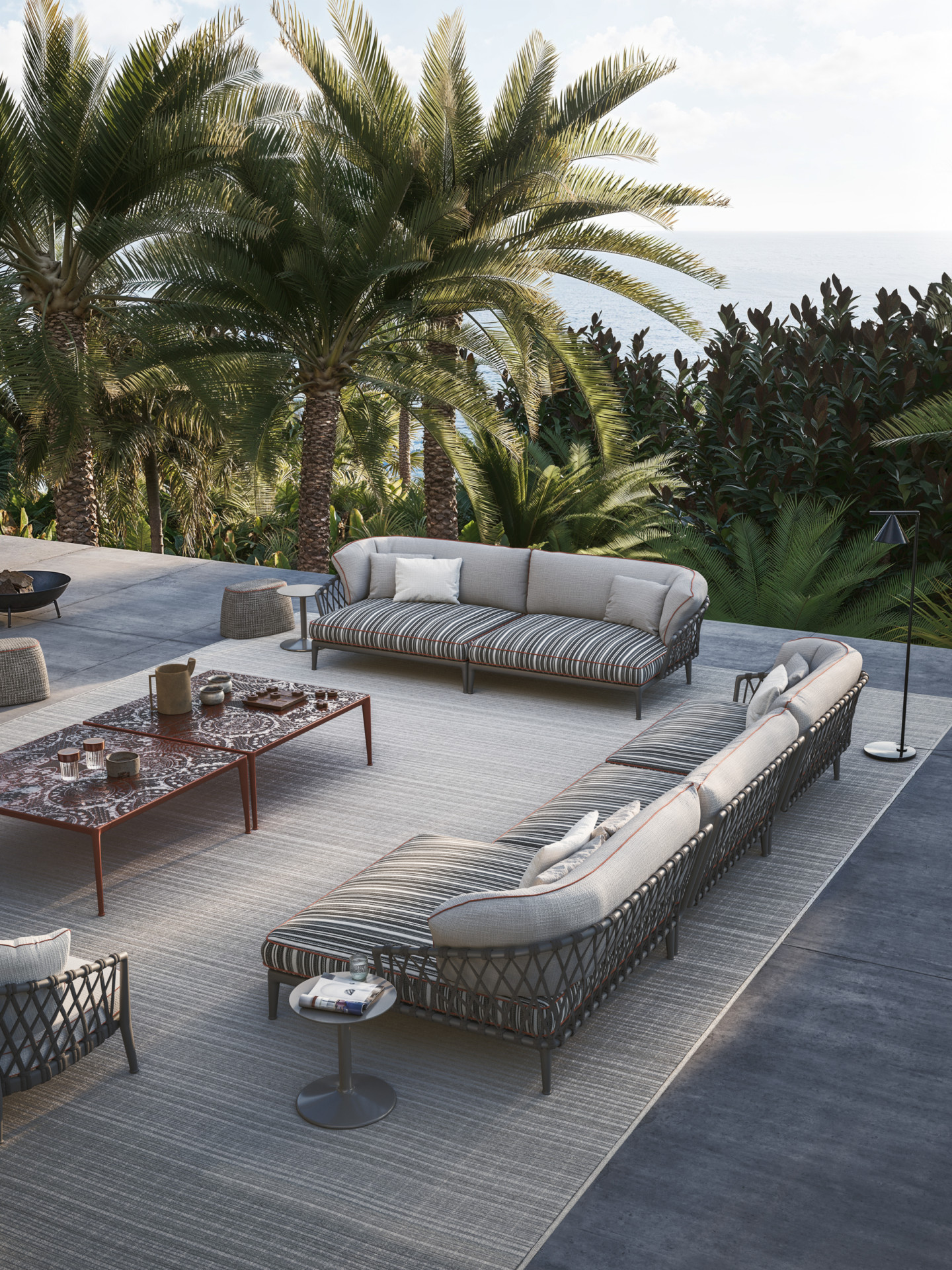 Modulární kolekce Insula od Patricie Urquioly adaptuje a modernizuje koncept tradičních arabských salónků a přináší variabilní řešení pro nevšední exteriéry. Nízká pohovka s rolovacím opěradlem umožňuje různé konfigurace pro společenská setkání a odpočinek. Vyvážené architektonické proporce a minimalistický design činí Insulu elegantním doplňkem každého prostoru. Díky mnoha konfiguracím ji lze přizpůsobit všem typům společenských setkání.