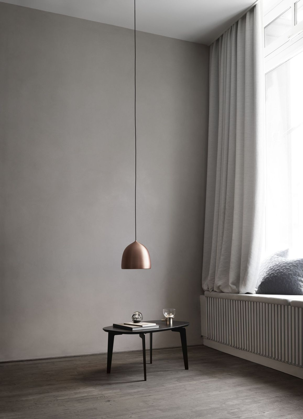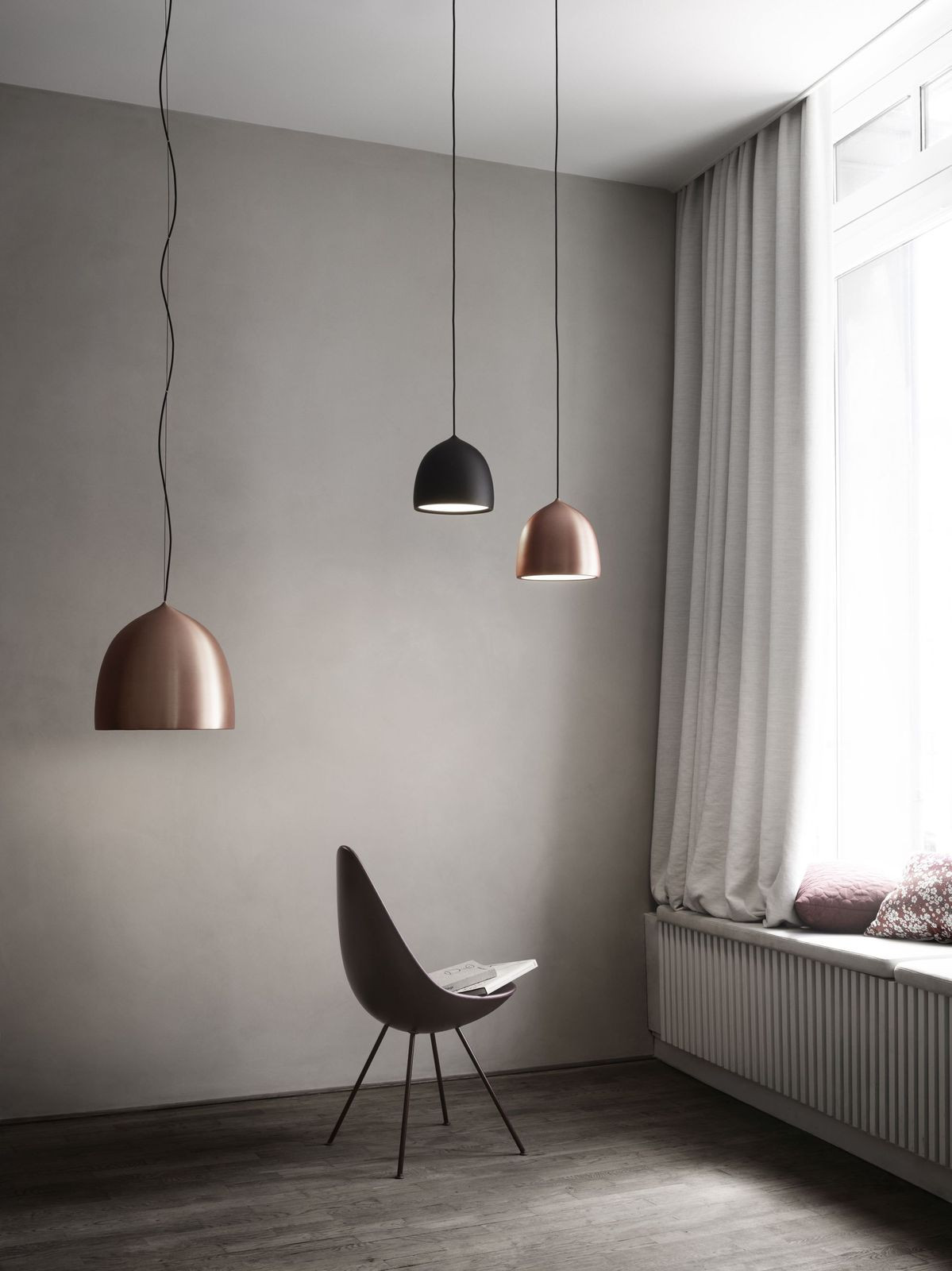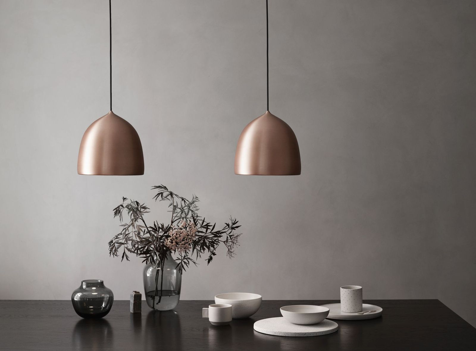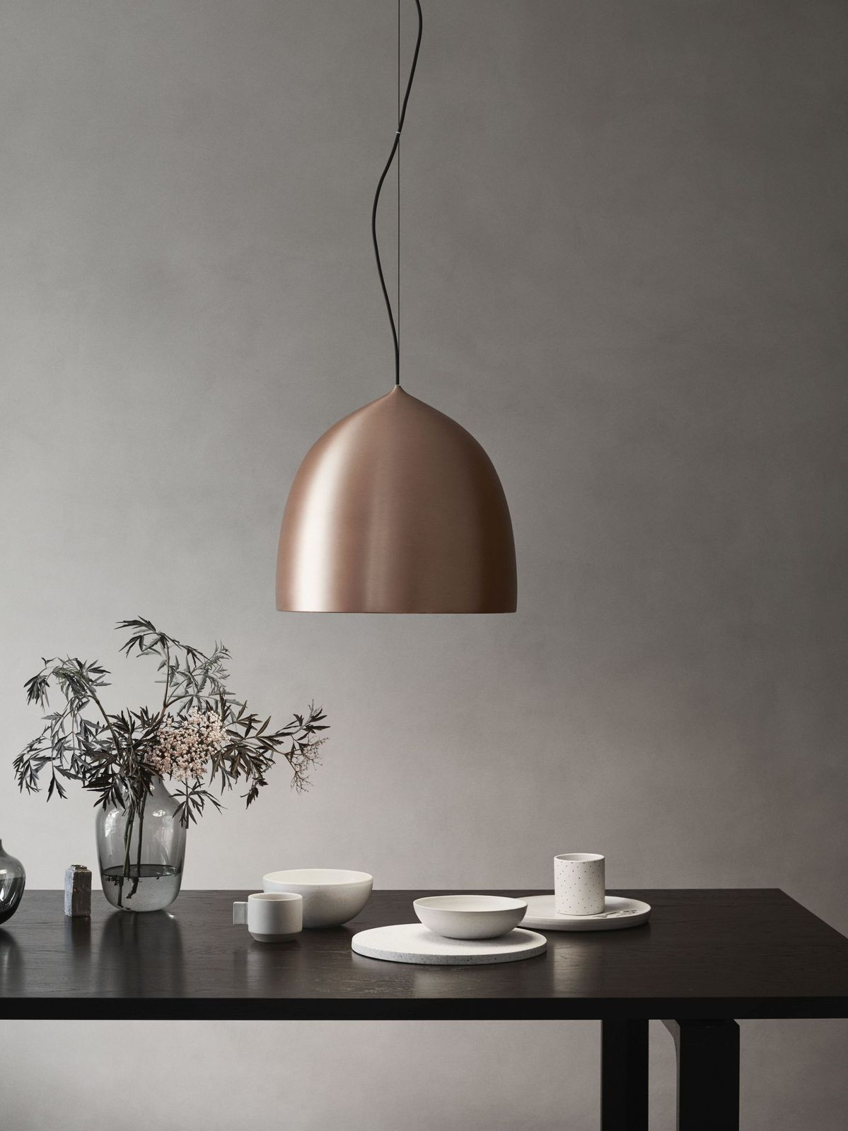 Kolekce Suspence z dílny dánsko-italského autorského dua Stine Game a Enrico Fratesi, která je inspirována pohybem, v sobě nezapře severský cit pro čistotu a minimalismus. Kalich svítidla tak přesně v tomto duchu tvoří se závěsnou stopkou ničím nerušený celek. Ve struktuře pláště je potom přiznána technika výroby, jemné tažení kovu.