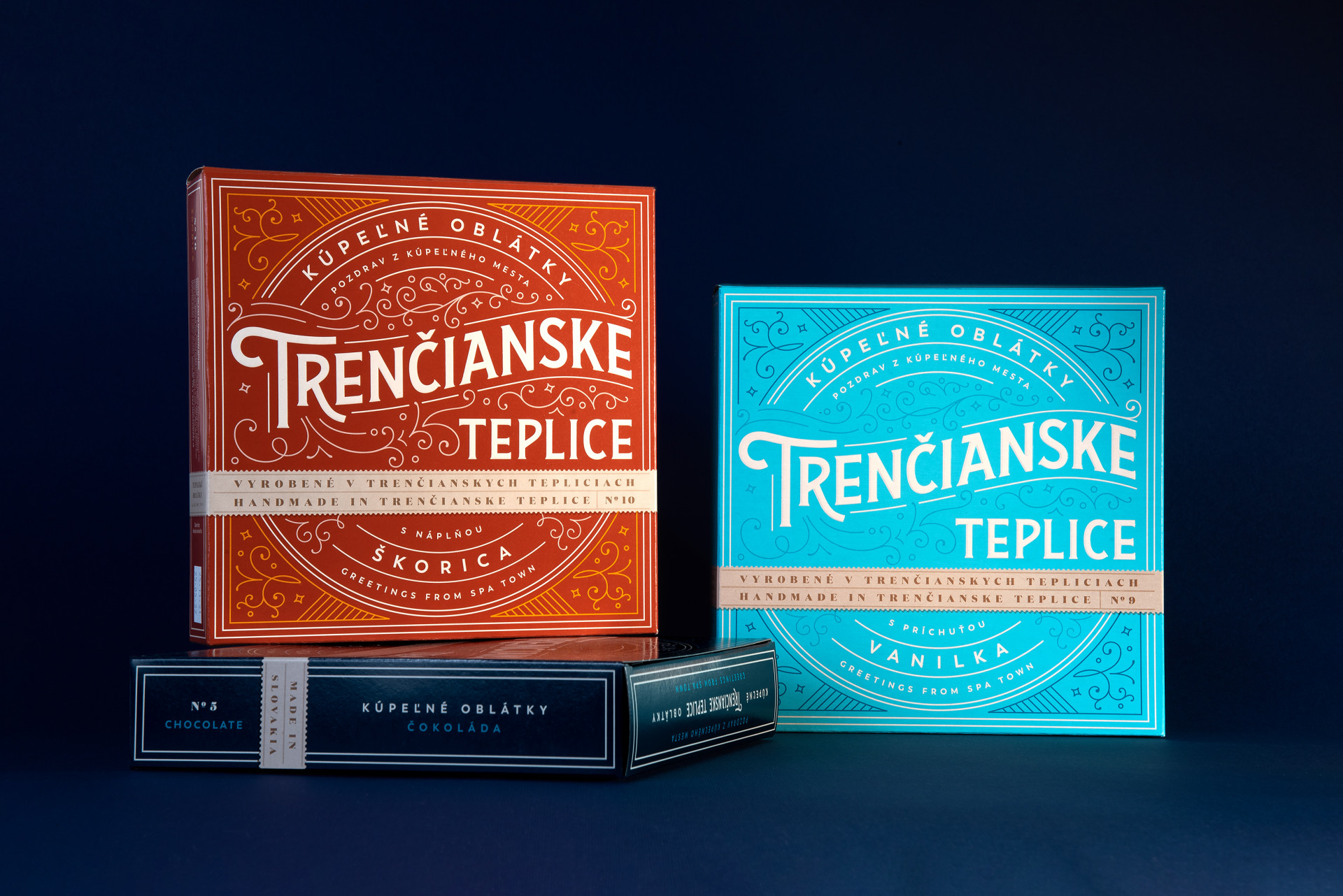 Dizajn obalov kúpeľných oblátok nostalgicky čerpá z 19. storočia typického dekoratívnosťou a úpadkovou typografiou. Originálne vytvorený logotyp Trenčianske Teplice tvarovo vychádza z nápisov na dobových fotografiách a pohľadniciach z kúpeľného mesta. Dekory kreslia tvar okrúhlych oblátok skrývajúcich sa vnútri a texty naznačujú pôvod oblátok, rukodielnu výrobu a jednotlivé príchute. Hoci dizajn odkazuje na históriu, nesnaží sa simulovať dojem starého obalu vybraného z archívu. Farby sú svieže a v mnohých prípadoch korešpondujú s príchuťou. Na zadnej strane sa v rôznych variáciách striedajú ilustrácie významných teplických pamiatok a kúpeľných domov spolu s rokmi, keď boli postavené. Škatuľa na sladkosti sa zároveň stáva suvenírom a pozdravom z kúpeľného mesta.