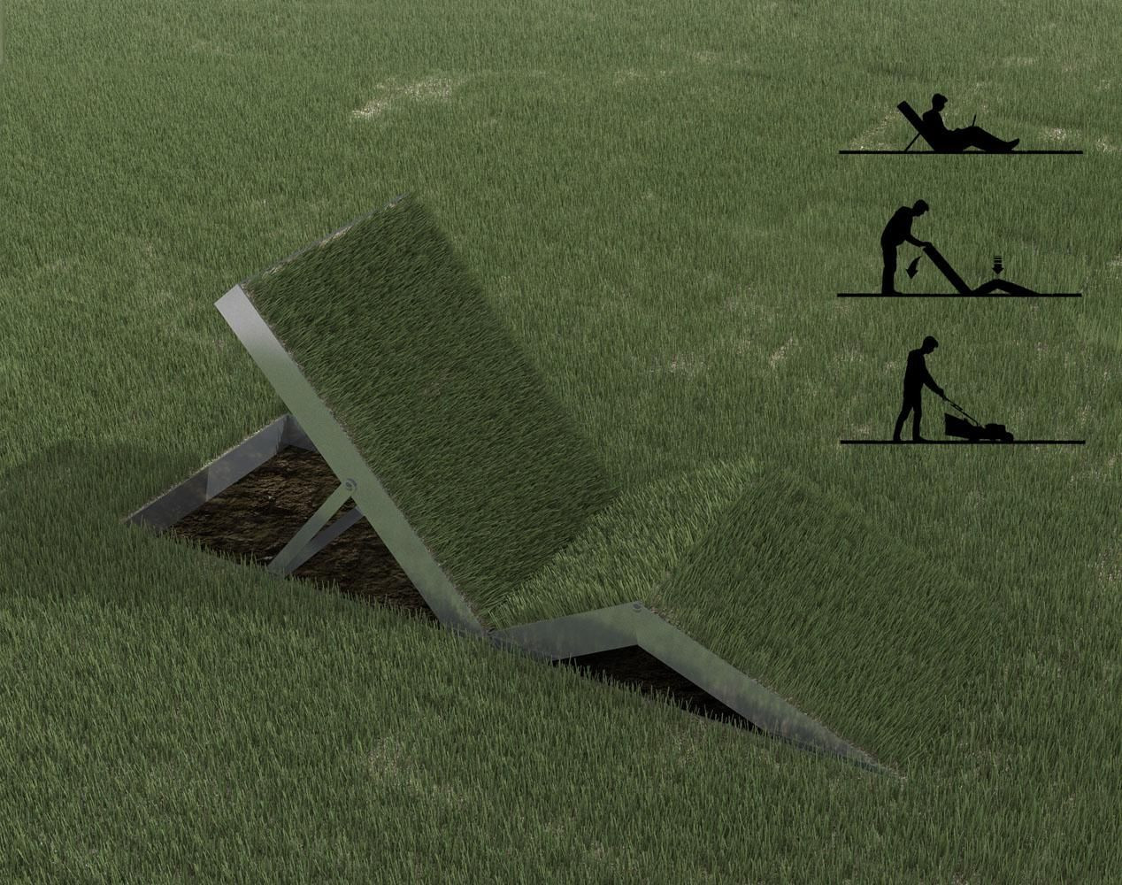 Venkovní stohovatelné lehátko k příjemnému posezení v trávě, navržené tak, aby se dalo sklopit do země.