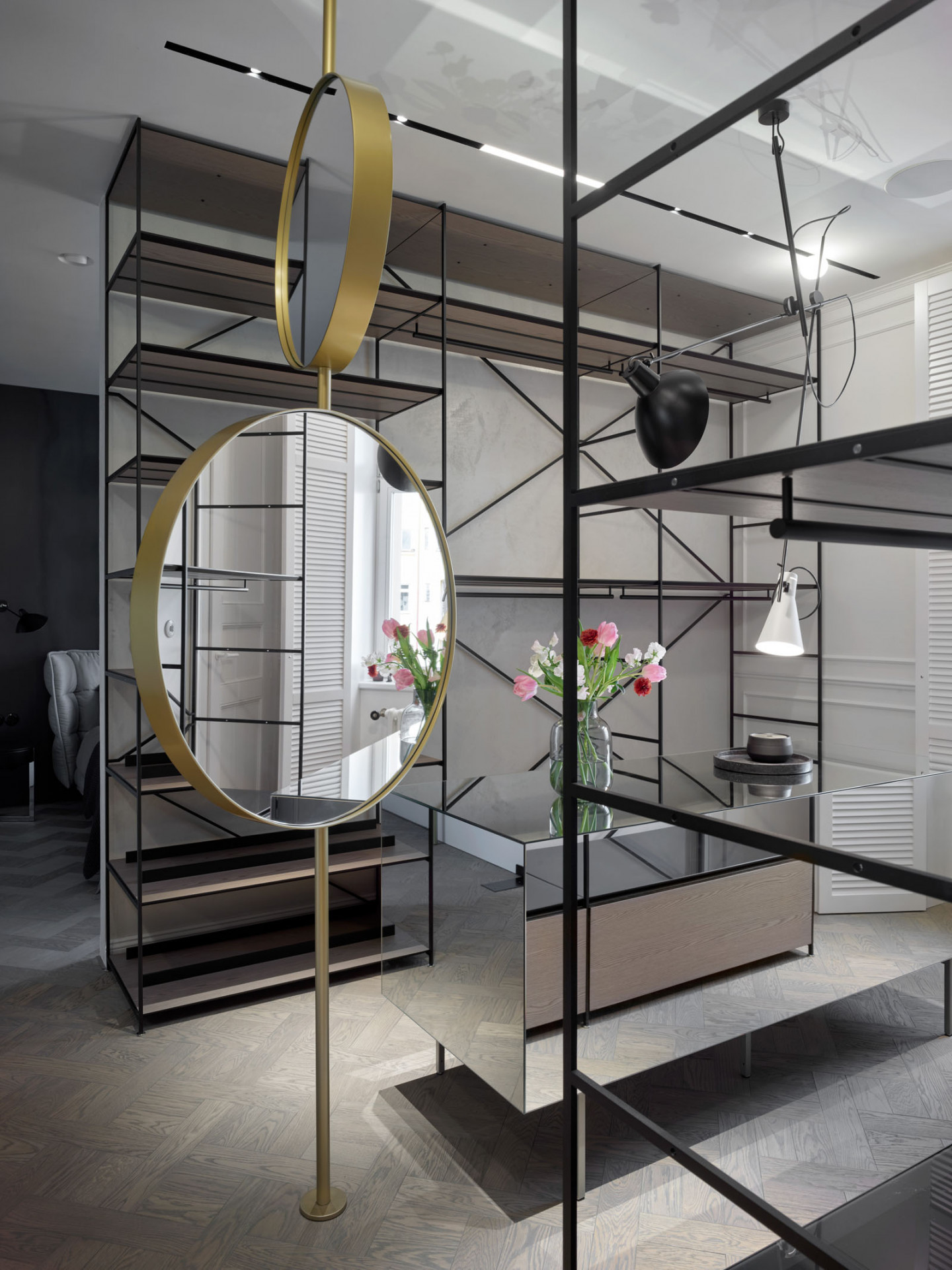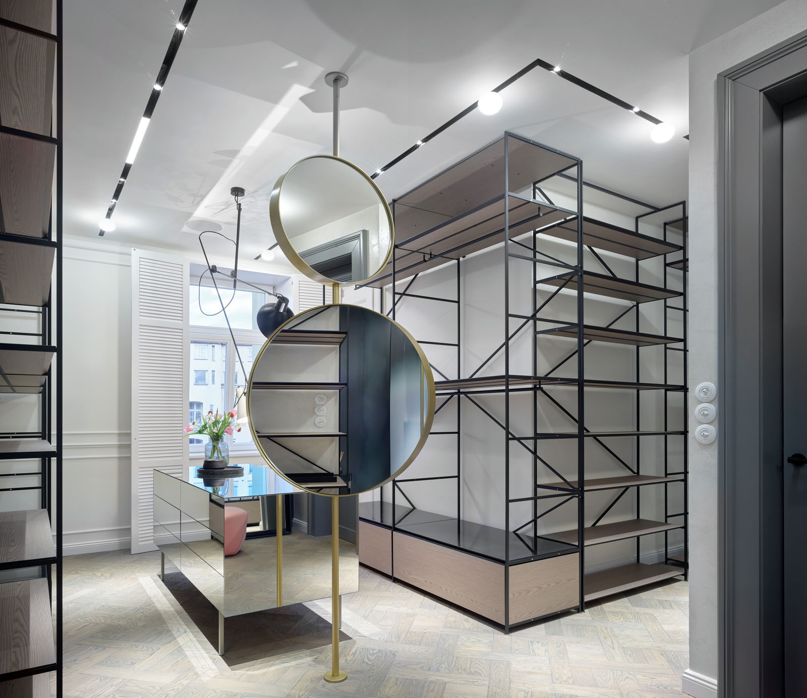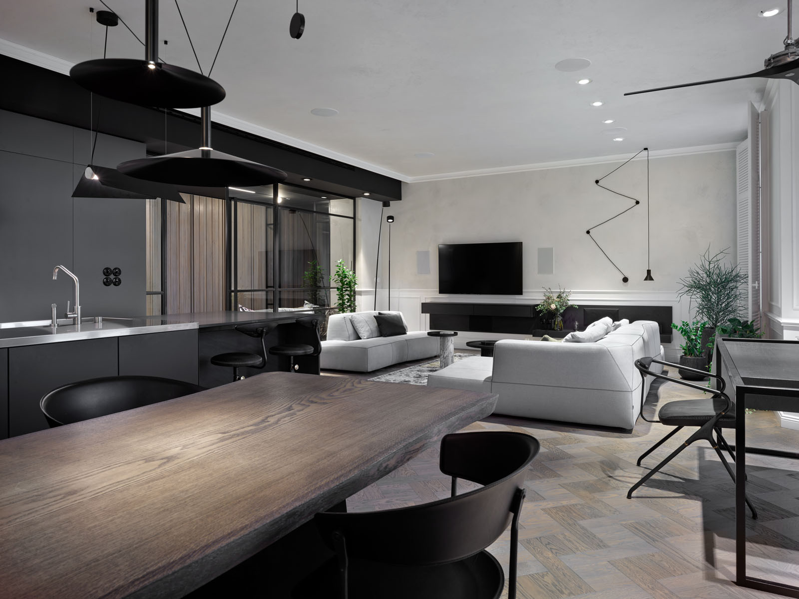 Důraz na svítidla je patrný v každé místnosti. V kuchyni se efektně vyjímá čtveřice nástěnných skleněných svítidel Aura. Hlavní světelnou dominantu však tvoří svítidla z kolekce Milana. Světla od katalánského výrobce Marset zavěšená v bohaté kompozici nad poctivým dubovým stolem, ke kterému se pohodlně vejde až deset strávníků, výrazně dotváří vyznění kuchyně jakožto epicentra celého bytu.