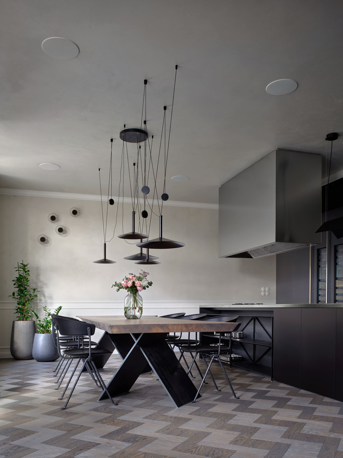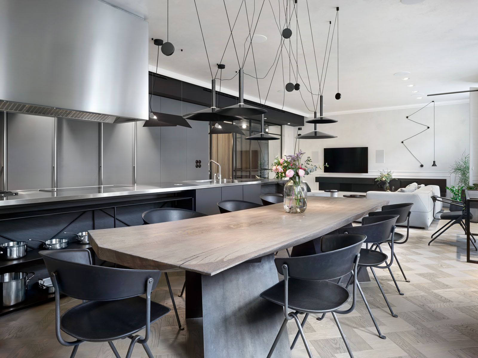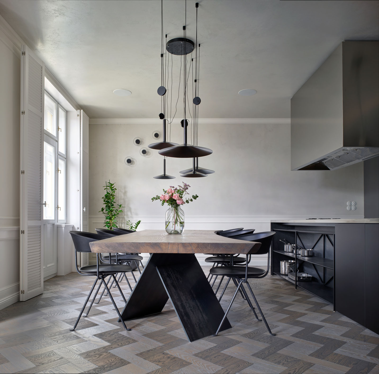 Stabilita versus mobilita. I tak by se dala popsat komunikace středobodů kuchyňského prostoru bytu na Vinohradech. Masivního stolu z jednoho kusu dřeva a svítidel Milana, jejichž podstatou je pohyb. Designér Jaume Ramírez, který za kolekcí stojí, se při její tvorbě inspiroval pohyblivým zdrojem světla. Aby světlům dodal onu výraznou mobilitu, využil modulární systém protizávaží, díky němuž je zavěšenými svítidly možné dokonale hladce pohybovat vertikálním i horizontálním směrem.