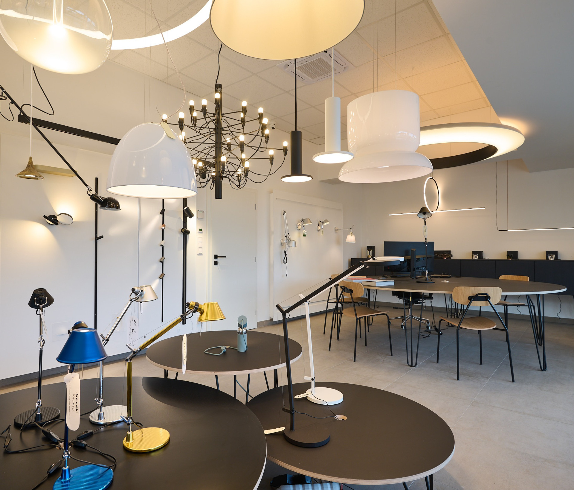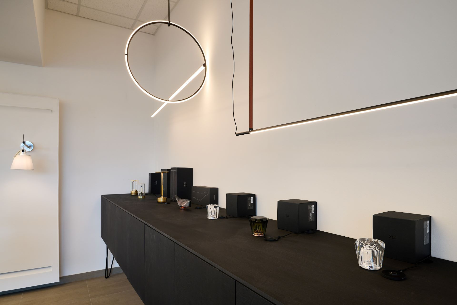 V olomouckém showroomu najdete pečlivě vybraný mix značek jako Flos, Artemide, Slamp, Ambientec, Il Fanale, Pablo nebo Lodes – tedy značky, které kombinují inovace, nadčasovost a estetickou čistotu. Výběr vystavených kousků sahá od ikonických svítidel, jako je nástěnná lampa Flos 265 z roku 1973, přes sérii Tolomeo od Artemide, až po organicky tvarované závěsné světlo navržené Zahou Hadid pro Slamp.