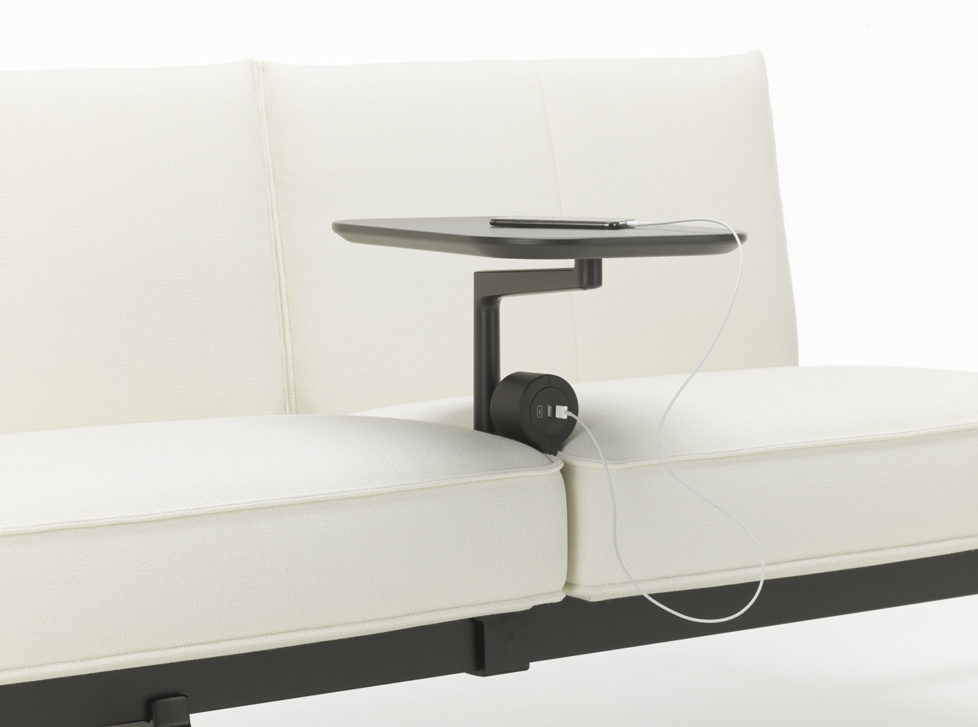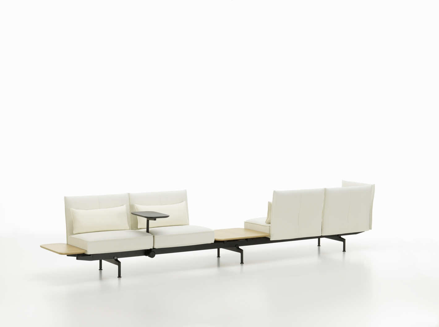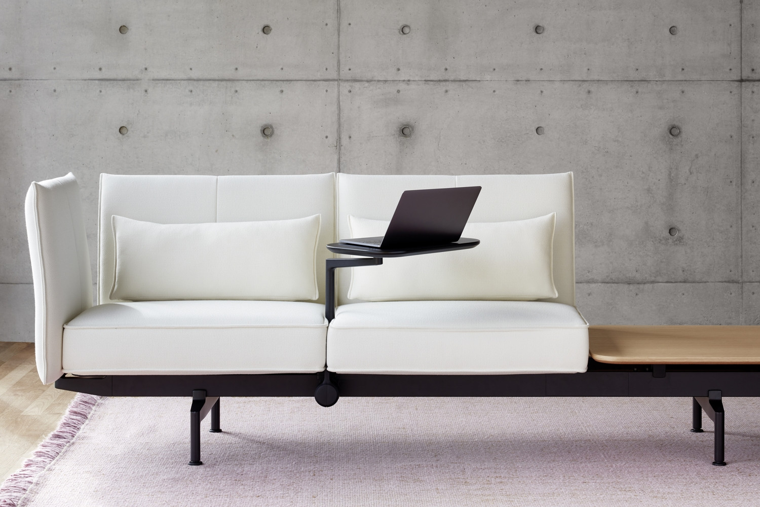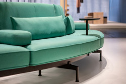 To umožňuje důmyslná konstrukce i technické detaily: stolky na područkách jsou posuvné a uživatelé u nich můžou sedět a pracovat v nejrůznějších pozicích, elektrické zásuvky jsou umístěné mezi polštáři a kvůli pohodlnějšímu použití se dají otočit směrem nahoru, pomocí dělicích panelů se dají vytvořit zóny a klidné, chráněné prostory. Všechny praktické prvky jsou hladce a elegantně začleněné do vizuálně příjemného celku. Pohovka má masivně čalouněné sedáky a flexibilní područky a skýtá pohodlí k práci, a to i po delší dobu.