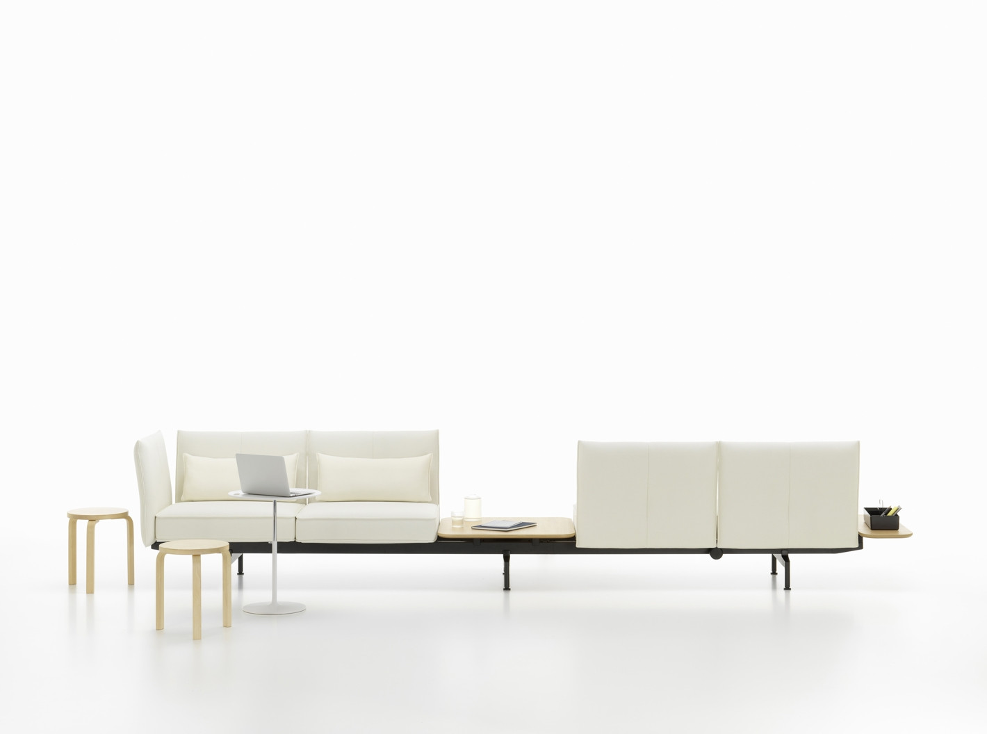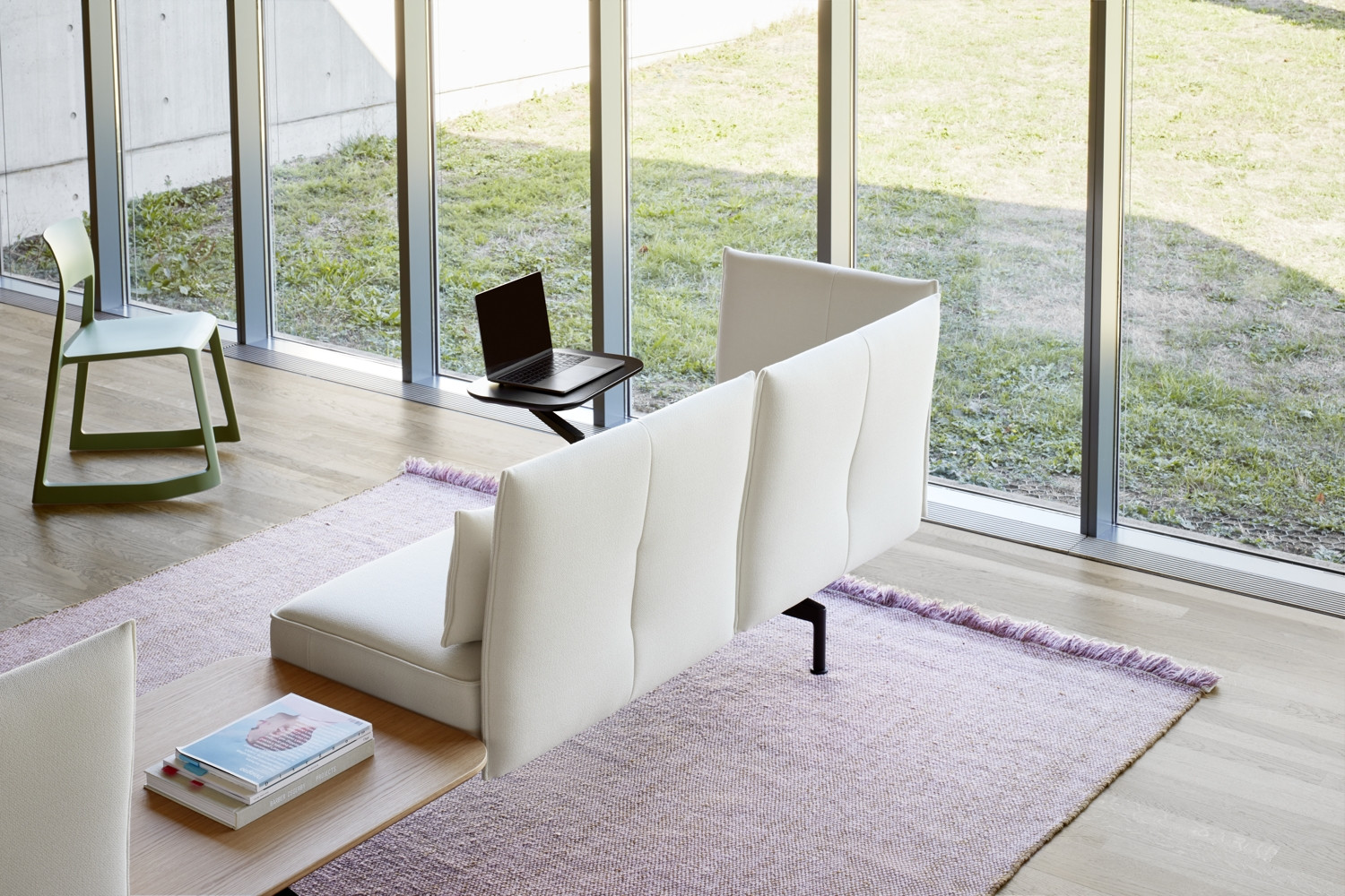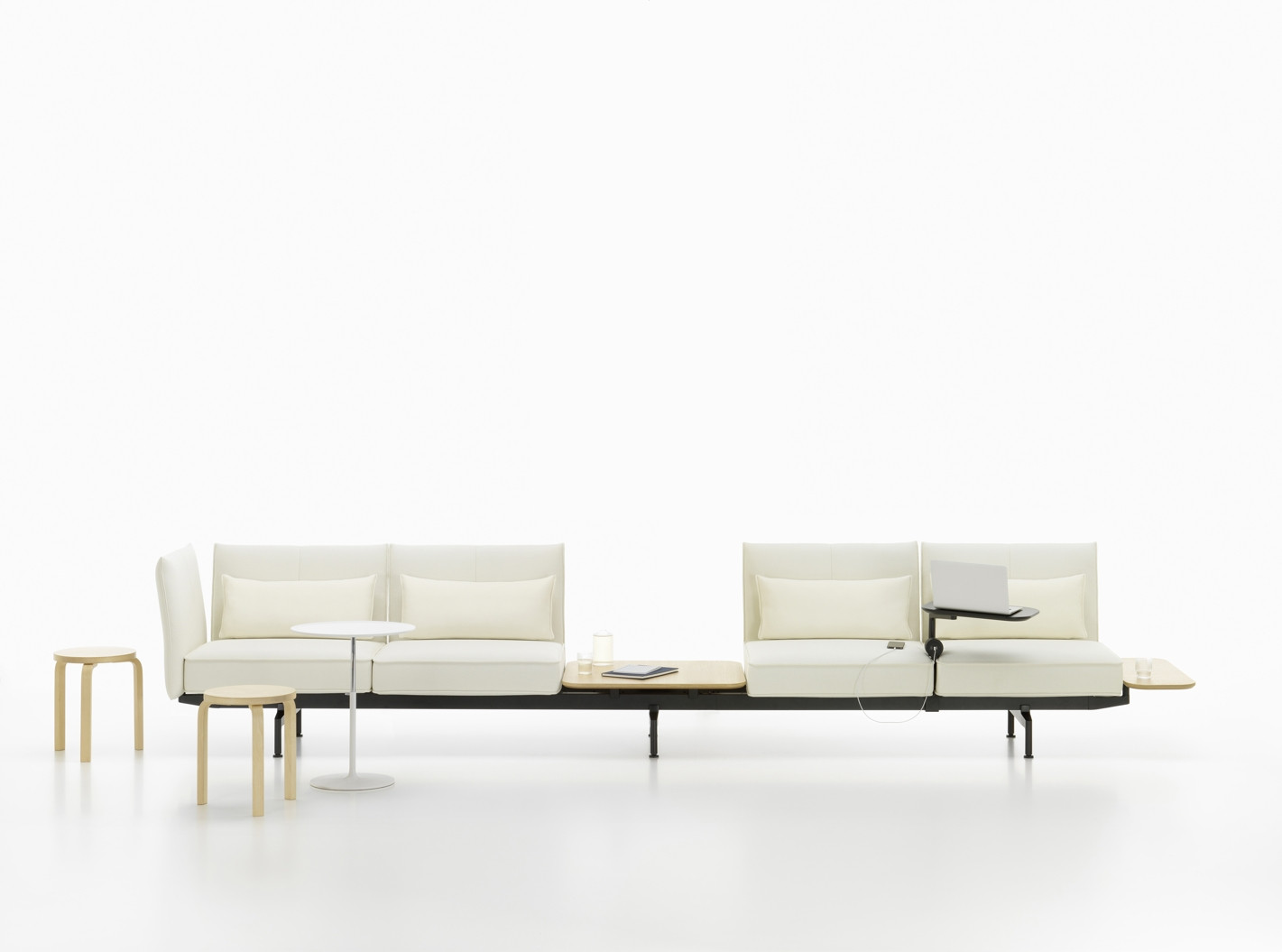 To umožňuje důmyslná konstrukce i technické detaily: stolky na područkách jsou posuvné a uživatelé u nich můžou sedět a pracovat v nejrůznějších pozicích, elektrické zásuvky jsou umístěné mezi polštáři a kvůli pohodlnějšímu použití se dají otočit směrem nahoru, pomocí dělicích panelů se dají vytvořit zóny a klidné, chráněné prostory. Všechny praktické prvky jsou hladce a elegantně začleněné do vizuálně příjemného celku. Pohovka má masivně čalouněné sedáky a flexibilní područky a skýtá pohodlí k práci, a to i po delší dobu.
