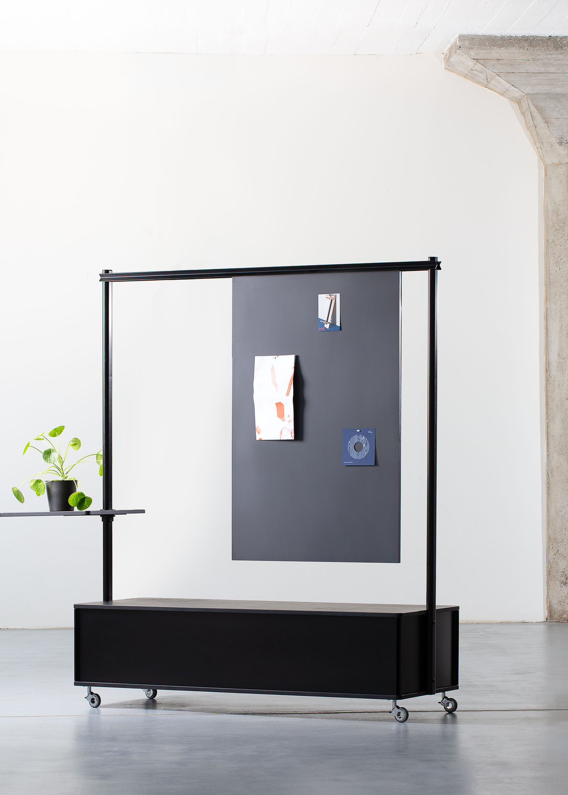 Posledním prvkem kolekce je Box & hrazda, který do prostoru vnáší variabilitu a funkční vrstvení. Box je umístěn na kolečkách, takže jej lze jednoduše přesunout tam, kde je právě potřeba – může sloužit jako úložný prvek, opora pro krátké posezení nebo prostorový předěl. Hrazda rozšiřuje jeho možnosti o další funkce: uchycení světla, nástěnky, akustických prvků či zeleně. Atmosféru kanceláře tak dokáže proměnit během chvilky a reagovat na měnící se dynamiku pracovního dne.
