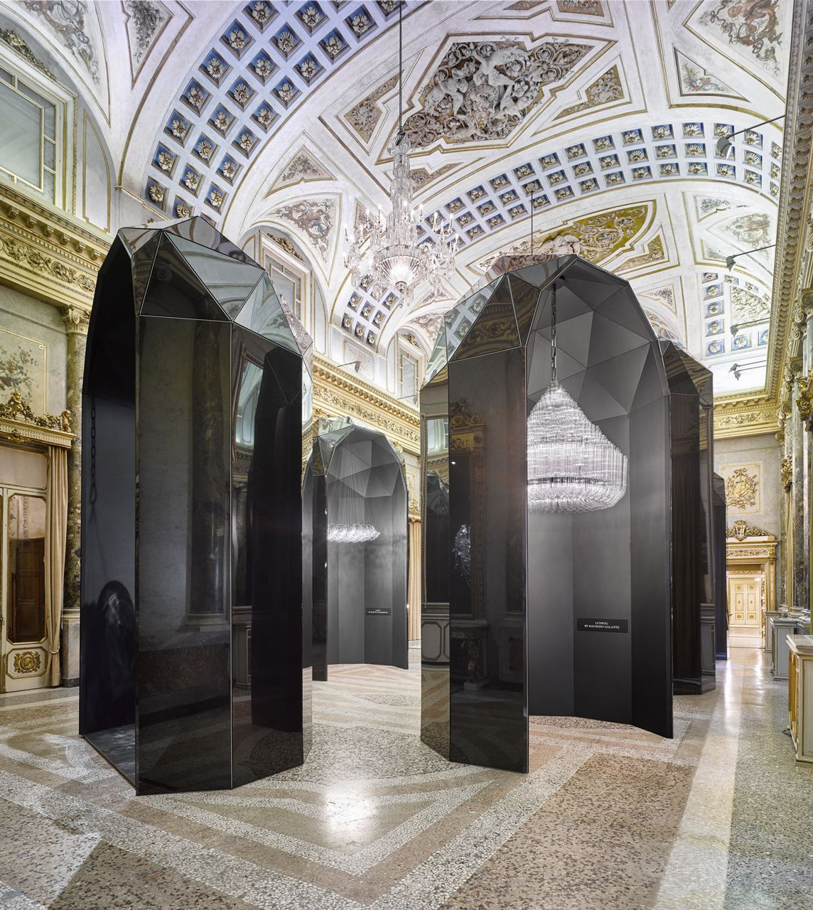 Jejich volné rozmístění po ploše sálu připomíná barokní bál, kde se jednotlivé tajemné postavy ozdobené vzácnými šperky pohybují po tanečním parketu, nezávazně se baví, či se vzhlížejí ve velkoformátových ludvíkovských zrcadlech. Ocelová konstrukce opláštěna černým barrisolem je pojata jako fullerovské geodetické kupole. Ostře řezané plochy asociují příbuznost s tradicí českého broušeného skla, ale i kubistickým tvaroslovím, jehož návaznost na barokní principy je často artikulována.
