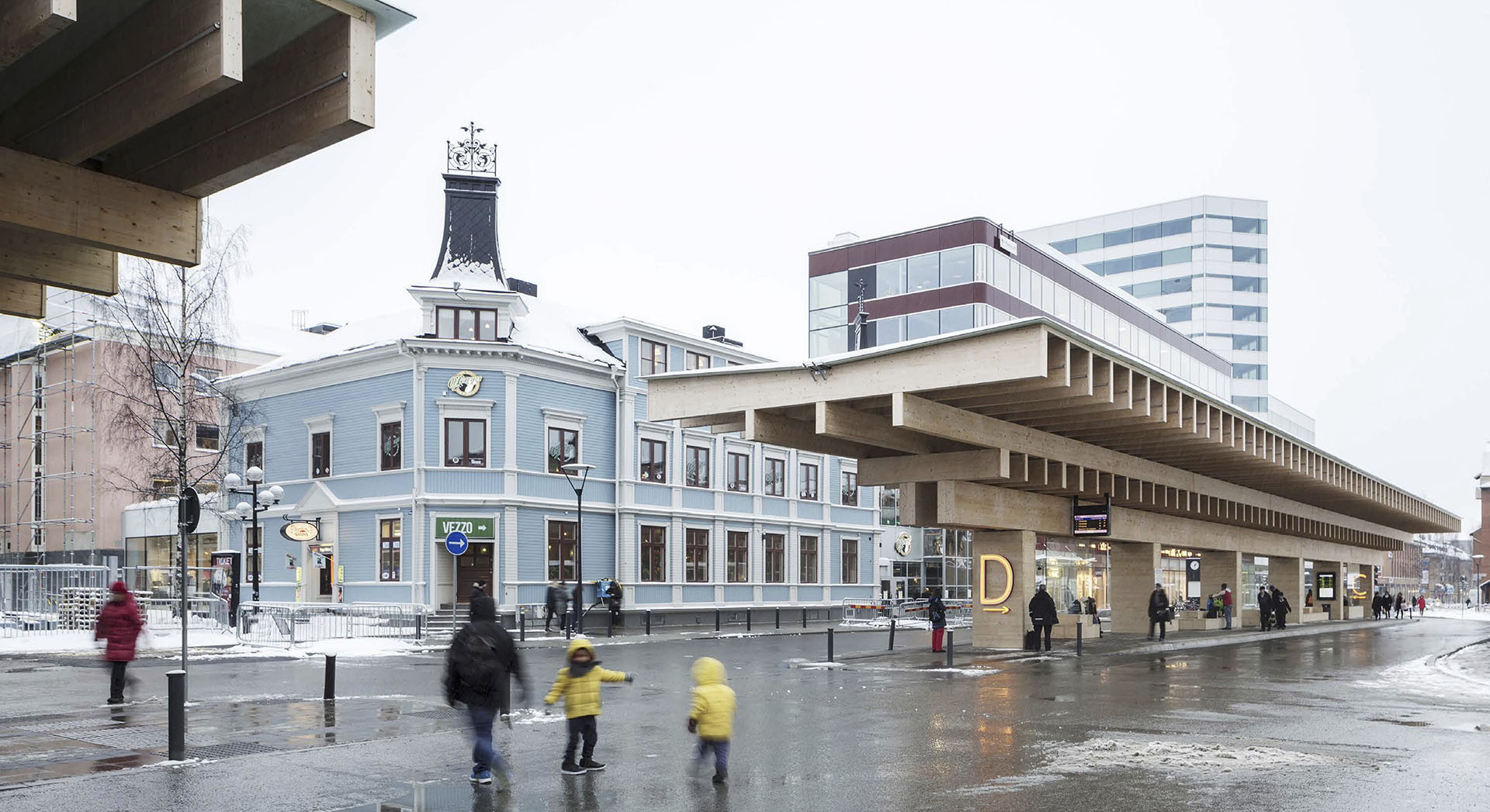 Jak se čeká na autobus mezi závějemi? Ve švédském městě Umeå mají zastávky i nádraží ze dřeva