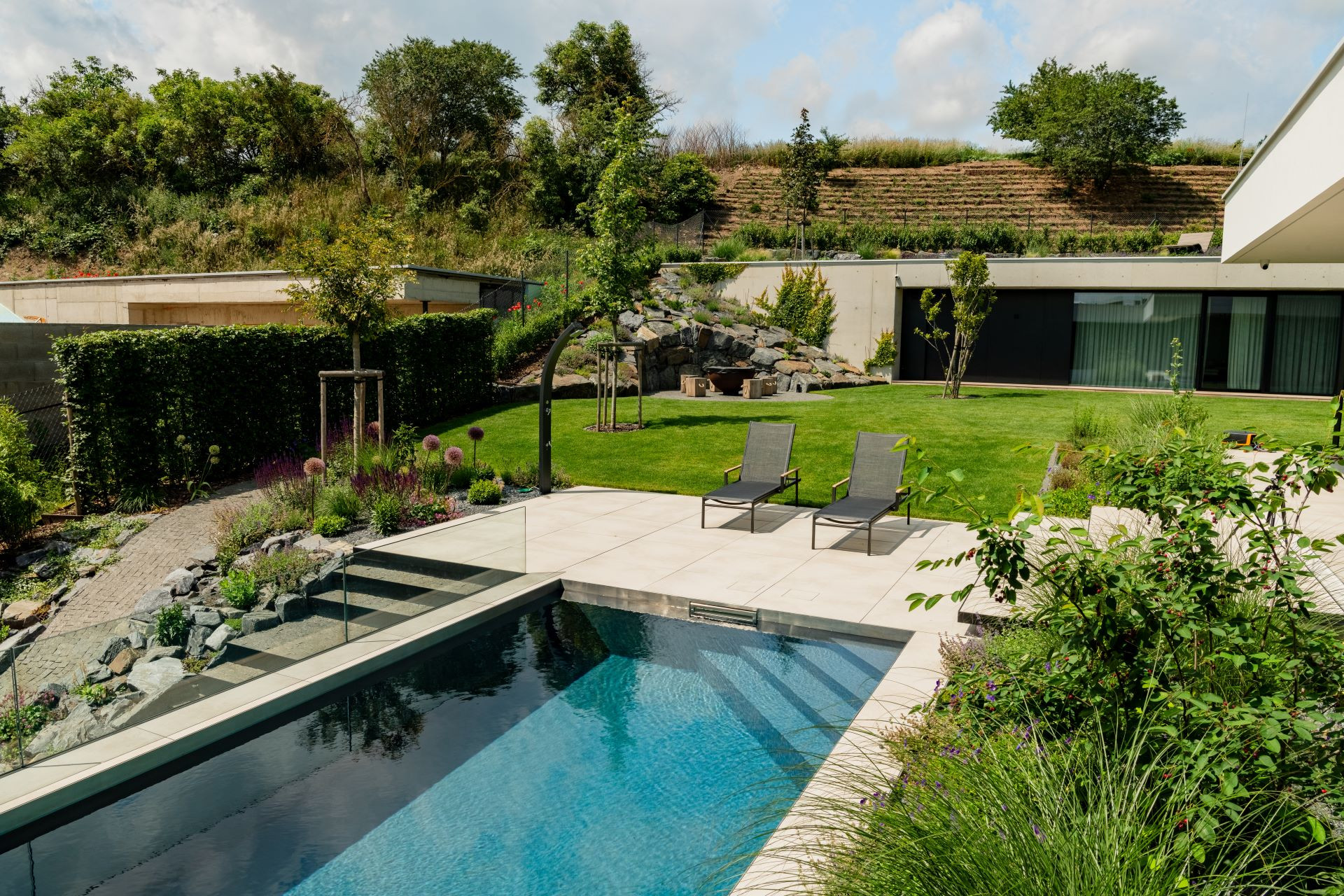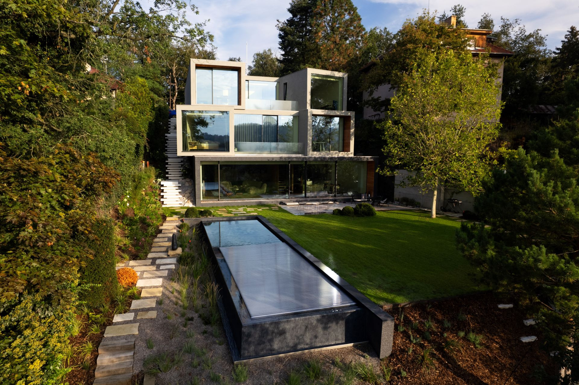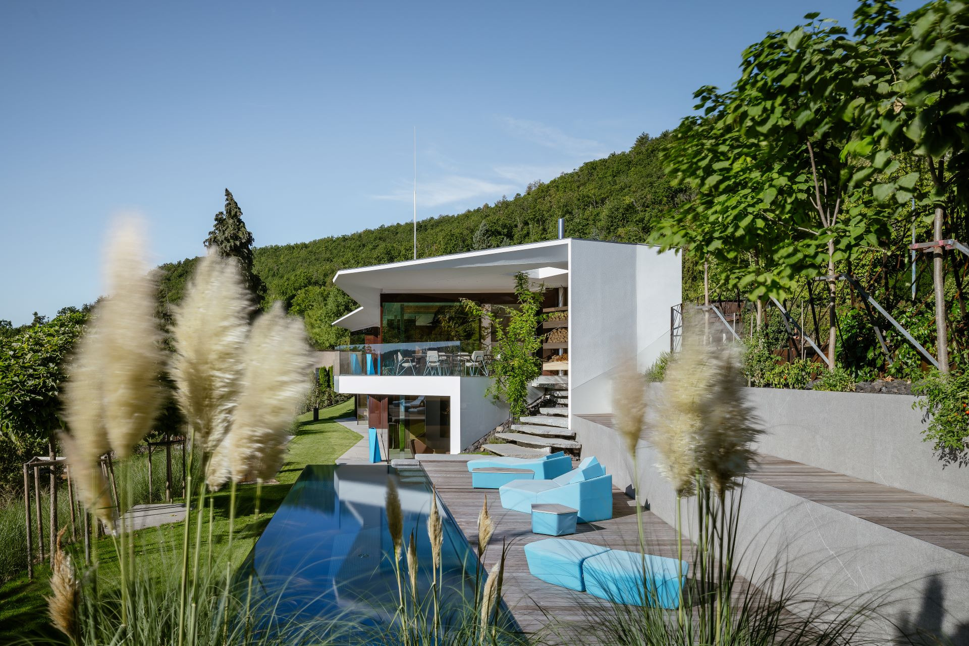 Výstavba betonového bazénu probíhá vždy kompletně na místě realizace ve spolupráci se stavební společností. Betonové bazény nabízejí řadu individuálních řešení, především při volbě obkladu. Vybírat lze z tradičnější keramické mozaiky evokující atmosféru koupališť minulého století, či stále oblíbenější fólie, jejíž výběr se dávno neomezuje jen na odstíny modré. Naopak, i s fólií lze dosáhnout vysoké úrovně designového zpracování. Betonové bazény mohou být skimmerové i přelivné, včetně tzv. infinity pool, jako je bazén, který vznikl pro projekt studia Deyl-Šesták Architekti na videu níže.