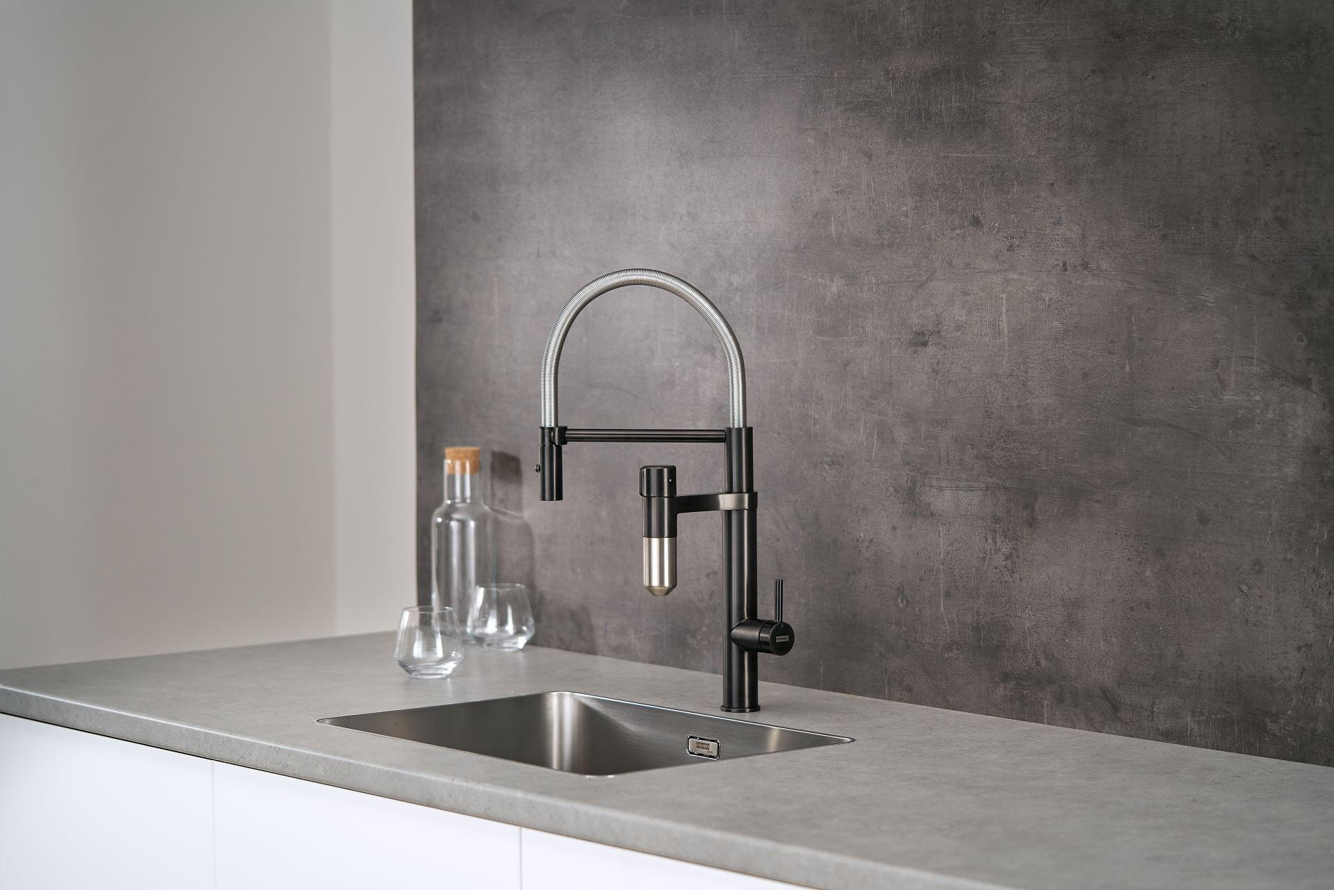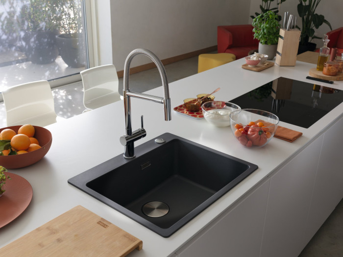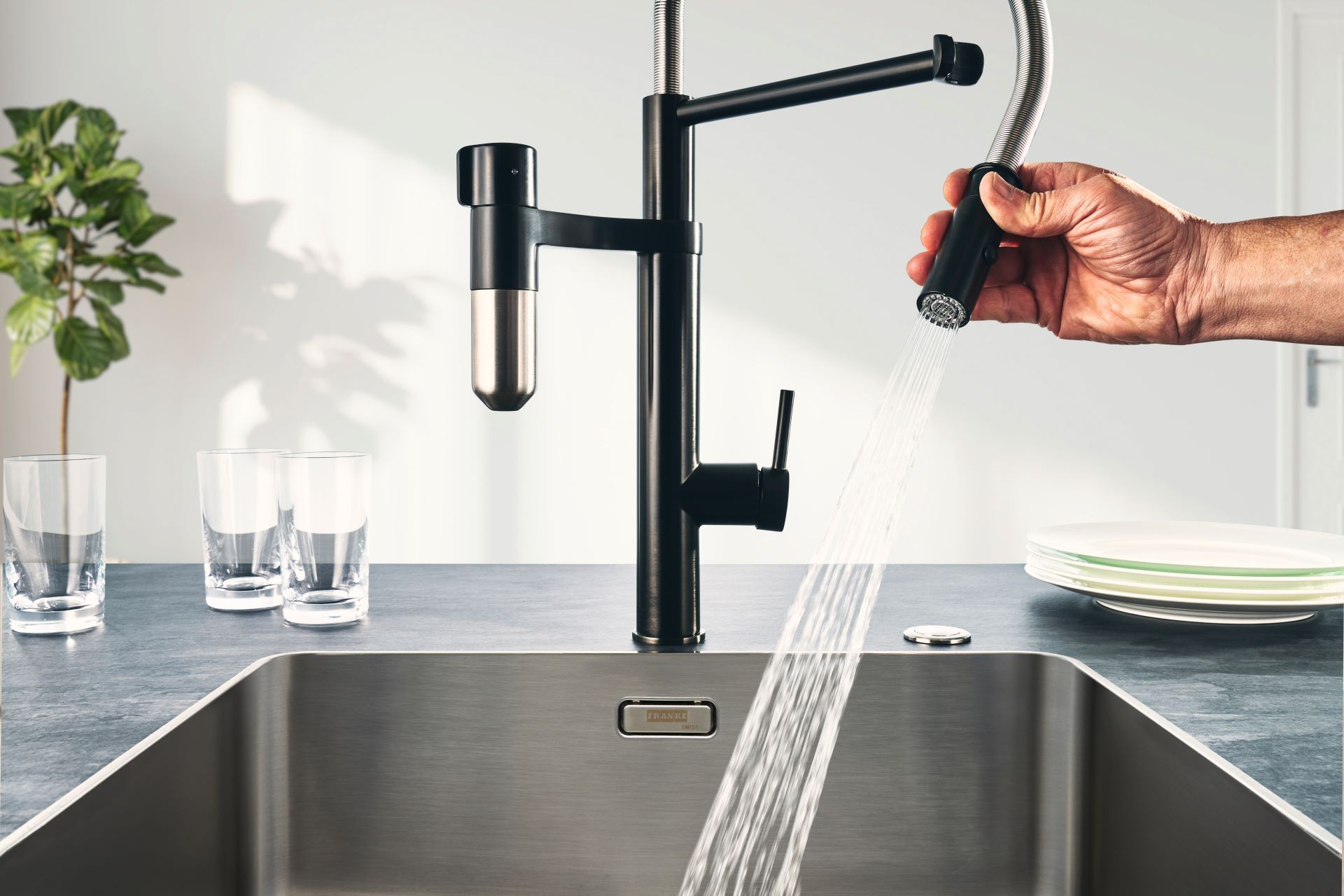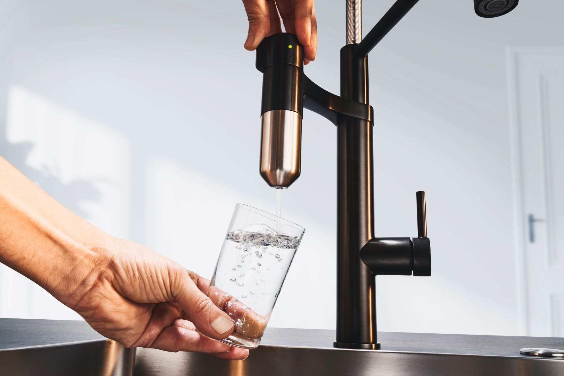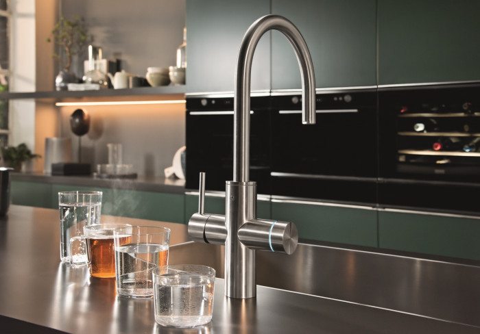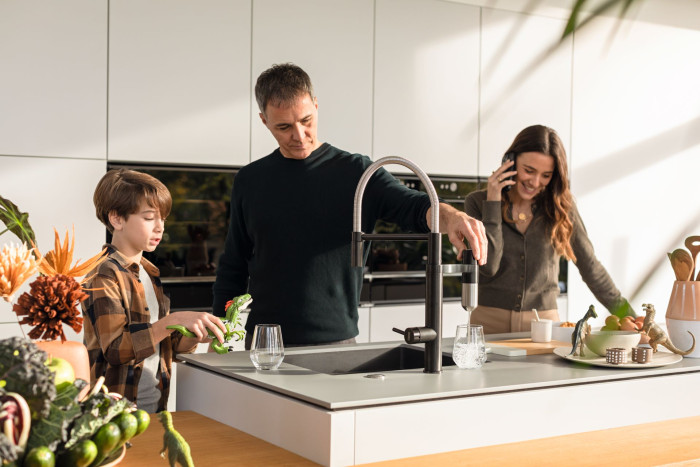 Kombinace filtrační a kuchyňské baterie ve stylovém, aktraktivním a funkčním designu.