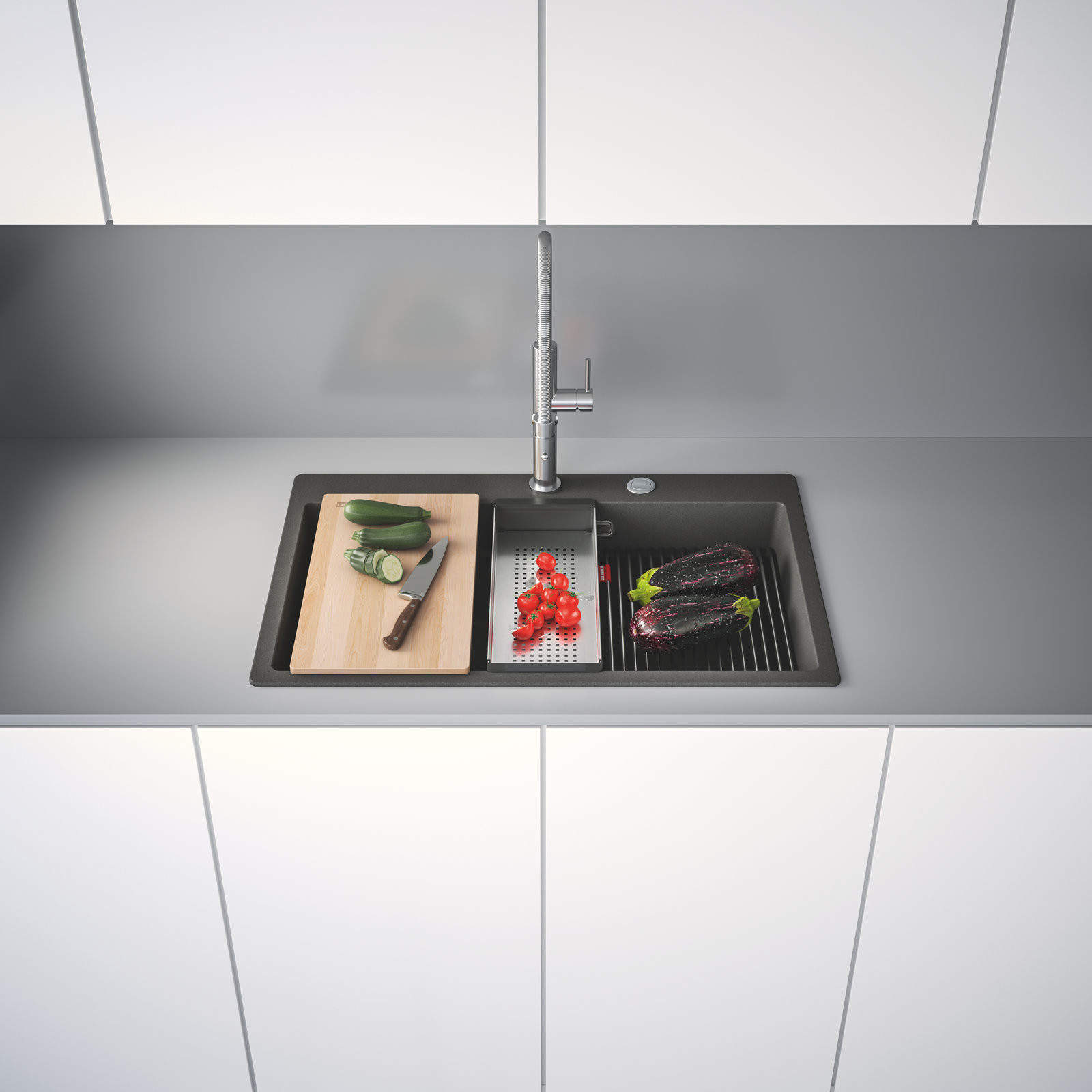 Integrované lišty vytvářejí tři odlišné pracovní úrovně. Dno dřezu je ideální pro úkoly, které vyžadují manévrovací prostor, jako je mytí hrnců a pánví. Jeho hloubka zajišťuje dostatek prostoru pro mytí i velkého nádobí. Umístěním rolovacího roštu na integrovanou lištu vznikne plocha pro odložení/odkapání nádobí nebo žáruvzdorná podložka pro horké nádobí. Na samotný okraj dřezu se umísťuje nerezová odkapávací miska nebo přípravná dřevěná deska, což umožní opláchnout, okapat nebo nakrájet potraviny přímo nad dřezem. Tato promyšlená kombinace praktických funkcí a elegantního designu promění dřez ve skutečně multifunkční pracovní prostor.