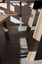 Stůl TAK se vyrábí v několika rozměrových a materiálových variantách. Jeho stabilní podnož kombinuje masivní jasan a černou probarvenou MDF, vrchní deska je ve standardní verzi z LTD s ABS hranou nebo v prémiové variantě z březové překližky s nábytkovým linoleem.