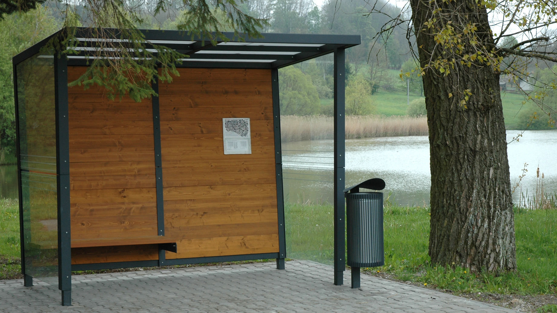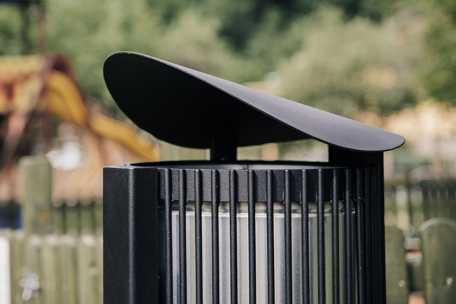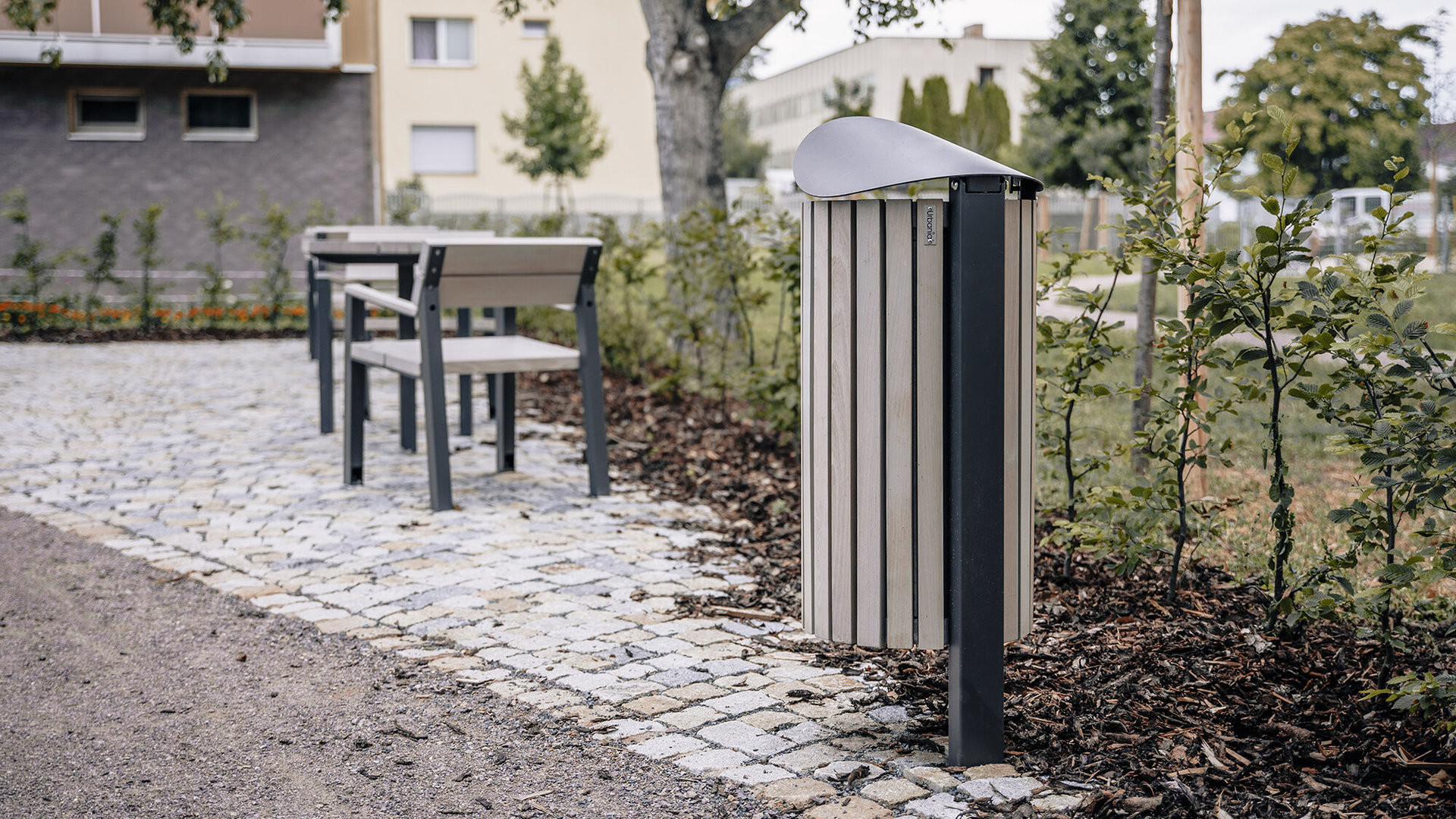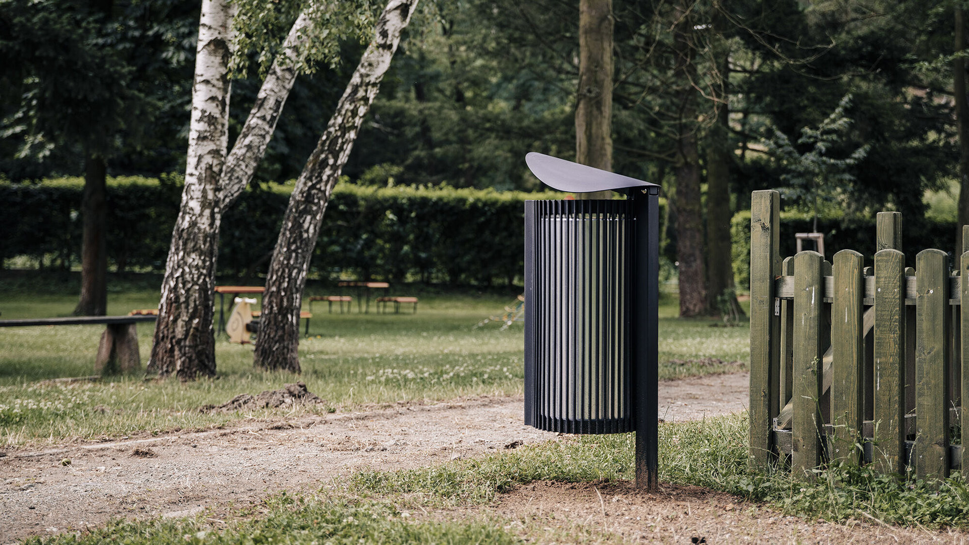 Odpadkový koš Tubo kombinuje ikonický tvar stříšky s funkční konstrukcí na jedné noze. Tento 50 litrový koš je možné vybavit popelníkem či držákem na sáčky a vyrábí se s dřevěnými latěmi nebo celokovový.