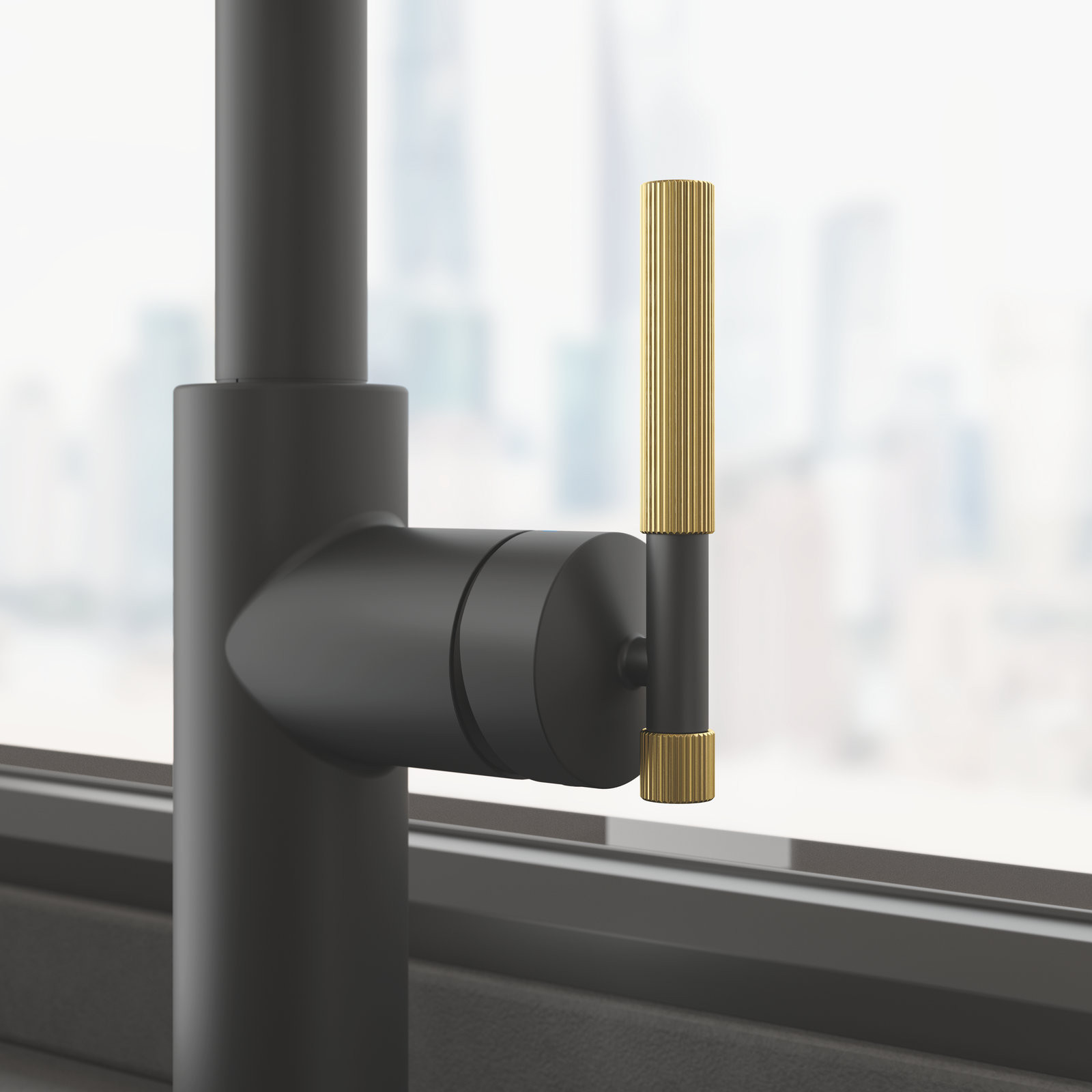 Výrazné matné černé tělo baterie doplňují elegantní akcenty – koncovka sprchové hadice a boční páčka – oboje v provedení PVD zlatá nebo PVD měděná, zdobené výraznými texturovanými pruhy.