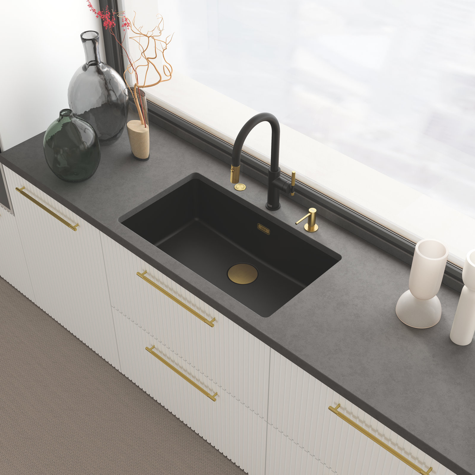 Pro jedinečnou eleganci kuchyně. Ideální je ve spojení s dalšími prvky v provedení PVD, jako je např. dávkovač saponátu, krytka ventilu či skrytý přepad. Sladěním těchto komponentů vznikne unikátní sofistikovaný vzhled prostoru dřezu.