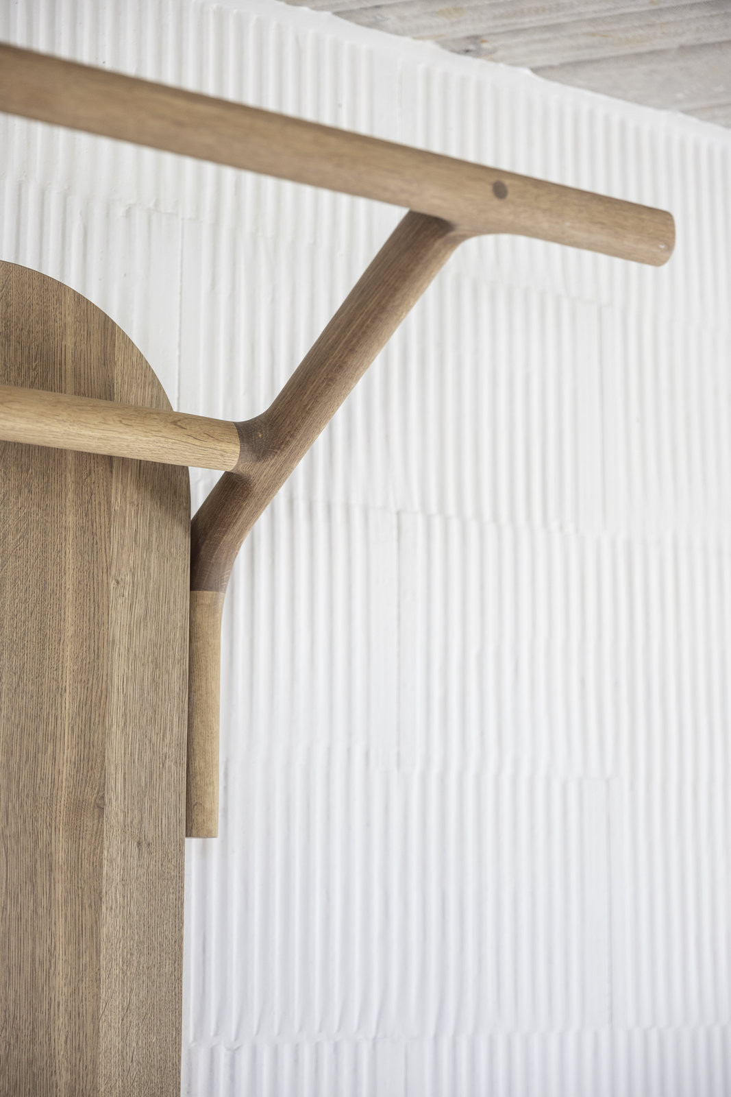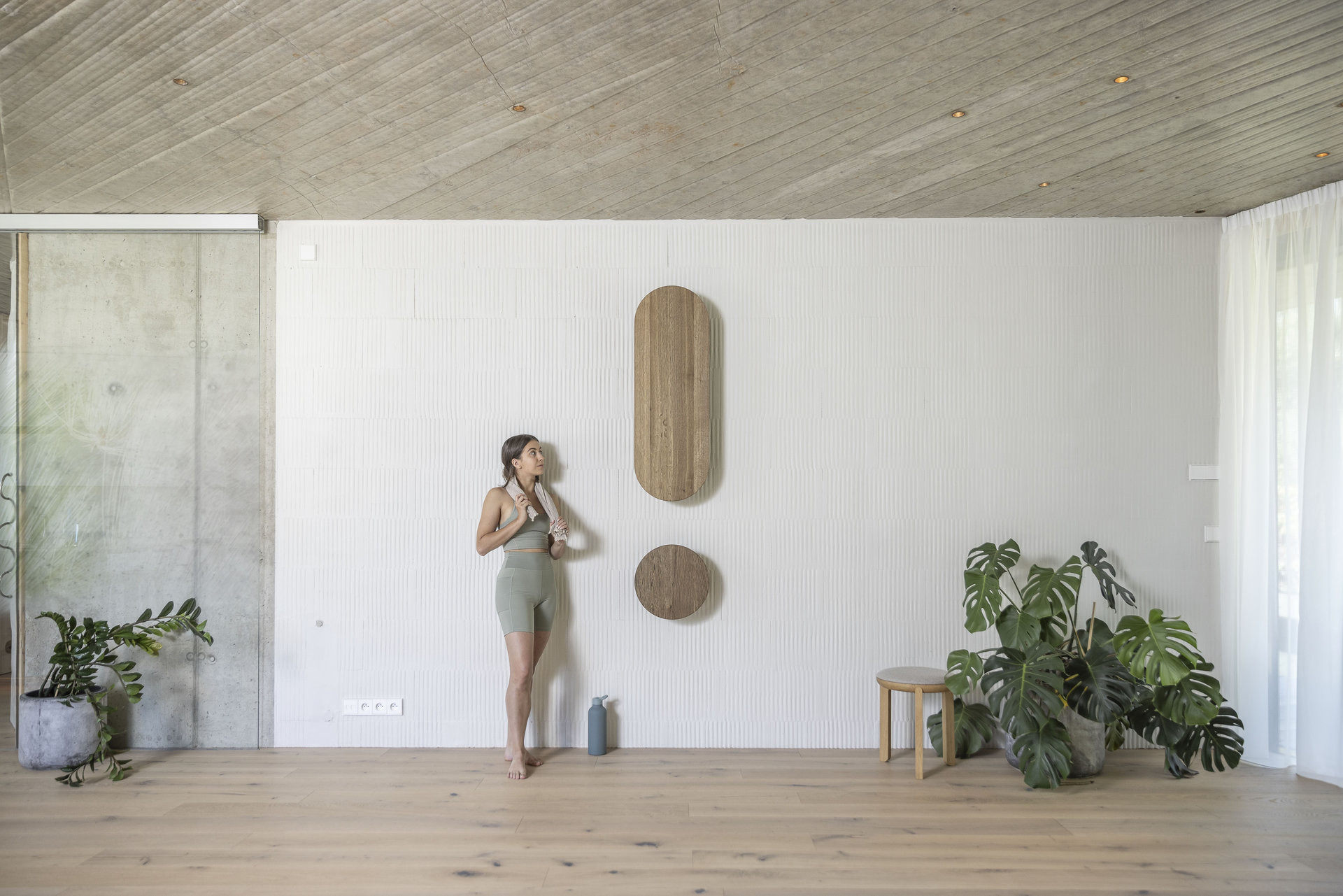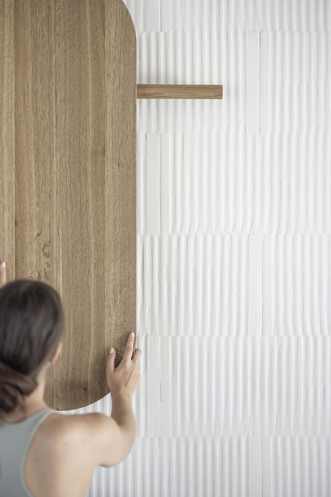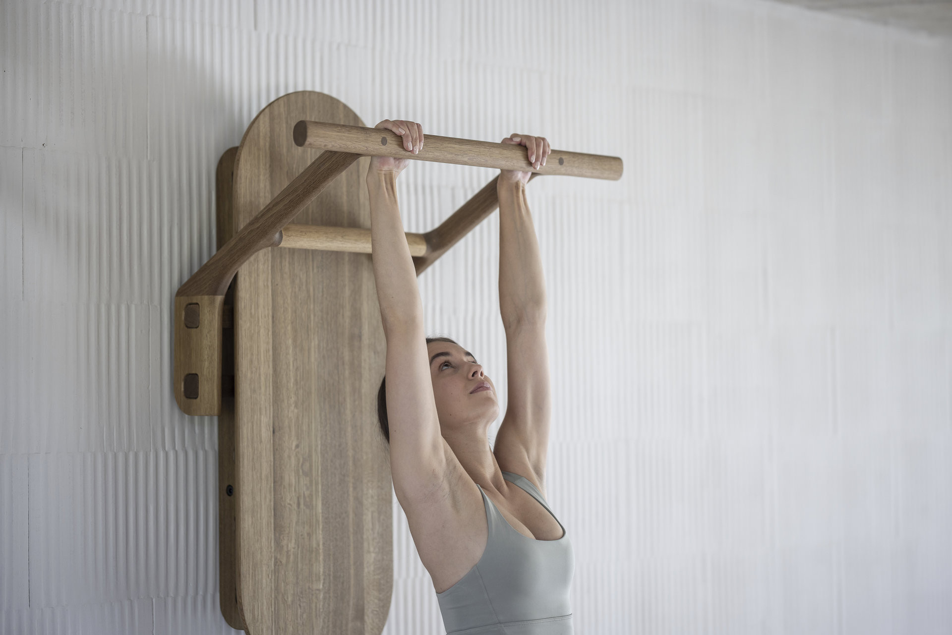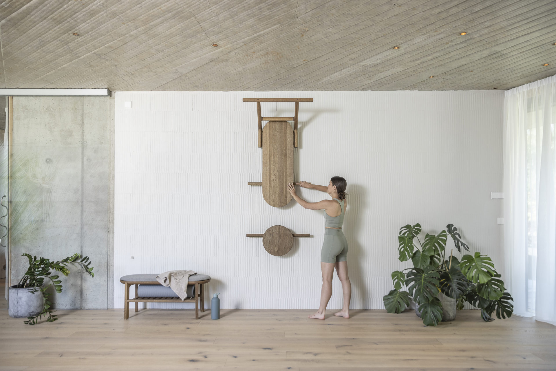 Základní součástí SANA GYM SETU je nástěnná hrazda s opěrnou deskou a dvě modulární hrazdy SANA Basic Bars, které umožňují variabilní cvičební režimy pro horní i dolní část těla. Konstrukce skrývá kovové jádro pro vysokou nosnost, zatímco dřevěné prvky zajišťují estetickou integraci do interiéru. Magnetické uchycení umožňuje kompaktní stav při nepoužívání.