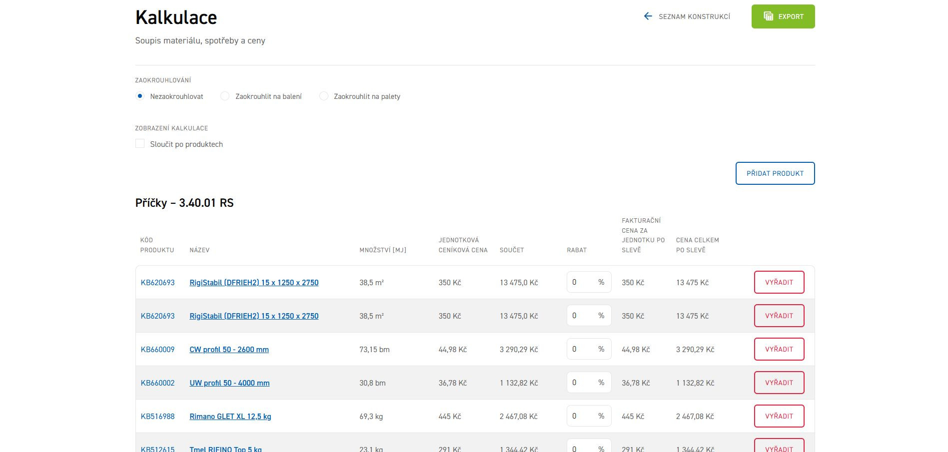 Odborný online nástroj Profikalkulátor Rigips, určený pro realizační firmy a projektanty, umožňuje přesný výpočet množství materiálu pro sádrokartonové konstrukce. Tento nástroj pracuje na principu zadaných vstupních parametrů a automaticky generuje optimální skladbu materiálů.