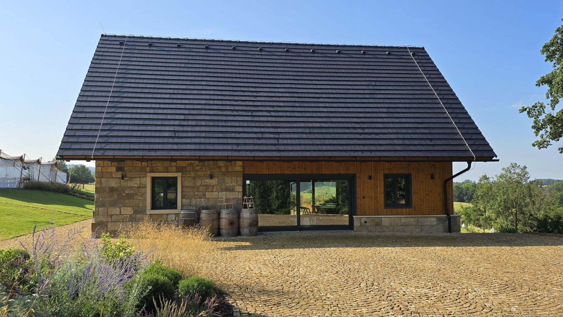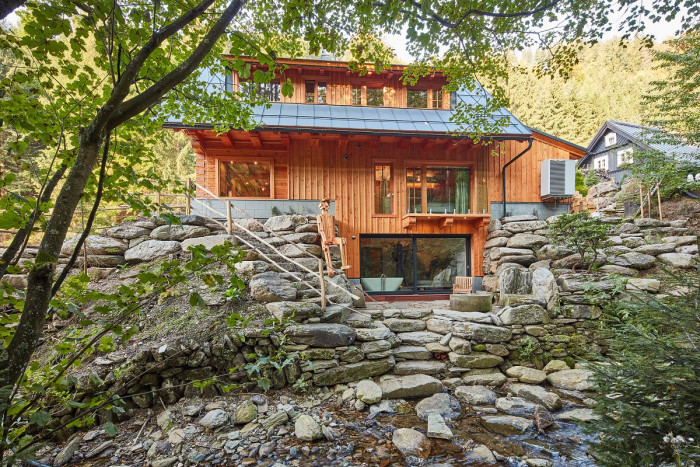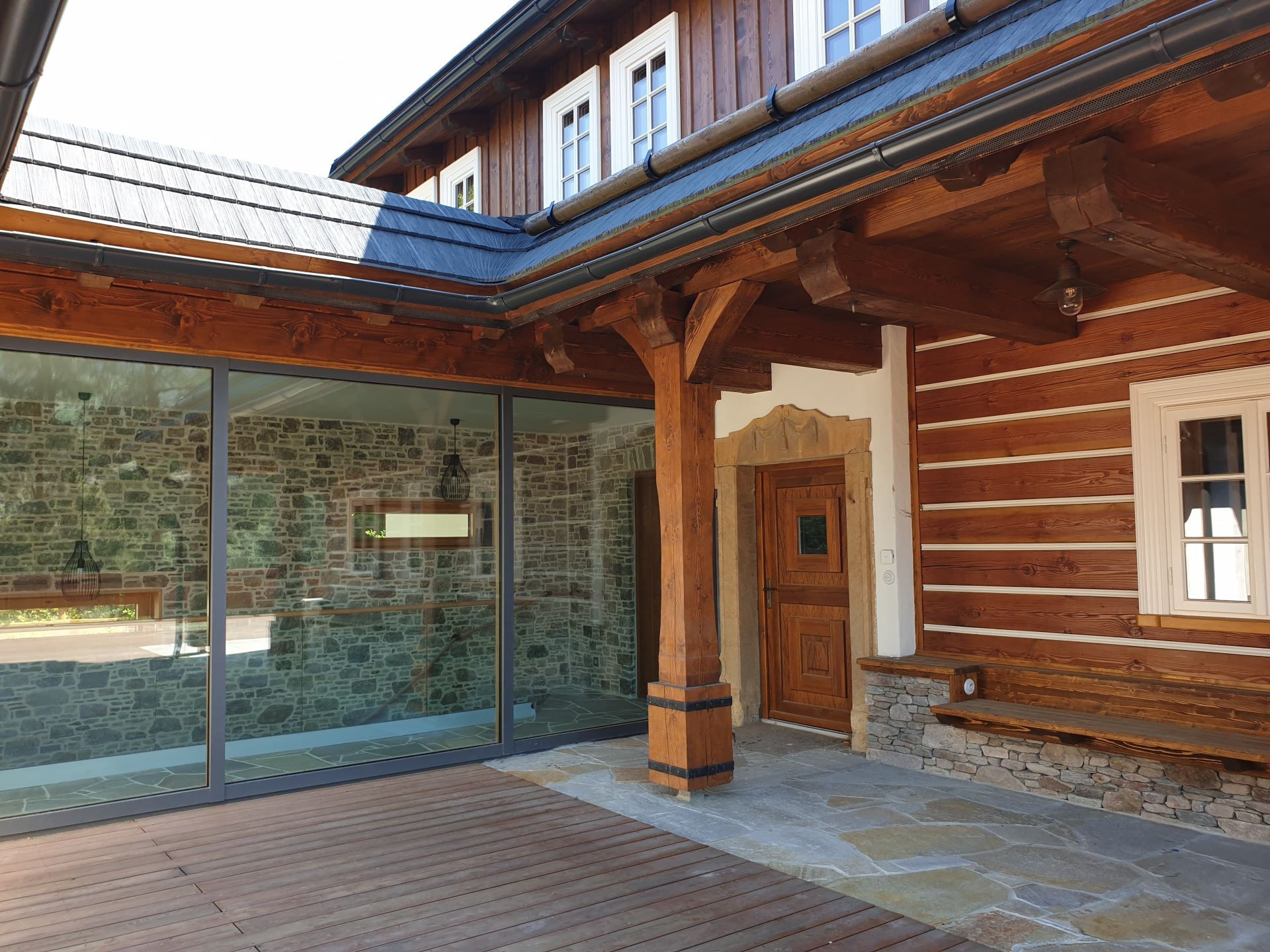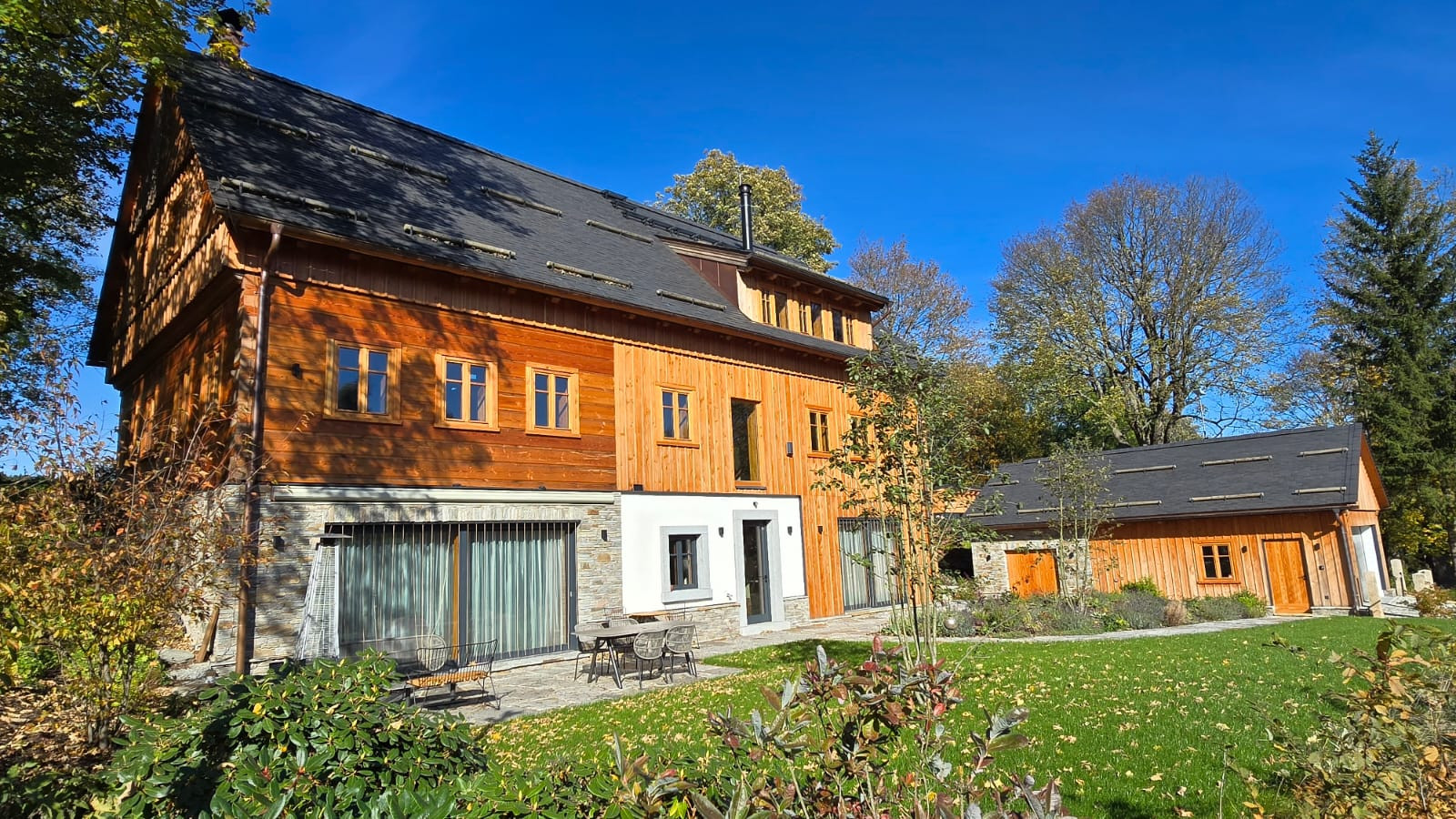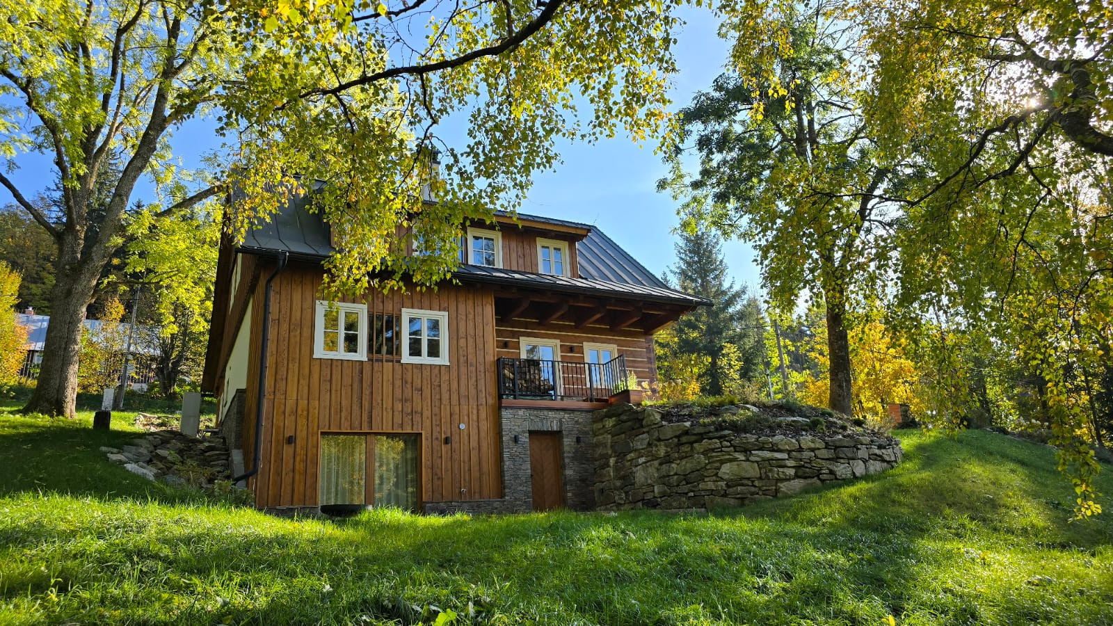 Roubenky s velkými okny a prosklením představují harmonické spojení přírodních materiálů a moderních technologií.