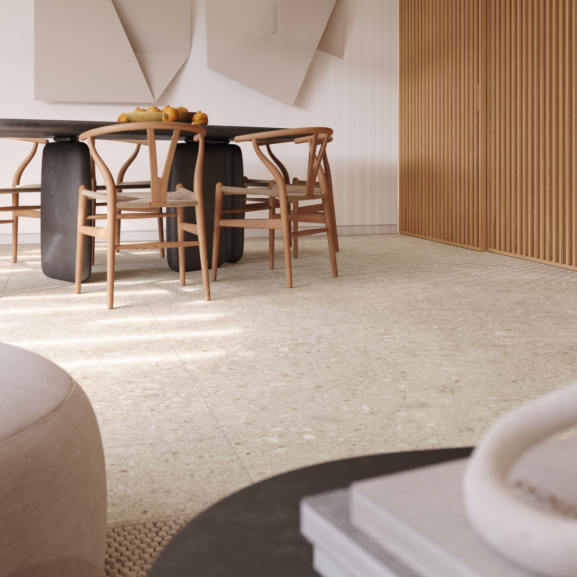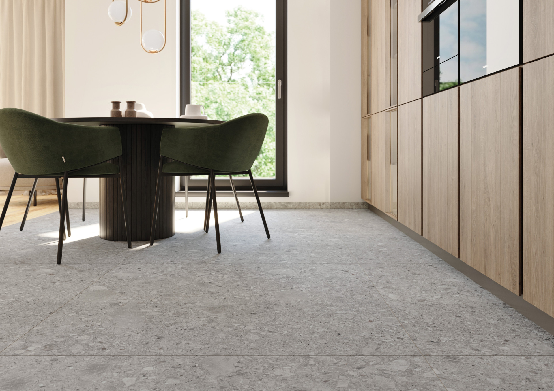 Na první pohled může RAVE (RAKO) připomínat terazzo, její základ ale tvoří struktura složená z různě velkých oblázků zasazených do šedého podkladu. Právě tato nepravidelná kresba dodává povrchu výraznou hloubku a přirozený, lehce surový charakter.