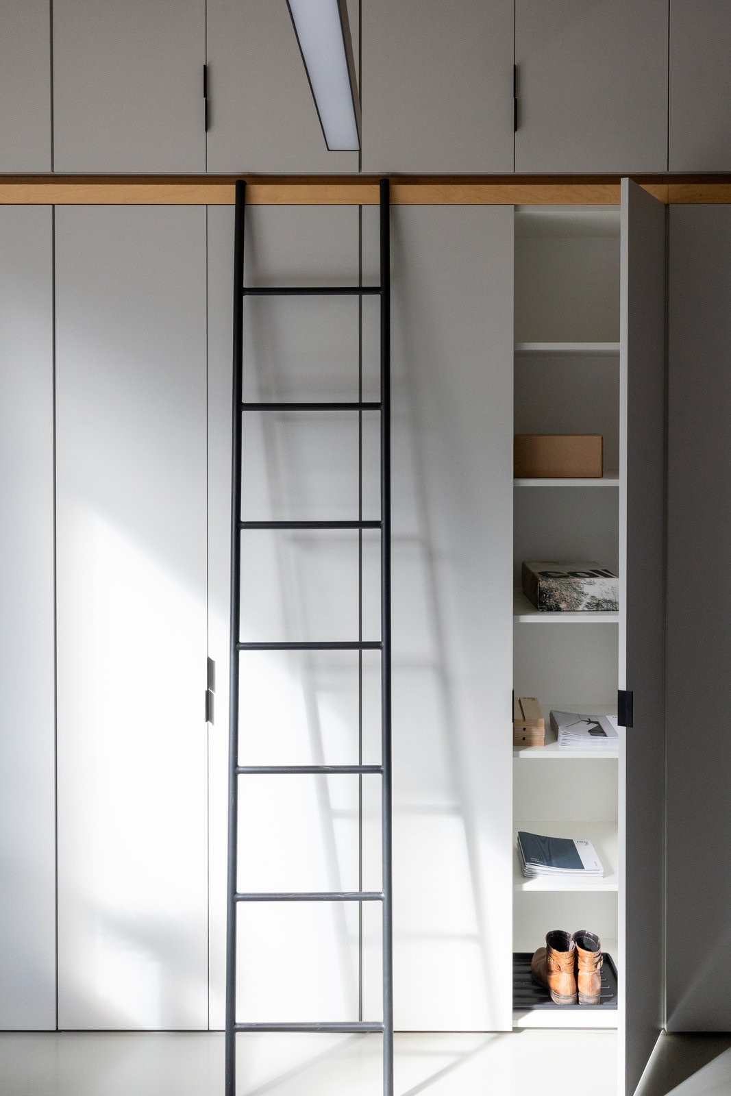 Modulární skříňový systém s možností závěsného žebříku. Minimalismus, který funguje ve velkém i v detailu.