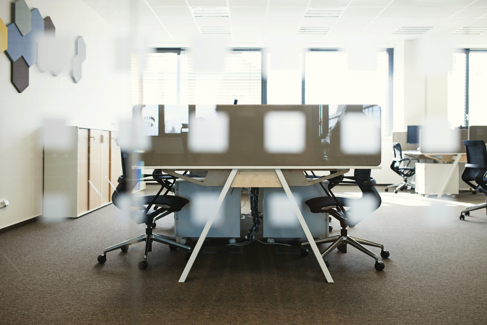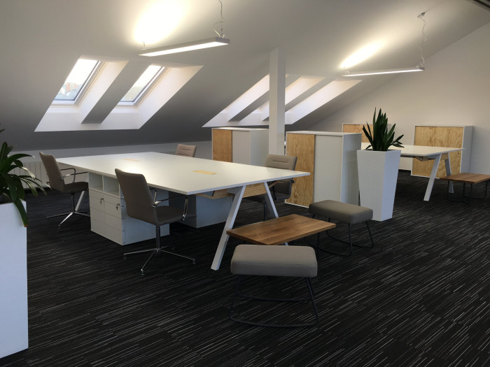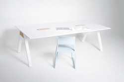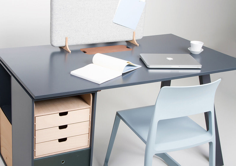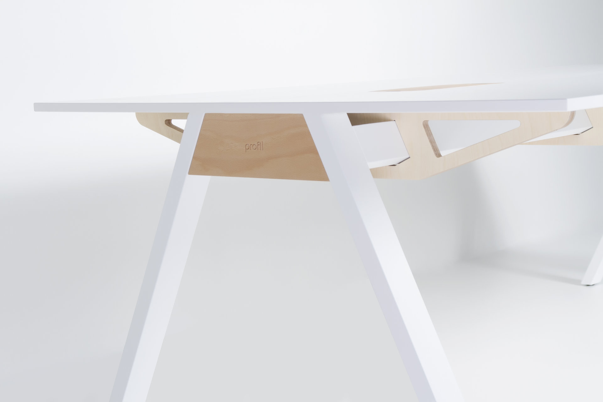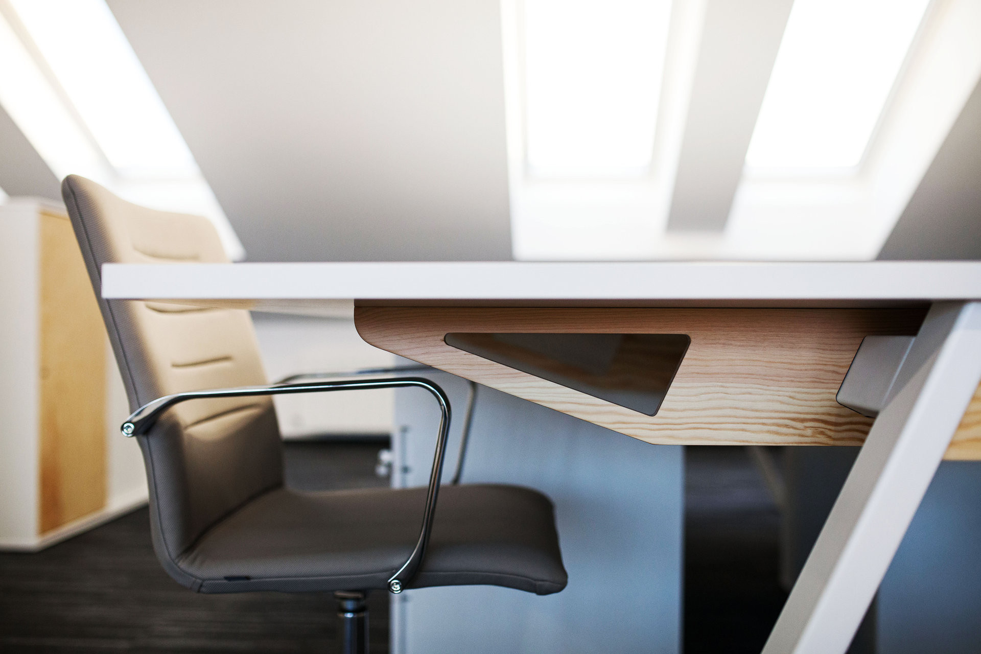 Základem je subtilní, ale pevná konstrukce tvořená ocelovými nohami a frézovanými překližkovými žebry, která nese pracovní desku s precizně zapuštěnou průchodkou z březové překližky. Ta zajišťuje snadný přístup k elektroinstalaci, vedené v tunelu po celé délce stolu, a zároveň zachovává čistý, ničím nerušený dojem.