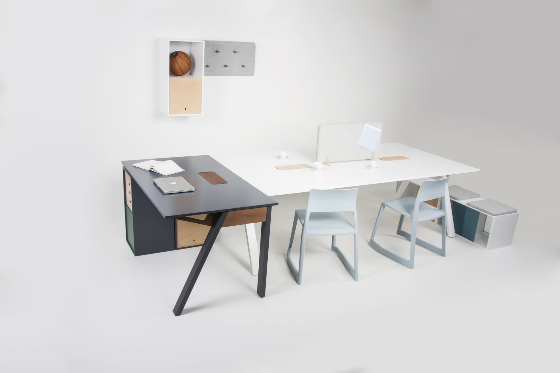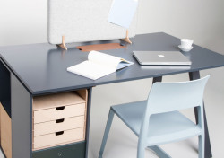 Modulární systém umožňuje navrhnout stůl přesně podle interiéru, ať už jako ústřední místo pro týmové porady, nebo pracovní stanici v menším měřítku. Stůl se díky svým proporcím a výběru materiálů přirozeně začlení jak do kreativního ateliéru, tak do sofistikovaného zázemí vedení firmy.
