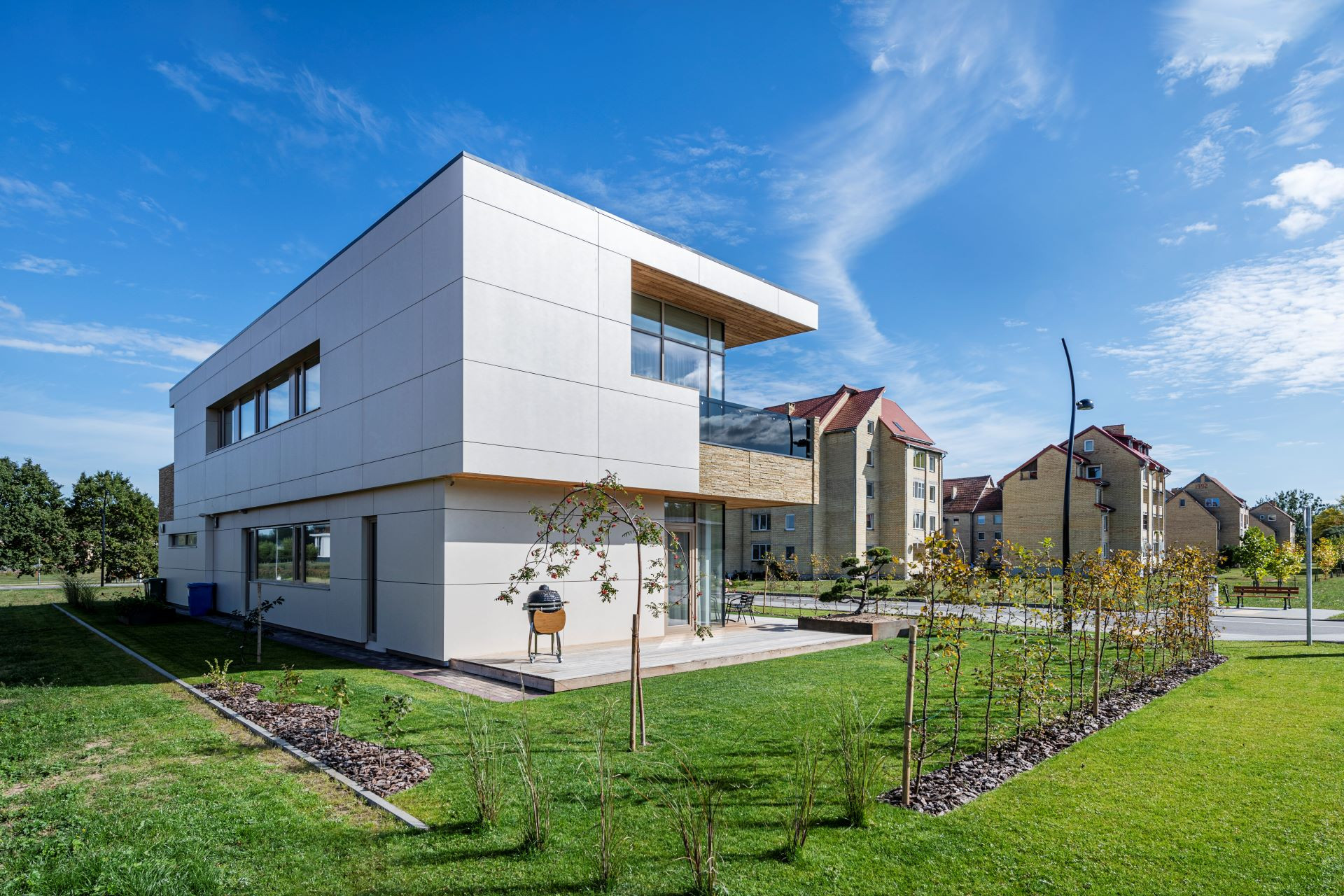 Obytná budova Sandy Cuboid v Birštonasu v Litvě, na jejíž fasádě je z velké části použito obložení panely Swisspearl Largo Reflex v béžovém odstínu.
