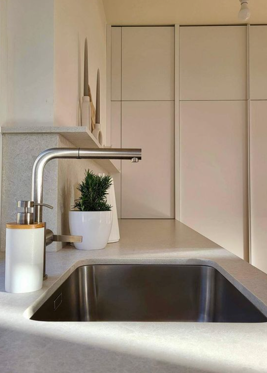 Noble Quartzite je tvrzený kámen ve světle šedém odstínu se sametovou texturou a jemným žilkováním podtrhující minimalistickou estetiku interiéru.