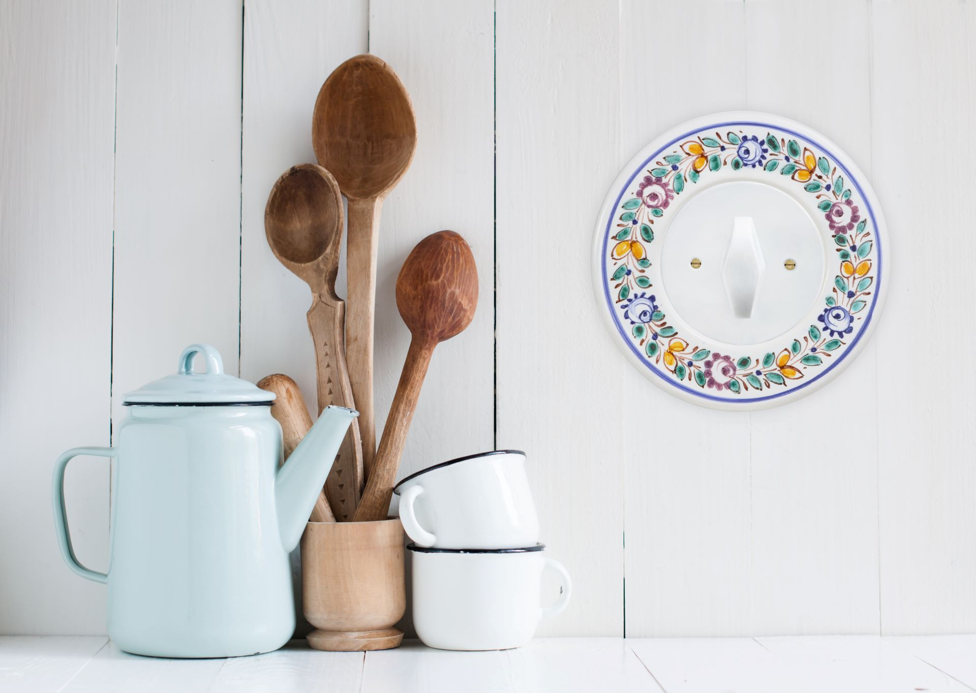 Kulatý rámeček vypínačů a zásuvek RETRO je nabízen ve dvou základních materiálech, které opisují dřívější styl – dřevo a keramika. Bílé keramické rámečky přitom nabízí i zcela jedinečné provedení s ručně malovanými motivy inspirovanými folklórními vzory. K dostání jsou hned čtyři tradiční habánské vzory.