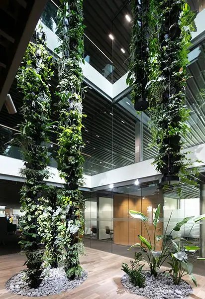 Zelené stěny a rostlinné sloupy představují elegantní způsob, jak vnést přírodu i do prostor, kde na ni obvykle nezbývá místo. Jsou ideálním prvkem pro moderní interiéry – od kancelářských budov a hotelů po veřejné prostory či rezidenční projekty.