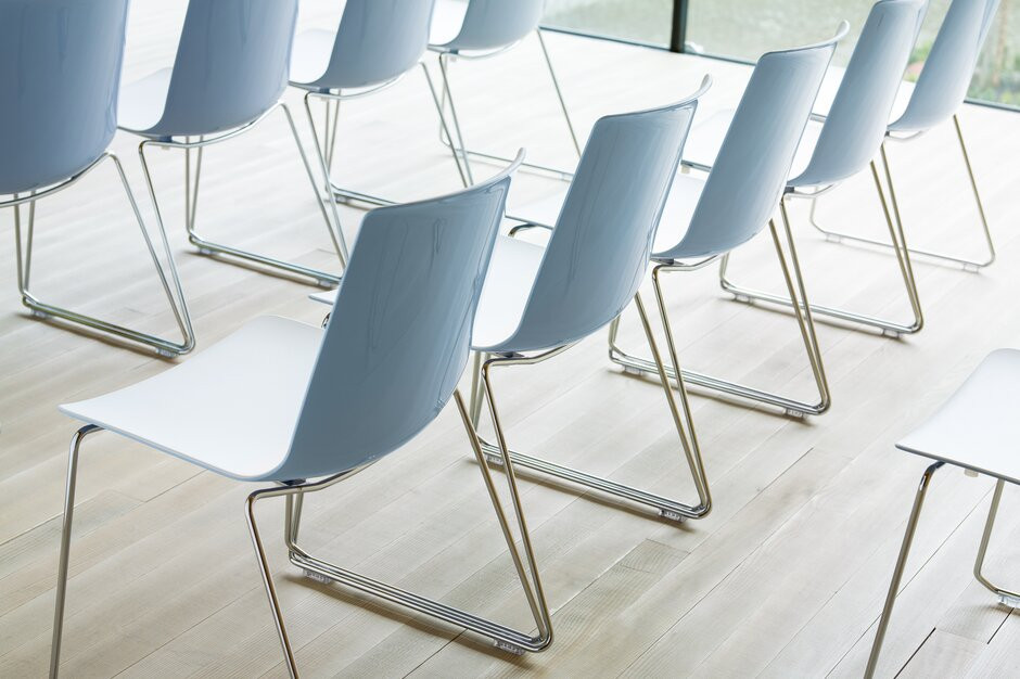 Židle s rámovou podnoží: Kompaktní a stohovatelná, vhodná pro víceúčelové prostory a semináře.