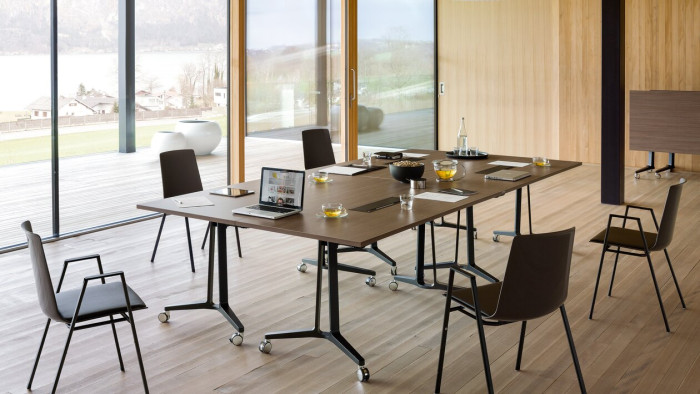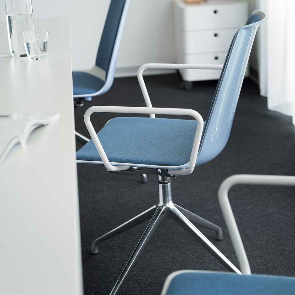 Konferenční židle: Rotační 4-ramenná podnož, područky z trubkové oceli, stacionární nebo mobilní na kolečkách.