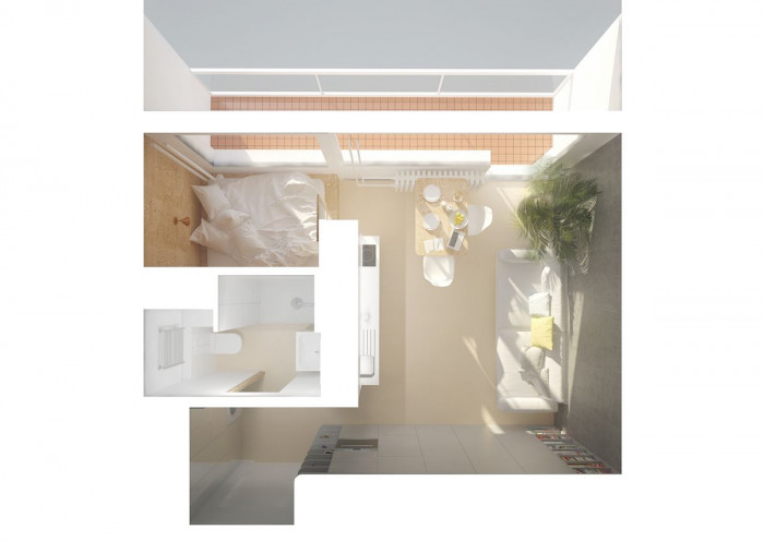 Při řešení malometrážních bytů je důležité zachovat dostatek volné plochy pro vyžití obyvatel. Mezi osvědčené postupy 0,5 Studia pro přestavby podobných bytů patří: sjednocení podlahy, použití jednotných materiálů a navržení vestavěného nábytku. Základem je sdružování několika funkcí do jednotných bloků.
