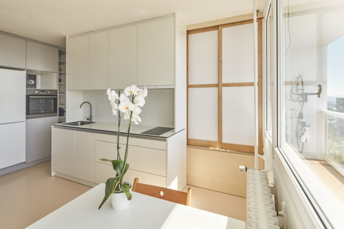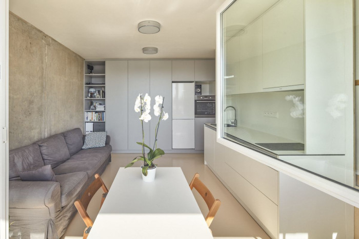 V obytném prostoru se spojují dvě funkce – vaření a trávení volného času. Pro nové uspořádání bytu bylo nutné na základě požadavku investora změnit původní umístění kuchyně. Nová vestavěná kuchyňská linka je utilitární a zároveň odpovídá prostorovým potřebám pro přípravu jídla. Součástí obytného prostoru je také sedačka a jídelní stůl.