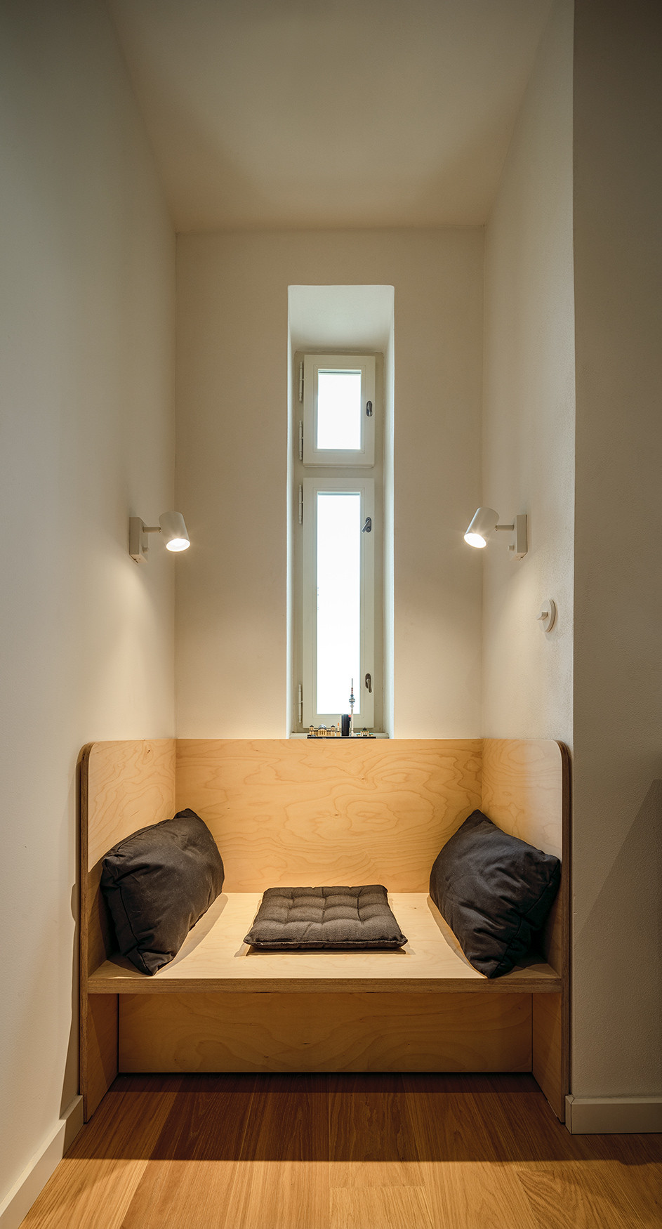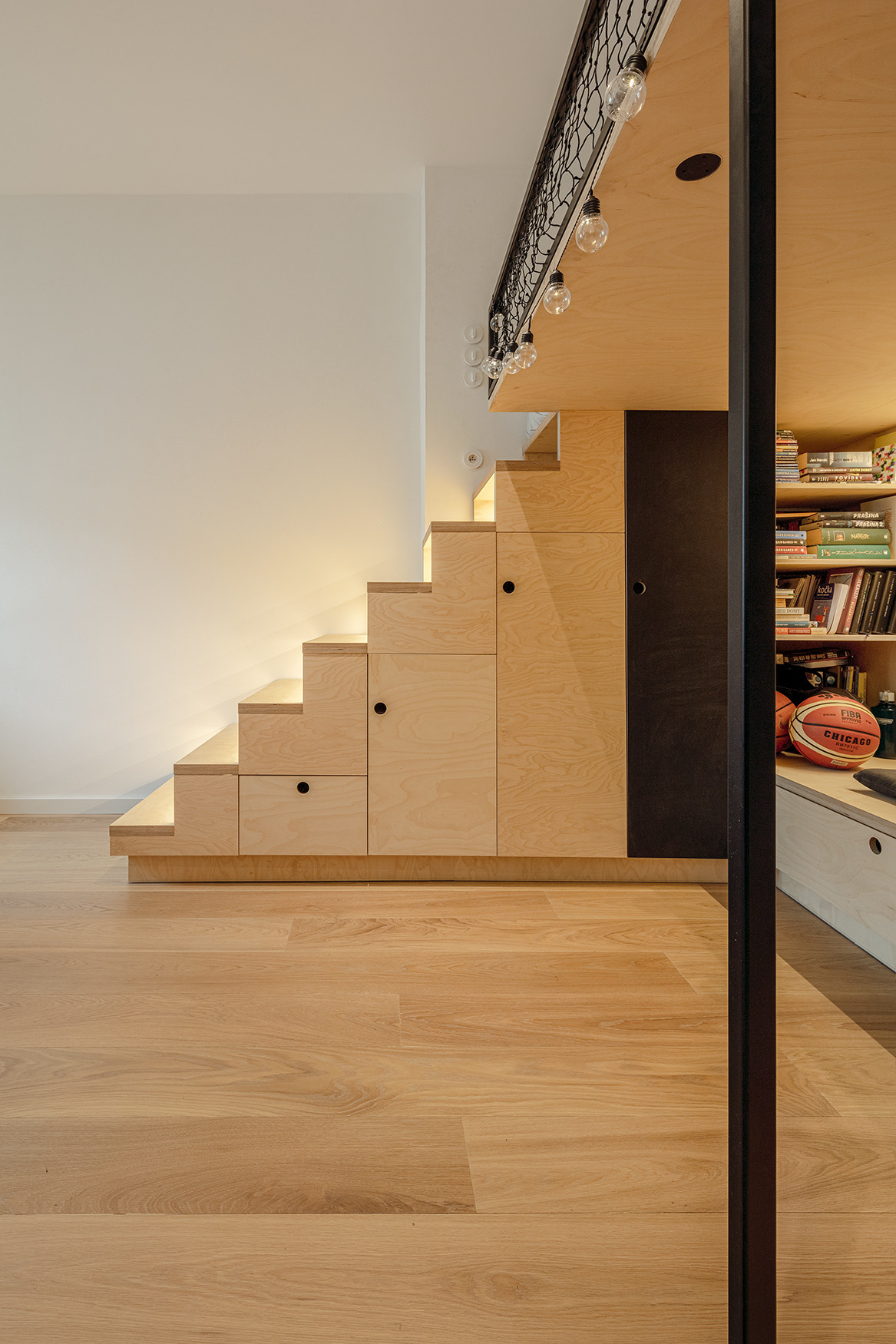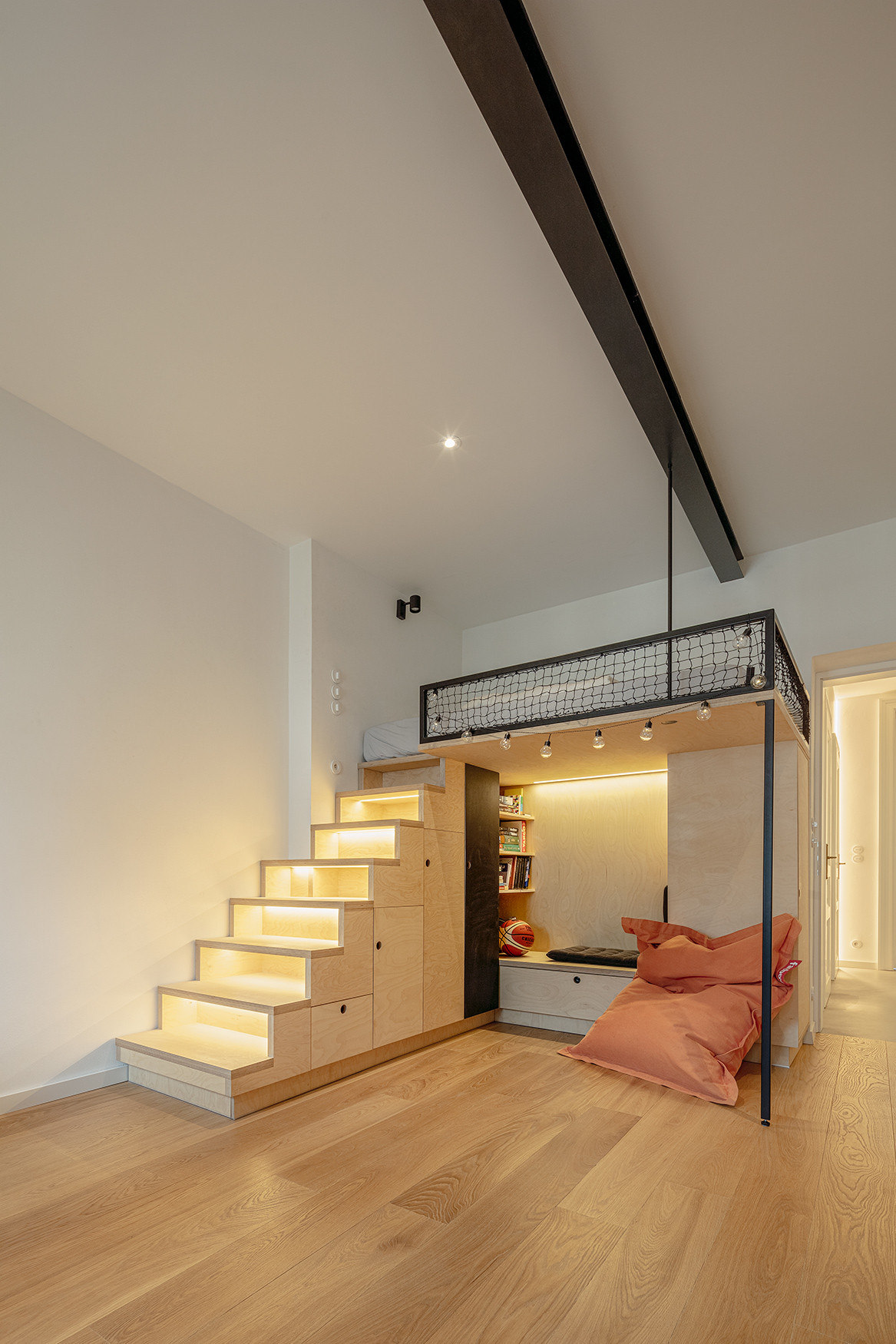 Posledními dvěma místnostmi bytu jsou pokoje dospívajících dětí, přístupné z haly. Zde je architekty navržen celistvý modul patra z březové překližky a černého kovu, poskytujícího v přízemí pohodlný čtecí kout s knihovnou, ve stupních schodů zabudovanou šatnu a v horní části pohodlné spaní. V místnosti je i pracovní stůl a další čtecí sezení, zabudované ve výklenku pod oknem.