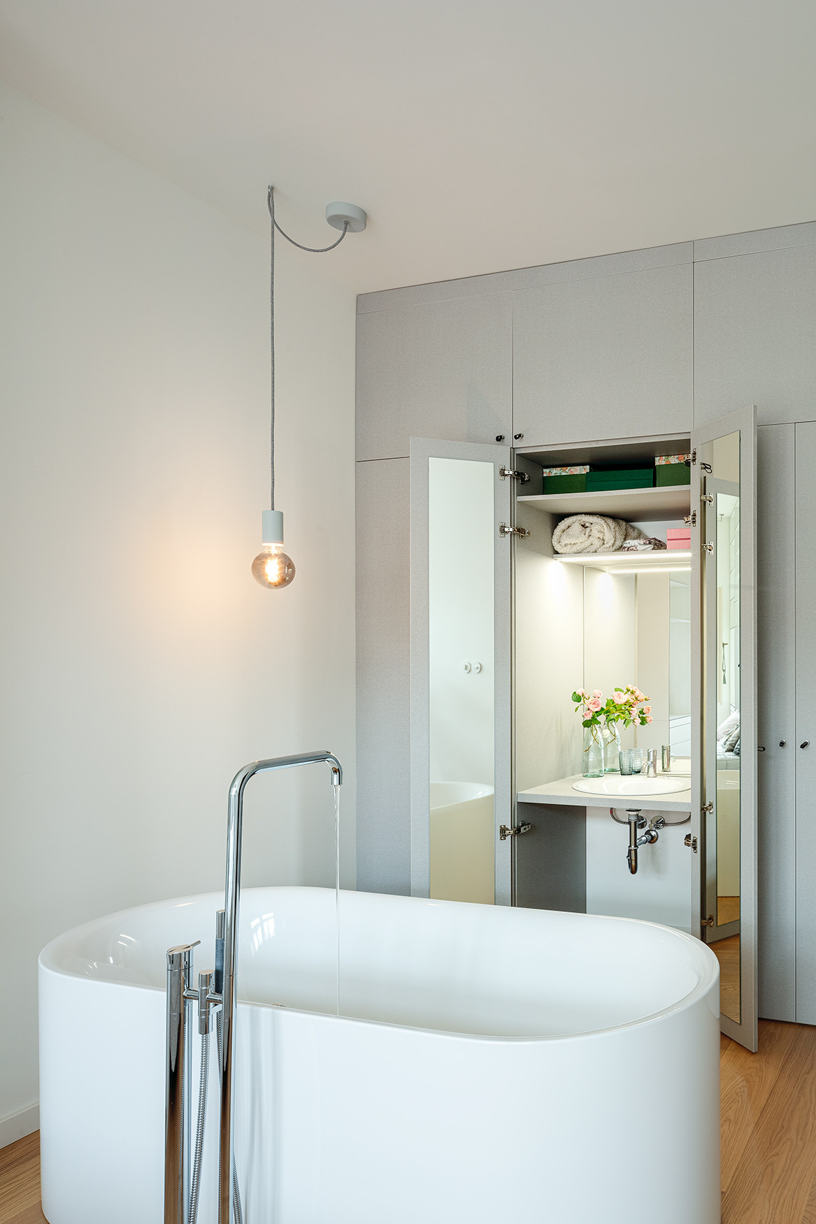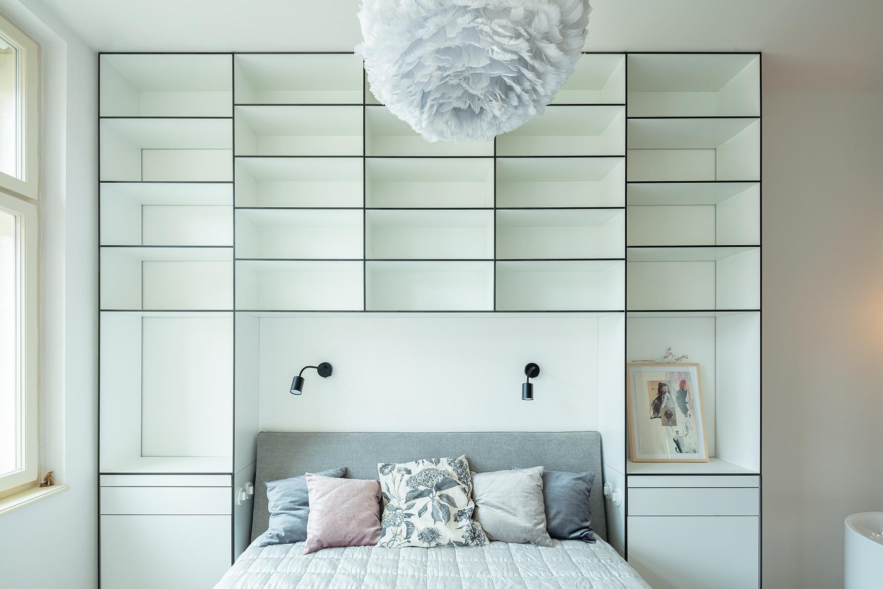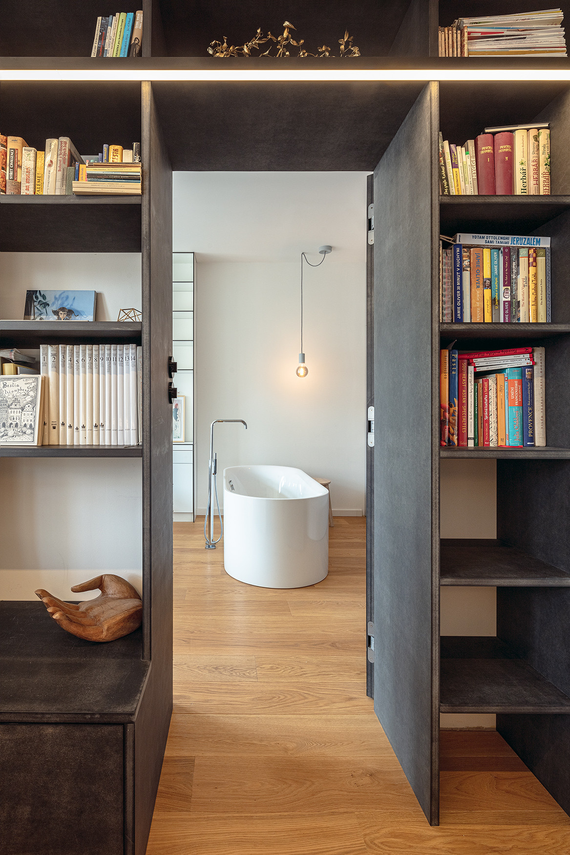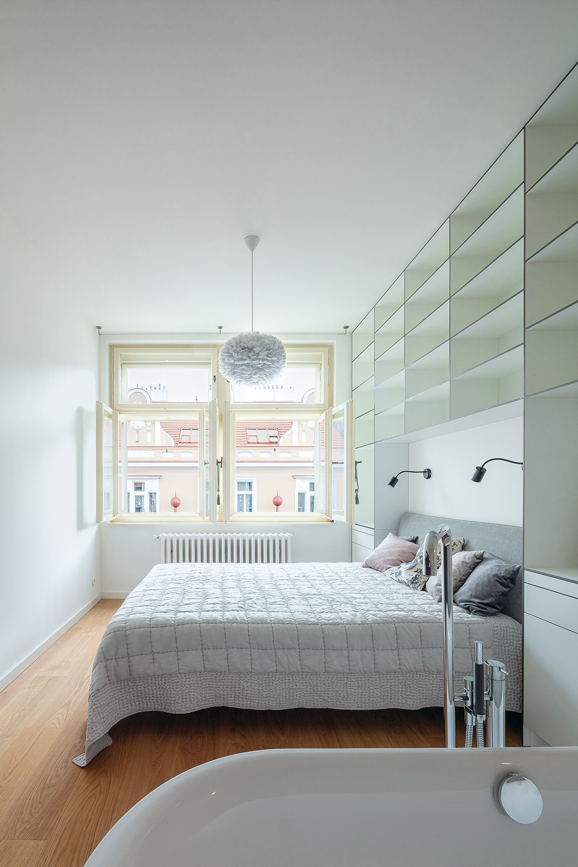 Na obytný prostor navazuje ložnice rodičů. Nad postelí se klene subtilní kompaktová knihovna s vestavěnými nočními stolky. Stěnu naproti oknům pokrývá šatní skříň, která kromě prostoru pro oblečení ukrývá i toaletní část se zabudovaným umyvadlem. Perlou ložnice je solitérní vana značky Bette, jedno ze splněných přání klienta.
