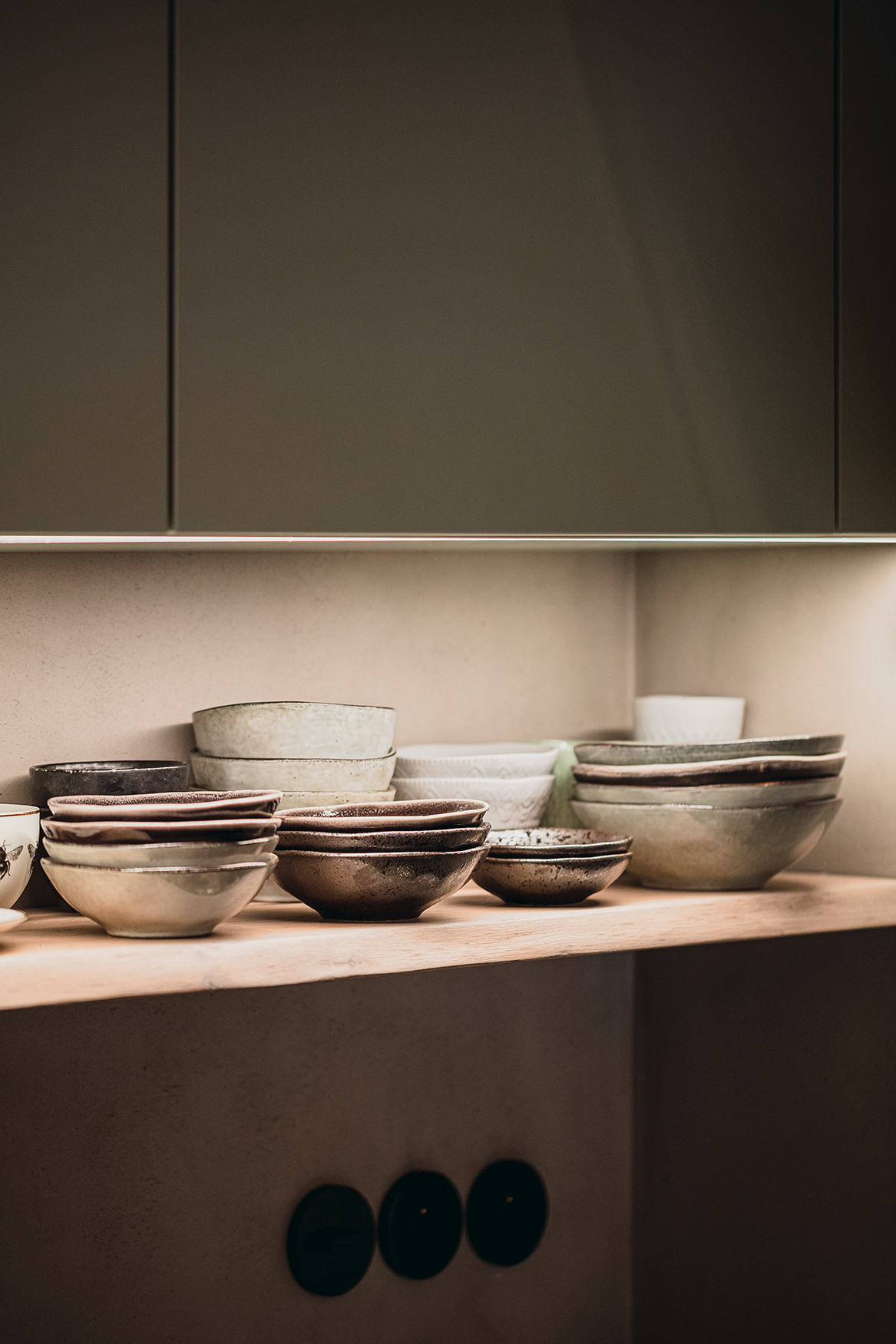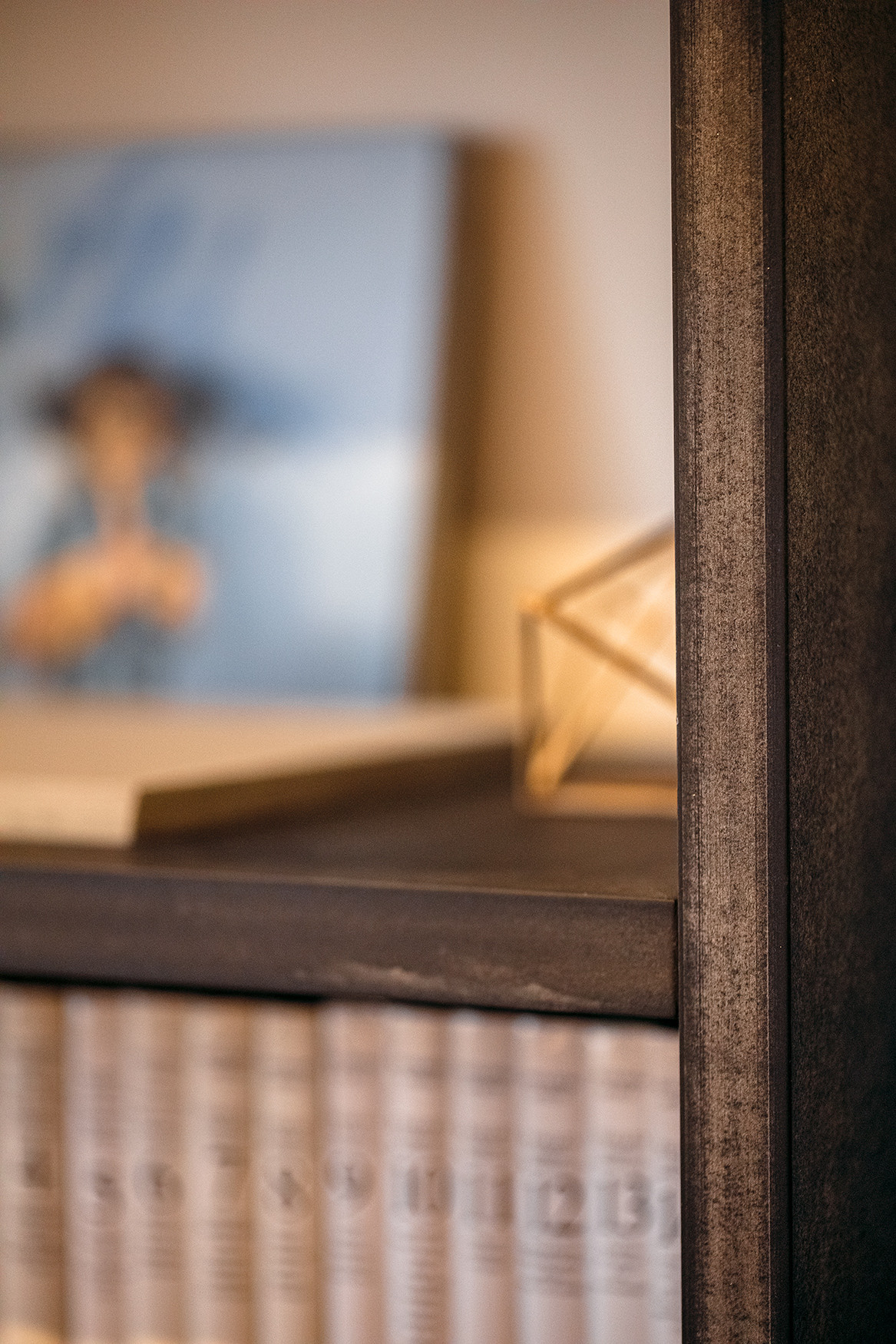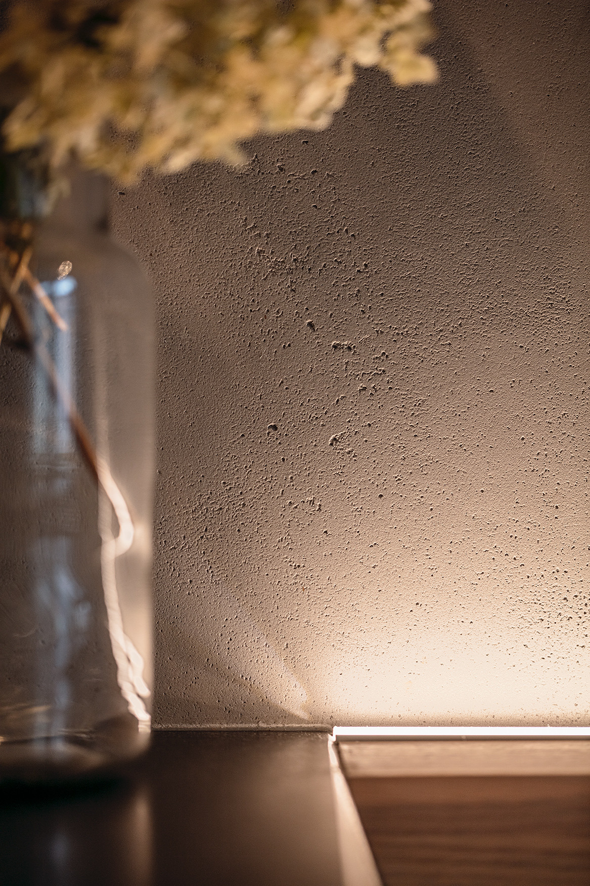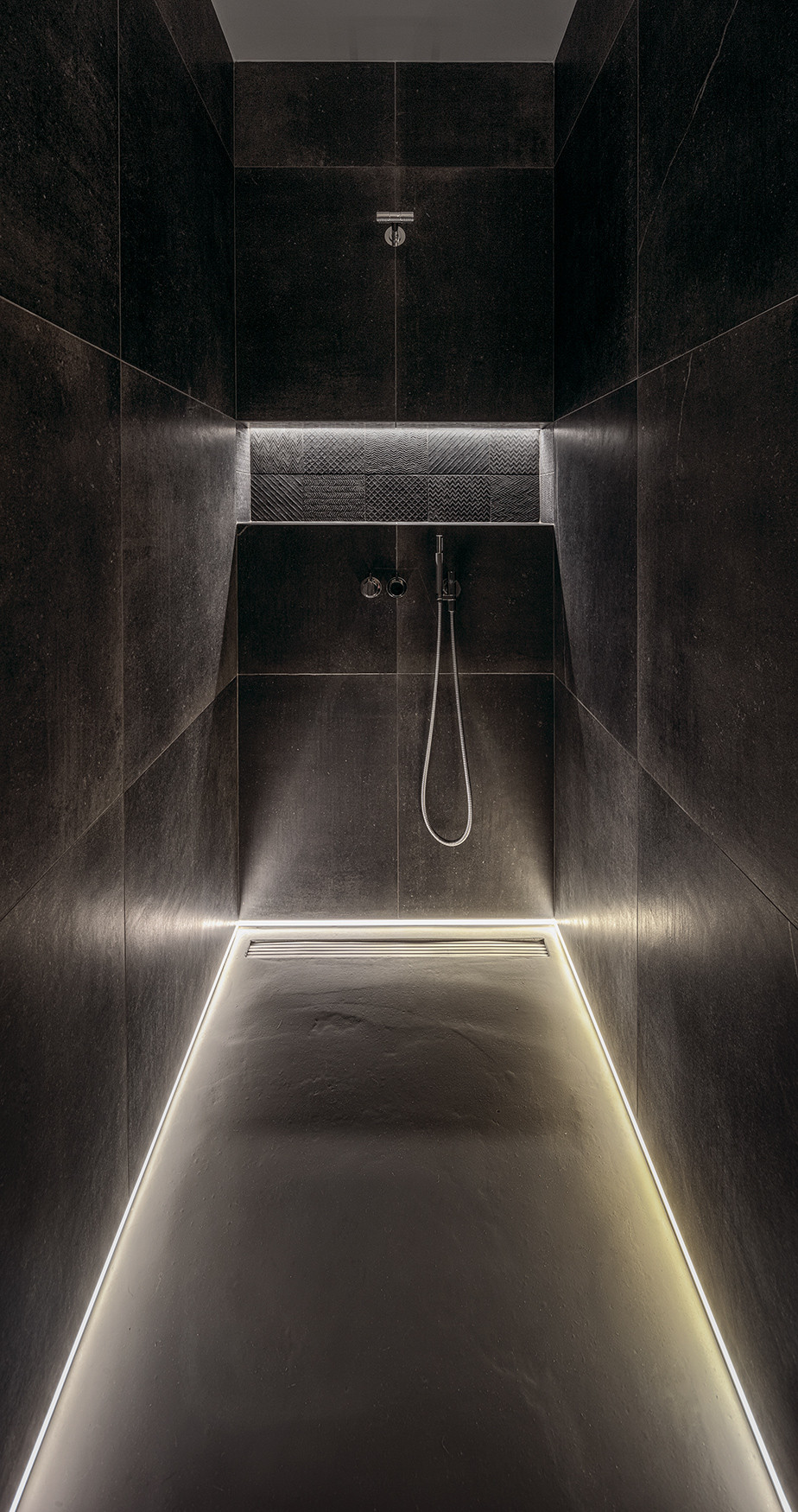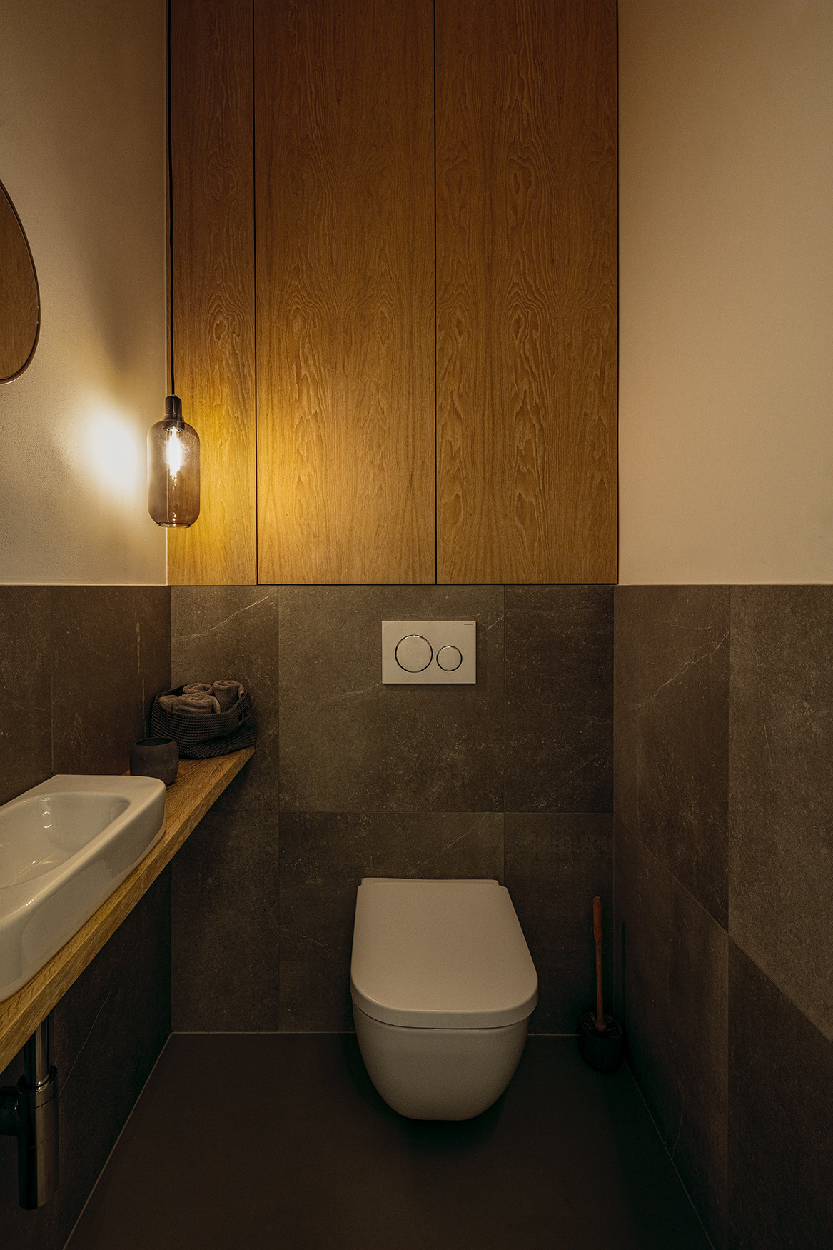 Celou realizaci provází motiv klidného kontrastu. Do neutrálních barevných tónů tu pronikají černé akcenty v kuchyni a studentských pokojích, barevnost jde v jemných valérech od světlé ložnice až k tmavým motivům knihovny či sprchového koutu. Jemnou hru vytvářejí i výrazná architekty navržená světla, kruhové v hale a výrazná přímka v obytném prostoru. Je vidět, že klient získal díky komplexnímu architektonickému návrhu řádově mnohonásobně kvalitněji zpracovaný prostor, který se přizpůsobil jeho přáním a požadavkům. Vzniklo výjimečné bydlení s mnoha chytrými řešeními a vzájemně provázanými estetickými a funknčními prvky.