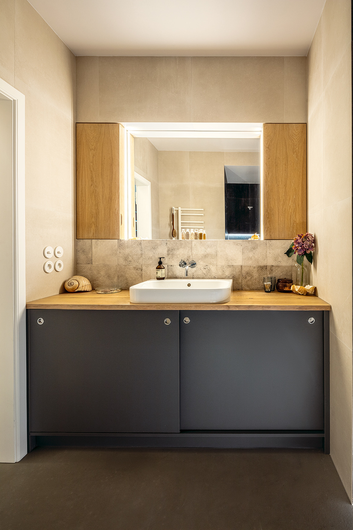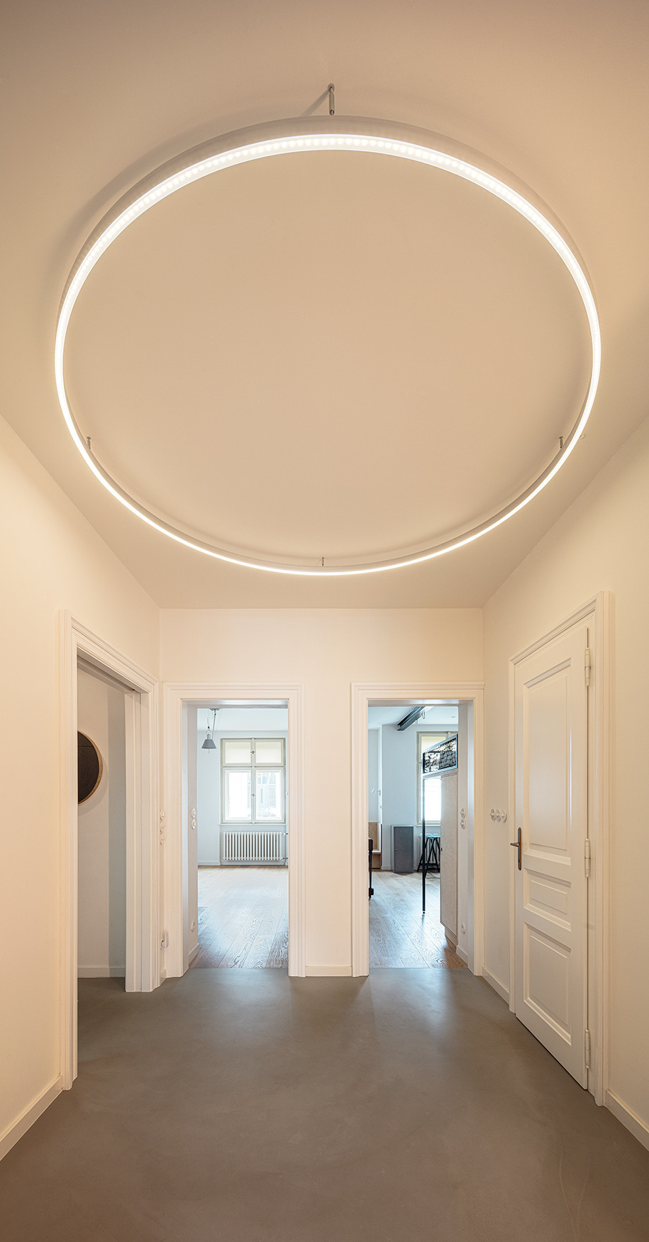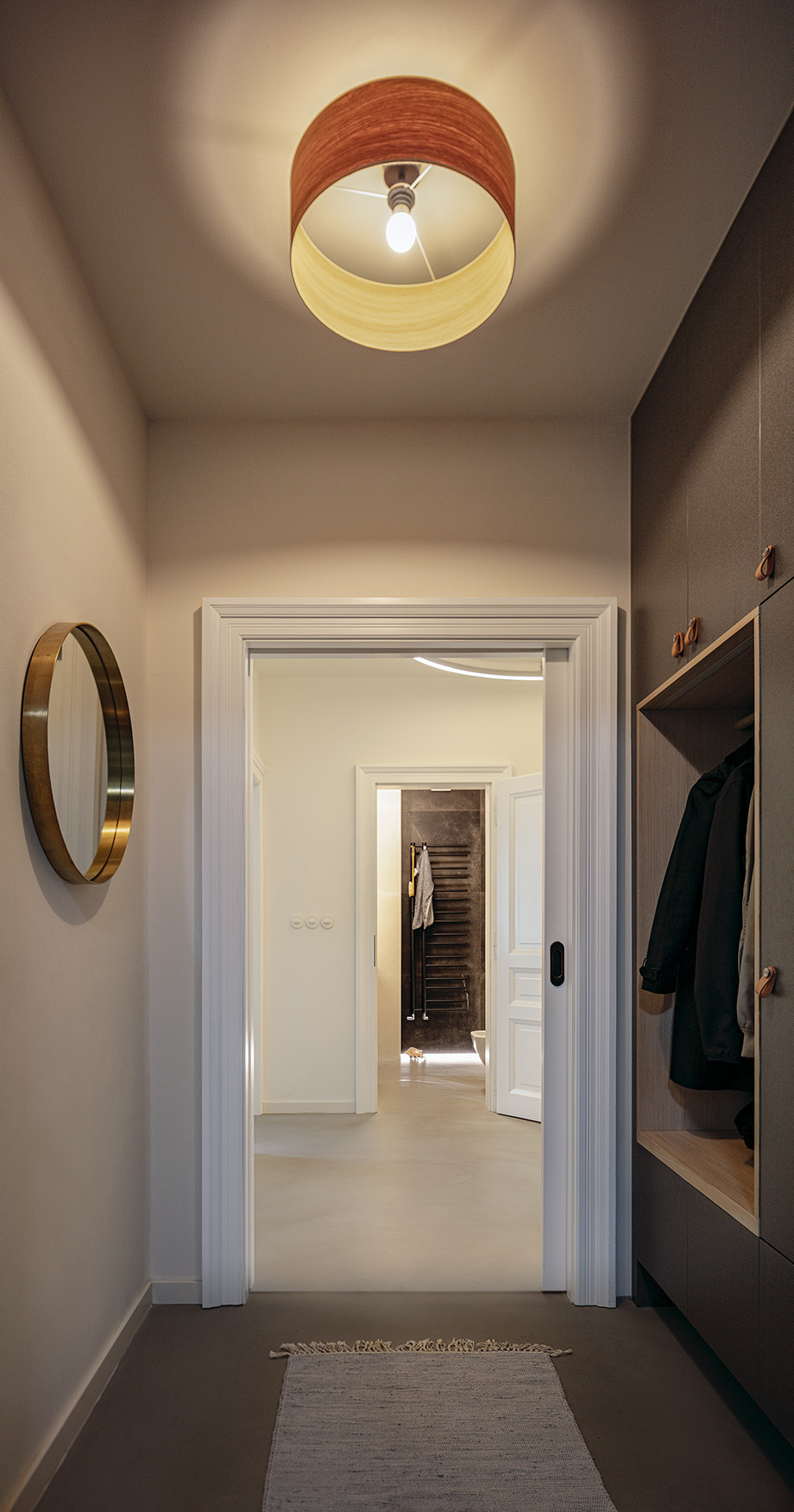 Do bytu se vchází přes vstupní chodbu s vestavěnou skříní, na kterou navazuje prostorná hala s kruhovým světlem navrženým architekty. Z ní je možné vstoupit do společné koupelny, ve které je umístěn podsvětlený sprchový kout, bidet a pult se zabudovaným umyvadlem. Z haly se rovněž vstupuje na toaletu, do technické místnosti, do obytného prostoru s kuchyní a do dvou ložnic dospívajících dětí.