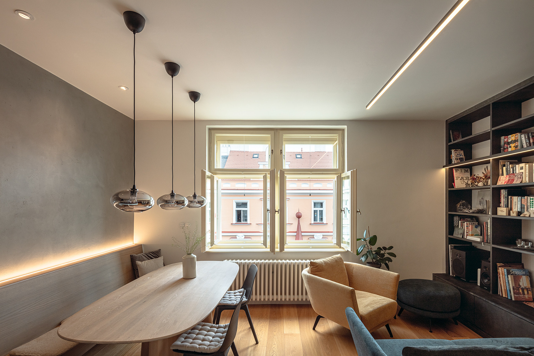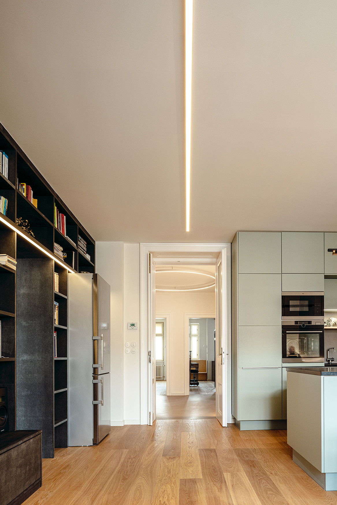 Hlavní obytný prostor s kuchyní je srdcem celého bytu a hlavním společným prostorem pro celou rodinu. Světle zelený segment kuchyně poskytuje dostatečný prostorový komfort, zároveň však díky své celistvosti a uzavřenosti nijak vizuálně neruší. Pracovní plochu tvoří kamenná deska, ve které je zabudovaná varná deska s teppanyaki grillem a zabudovaným kastlíkem na bylinky. Na kuchyň navazuje jídelní část místnosti s lavicí s LED podsvícením, zakulaceným jídelním stolem a židlemi. Protiváhou je odpočinková část obytné místnosti, kterou tvoří černá knihovna z probarvených MDF desek, vyplňující celou delší stěnu místnosti a pohodlné sezení řešené solitérní pohovkou a křeslem. Osvětlení místnosti je zpracováno citlivým výběrem zajímavých solitérních světel a zabudováním světelných pásů do knihovny, jídelní lavice a kuchyňských skříněk.