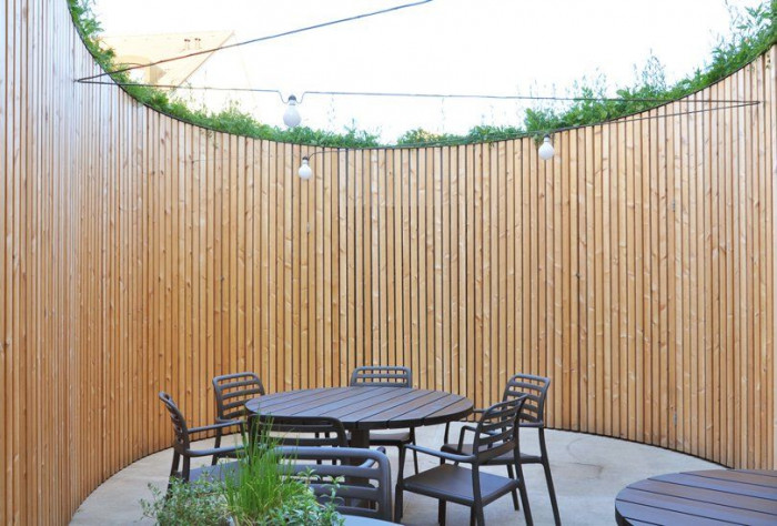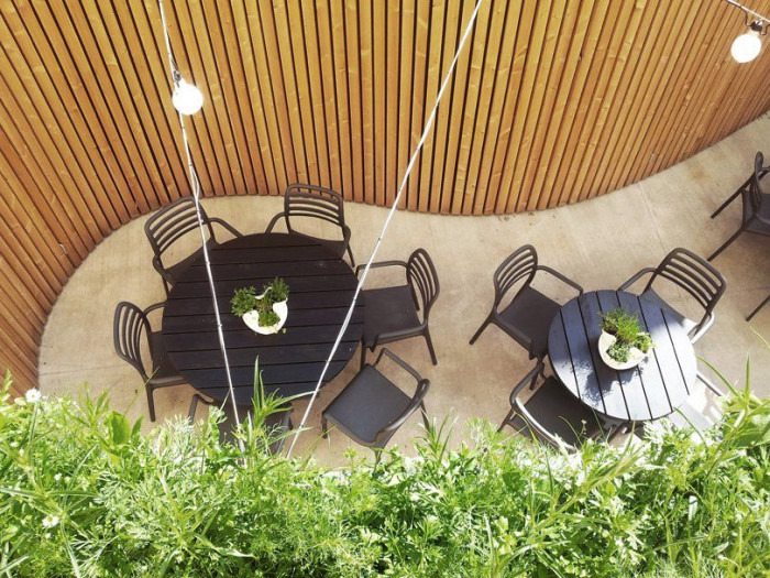 Díky rostlinám vysazeným mezi její vnější a vnitřní plášť (vystupující nad okolní terén zhruba metr), působí navenek jako skutečná zahrada – nečekaný zelený ostrov uprostřed asfaltového moře. Poměrně hluboko pod kvetoucí zelení, v úrovni podlahy suterénní restaurace, se pak odehrává docela jiné dějství: v prostoru vymezeném dřevěnými lamelami sedí u kulatých stolů nikým nerušení hosté, vychutnávající si oběd pod širým nebem. Vnitřní organický tvar není náhodný, odpovídá mimo jiné daným prostorovým požadavkům pro zabudování technických zařízení (přilehlé restaurace) a skladových prostor v mezipláští.
