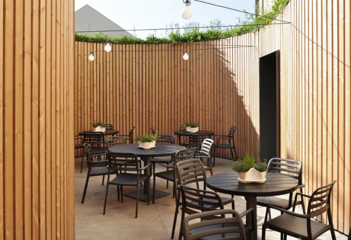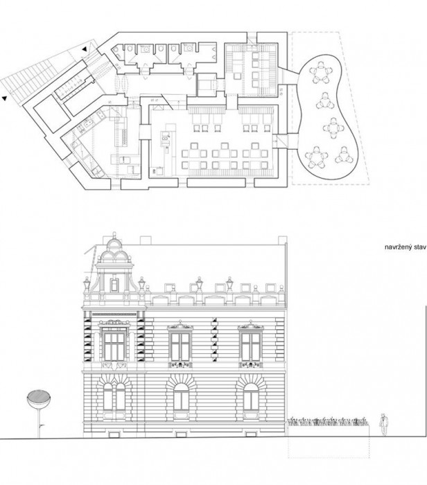 Venkovní zahrádka vznikla na základě zadání navrhnout protipovodňové opatření, které zamezí opakovanému vniknutí všeničící vody do útrob restaurace oknem, situovaným původně těsně nad zemí. Přes vyhloubený venkovní prostor sezení (situovaný před tímto oknem) se voda dovnitř víckrát nedostane.