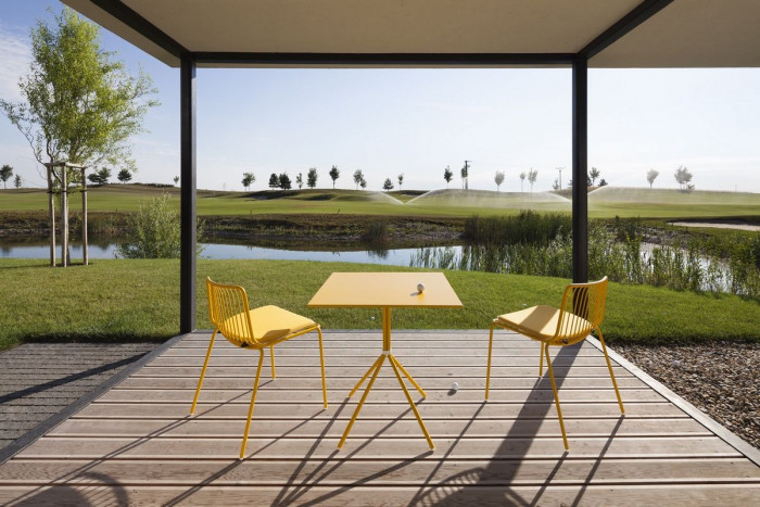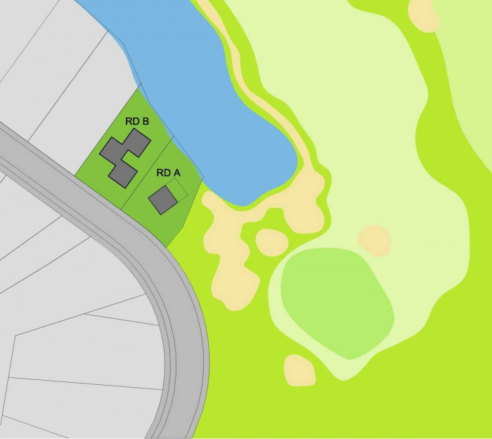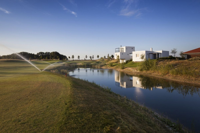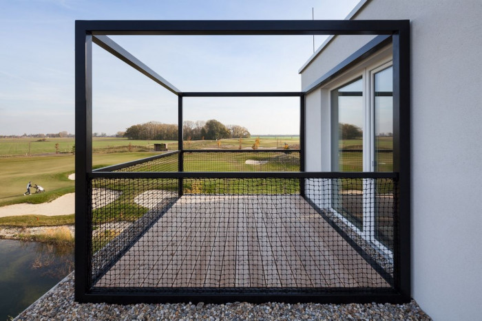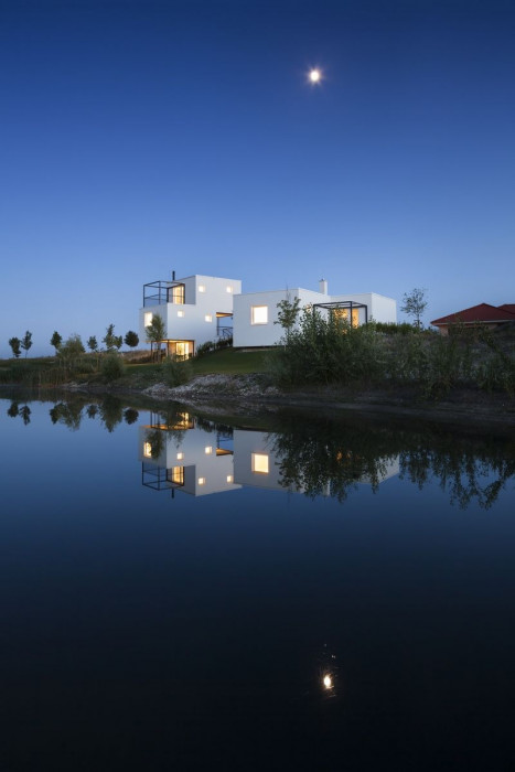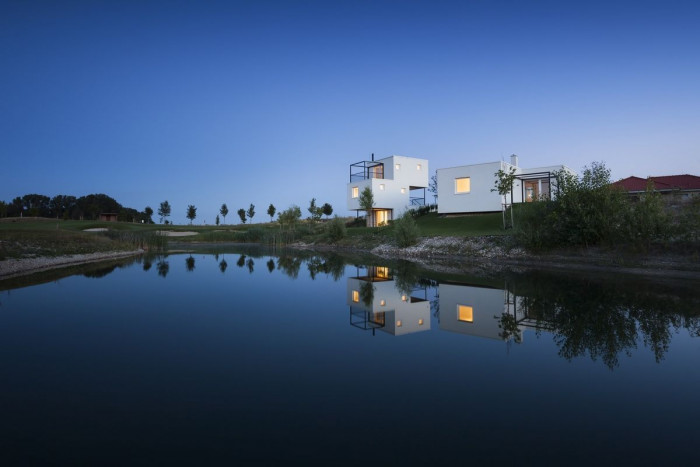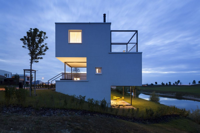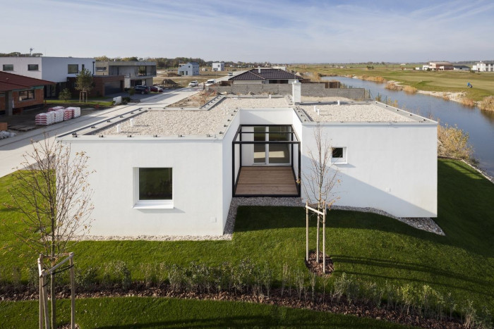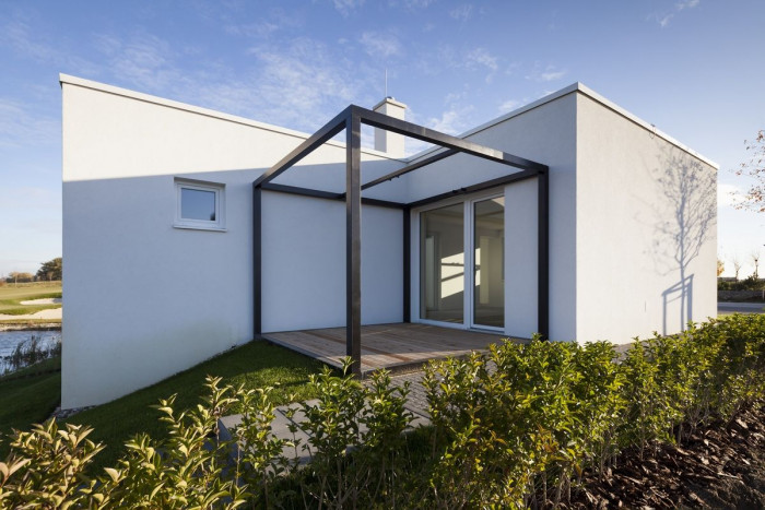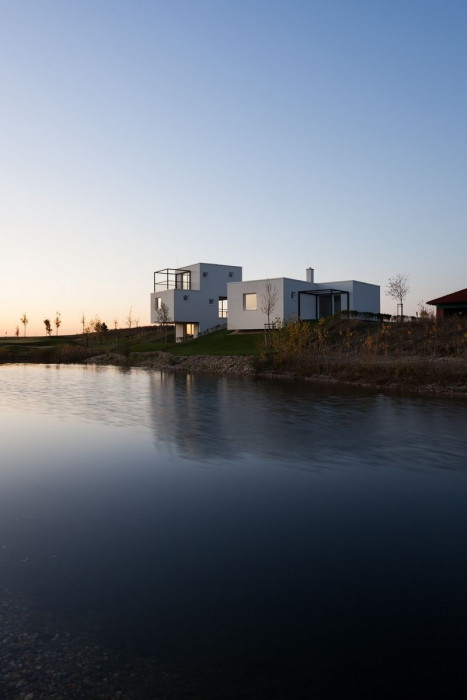 Dům je nízkoenergetický a koncipovaný tak, aby mohl být využívaný jako dům pro malou rodinu, bydlení pro seniory nebo jako víkendové apartmá. Základem domu je krychle – obytná místnost s kuchyní, jídelním stolem, krbem a terasami. K němu přiléhají dvě ložnice se samostatnými koupelnami. Zvýšené prostory doplňují potřebný komfort – vstup, sklad a šatník. Dům má přímý vstup k vodě a výhled na jamku golfového hřiště.