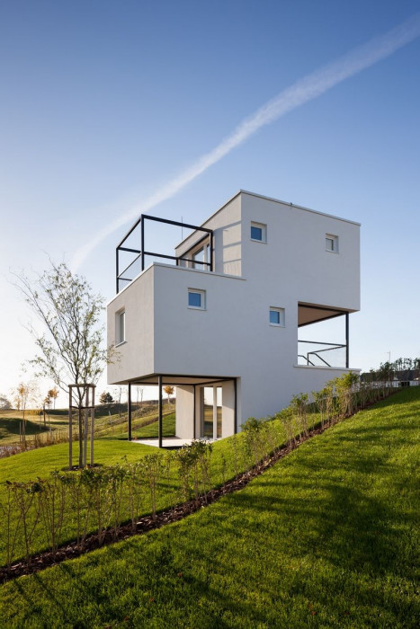 Na začátku bylo nutné zadání přehodnotit – velikost, potřebné místnosti, jejich orientace, vybavení technologiemi, potřebu a způsob řešení soukromí. Požadavky následně zredukovat na komfortní minimum za účelem minimální starostlivosti – energetická nenáročnost, časová a finanční úspora. A nakonec navrhnout formu, která zhmotní myšlenku na reálné parcele. Celý záměr je podpořený minimalistickým stylem bez jakýchkoli příkras a nechává vyniknout kompozici hmot i jejich vzájemné působení. Dům je hledáním ideálního poměru mezi soukromím a komunikací s okolím, mezi funkčností a krásou, mezi požadavky a možnostmi.