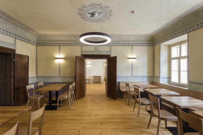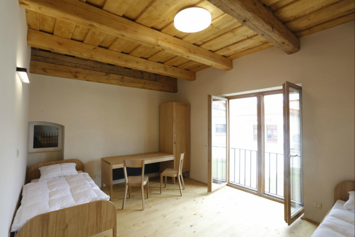 Celkový objem a střechy domu zůstaly bez velkých zásahů, na náměstí se přestavba kromě nového barevného řešení fasády neprojevuje. Původní vstupy do objektu i dispoziční a komunikační rozvržení jsme respektovali. V přízemí domu se kromě vstupní části nachází samostatný byt a kaple. Byl doplněn výtah a venkovní schodiště. V hlavním traktu v patře domu je společenská část, jde o prostory výjimečných prostorových kvalit. K dosažení potřebné kapacity 22 lůžek byla hmota severního křídla protažena na úroveň bývalé stodoly a na místě bývalých stájí, chlévů a sýpky vznikly další pokoje.