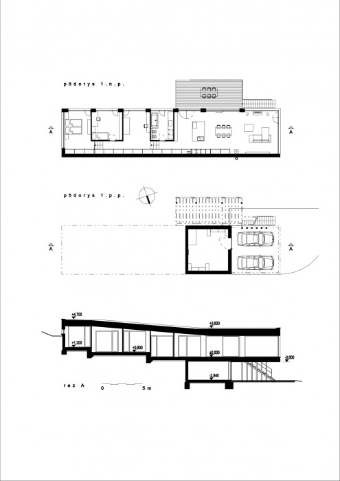 Dispozícia domu minimalizuje miestnosti na to najnutnejšie: žiadne závetria, zádveria, komory ani šatníky. Iba skriňová chodba otvárajúca sa do pracovne a občasnej hosťovskej izby, dve spálne a kúpeľňa. Denná časť pozostáva so spojeného priestoru obývacej izby, jedálne a kuchyne, vstupuje sa z terasy priamo do kuchyne. A hlavne je všetko spojené so záhradou. Namiesto garáže prístrešok vytvorený vykonzolovaním obývacej izby.