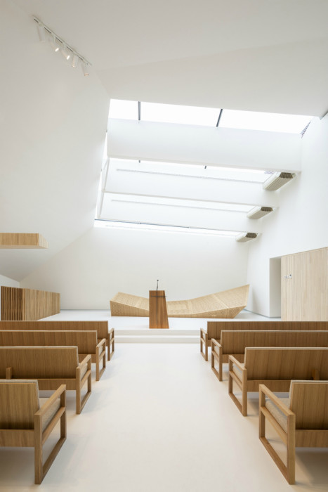 Vnitřní prostor je v podélném směru rozdělen svislými stěnami, v příčném směru jsou stěny naopak šikmé. Kompozičně hlavní sál graduje nad nejdůležitějším liturgickým prvkem – křtitelnicí, srdcem celé modlitebny. Sochařka Jaroslava Kadlecová pojala samotný tvar křtitelnice jako přepis liturgického úkonu křtu. Boční kaple v levé části sálu vytvářejí převýšené prostory pro intimnější liturgii. Naopak velkoryse pojednaný ceremoniální vstup, v zadní části hlavního sálu, vyjadřuje otevřenost prostoru a stírá hranu mezi exteriérem a interiérem. Atmosféra modlitebny je umocněna zvolenými materiály. Kombinace bílých ploch podlahy, stěn a stropu se světlým dřevem interiéru je dána do kontrastu s vnějším vzhledem. Dobrou akustiku hlavního sálu zajištuje zvolený materiál dřevěného obkladu. Ukrývá v sobě jednotlivé vrstvy pohlcující zvukové vlny. Pod samotným akustickým obkladem jsou rovněž umístěny technologie vzduchotechniky a chlazení.
