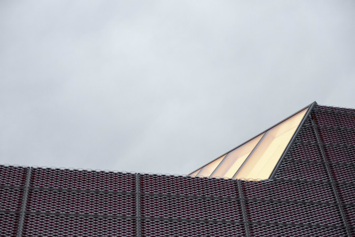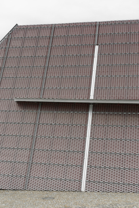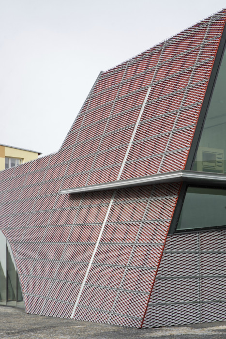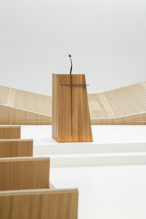 Tvar modlitebny vychází z průniku krystalické formy s organickým tvarem křivky. Pevná hmota, složená z jednotlivých ploch a linií pevně spojená se zemí symbolizuje vymezený prostor života. Křivka jako měkký organický prvek, představuje spontánnost a dynamiku života – křivka, jež nás vyvádí z rovnováhy pevné formy. Duchovní rozměr charakteru objektu je vyjádřen vertikální kompozicí světla, velkorysé prosklené plochy nad kazatelnou. Konstrukčně je modlitebna tvořena trojicí vzájemně do sebe zapřených betonových desek. Fasáda modlitebny je provedena z tahokovu. Pod něj je umístěna červená folie a spolu utváří výsledný barevný efekt. V průběhu dne modlitebna mění svou barevnost v závislosti na intenzitě a směru slunečního světla. Barevnost rovněž ovlivňuje vzdálenost modlitebny. V její blízkosti vnímáme více červenou barvu, naopak když se vzdalujeme, převládá stříbrná barva.
