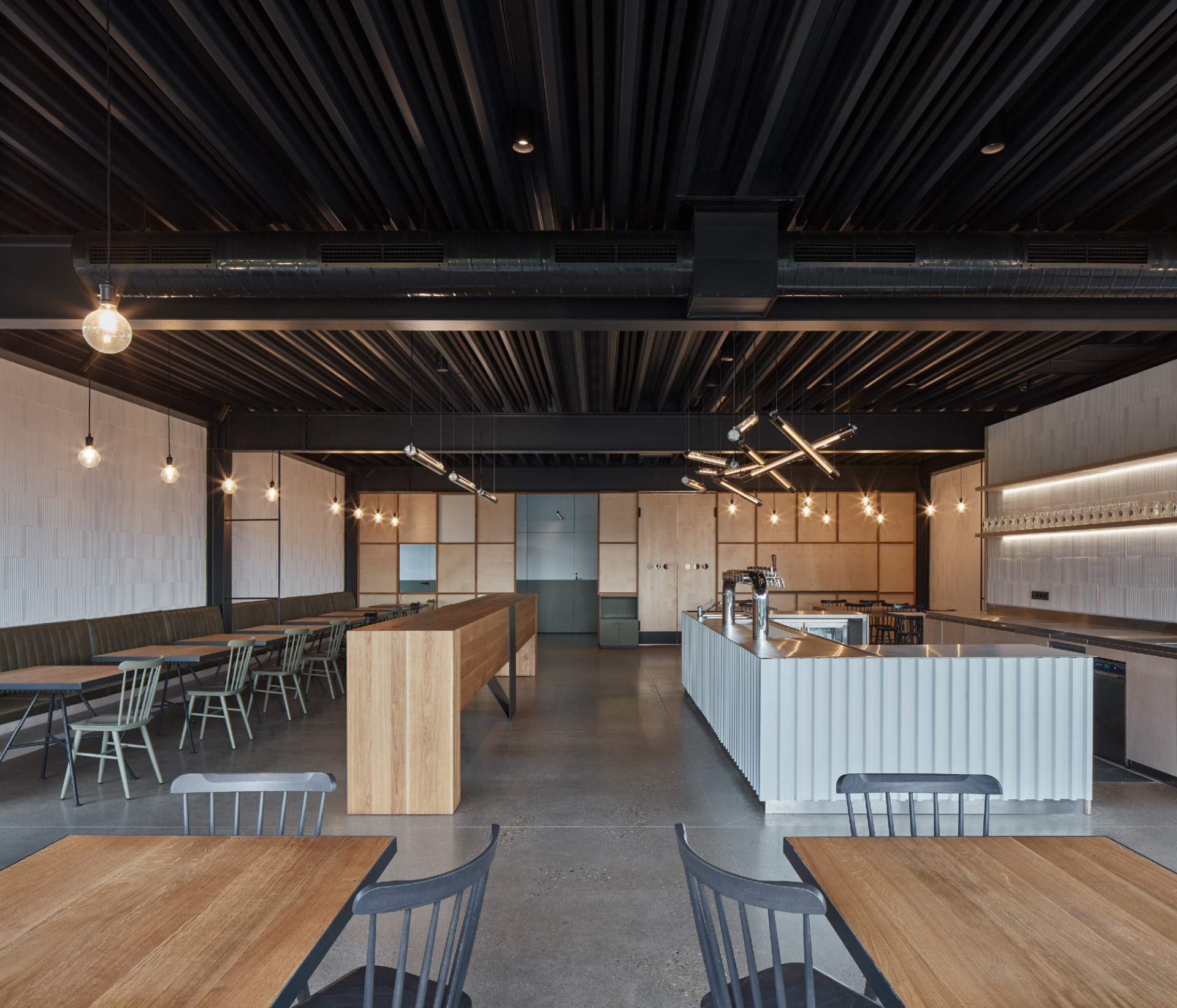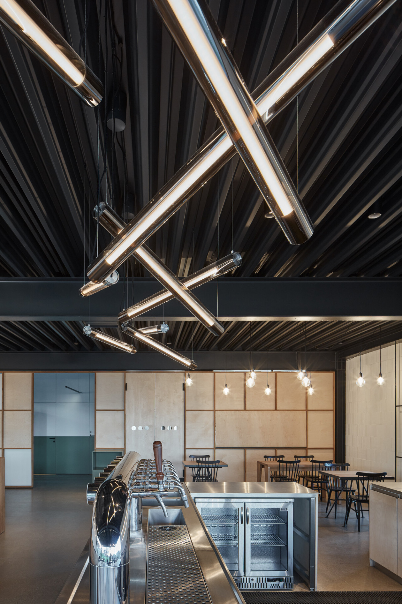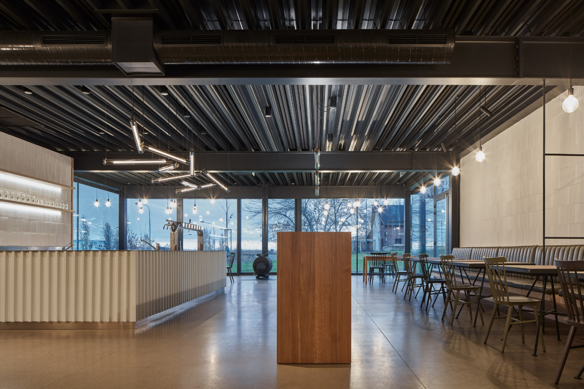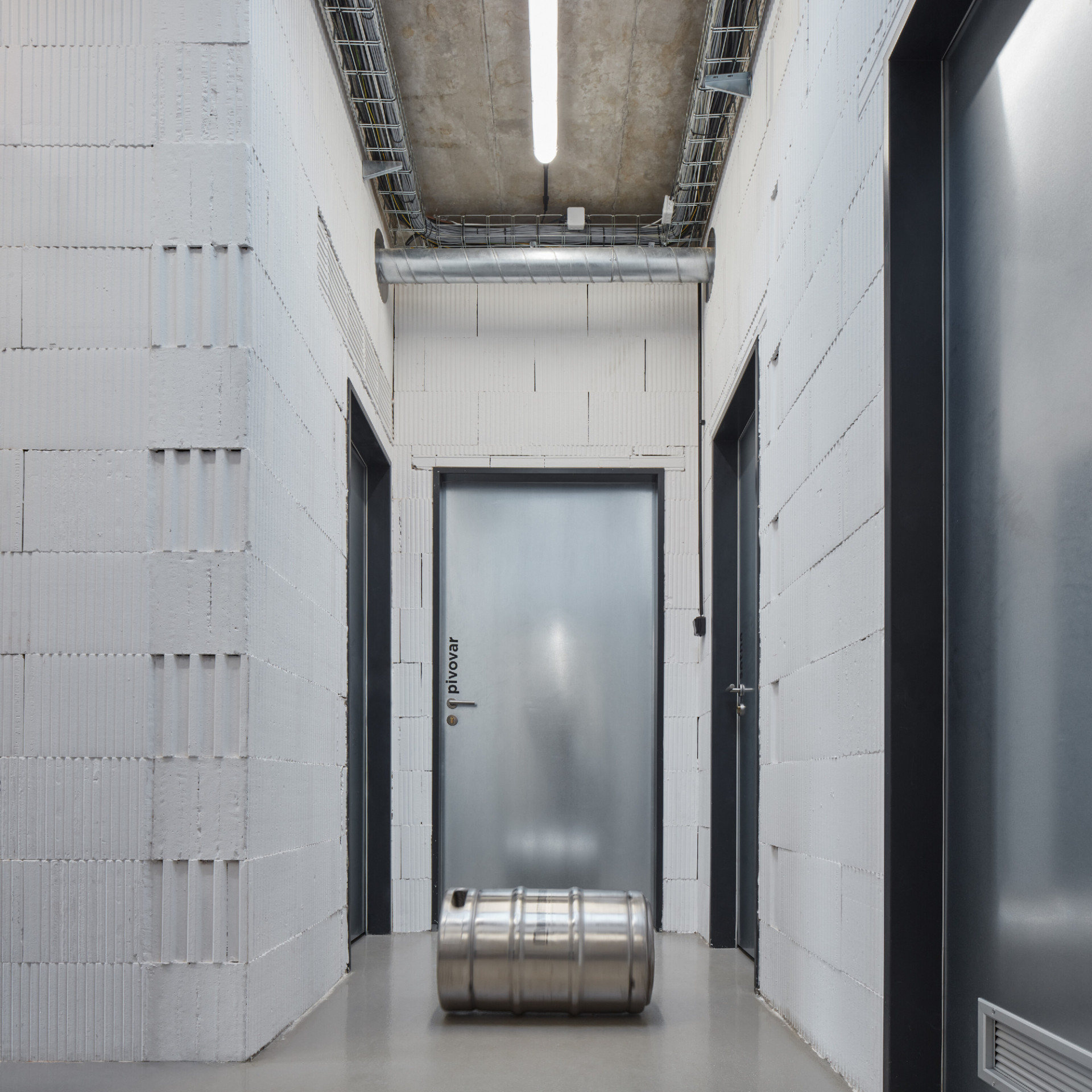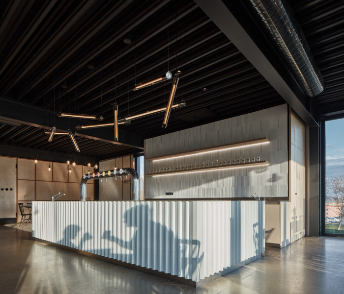 Vnitřní dispoziční uspořádání je dáno jeho provozními potřebami. V podlouhlém objektu lze nalézt dva hlavní provozní celky. Na severní straně je zázemí pivovaru, kde dochází ke vzniku hlavního produktu – výroby piva. Na opačném konci je pak prostor restaurace s výčepem a také zázemí kuchyně.Interiér objektu je též navržen velmi jednoduše. Stěny jsou ve velké míře ponechány v surovém, vyzděném stavu, přetřené pouze bílou výmalbou. Lokálně, např. v sociálním a kuchyňském zázemí, je cihla doplněna keramickým obkladem. Hlavní veřejný prostor objektu – restaurace – je kombinací cihelného zdiva, dřevěného nábytku s kovovými detaily, ocelových prvků konstrukčního rázu a betonové broušené podlahy. V centrální části místnosti jsou dva hlavní pulty, jeden výčepní a druhý barový.