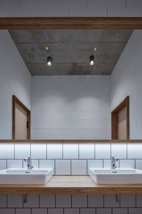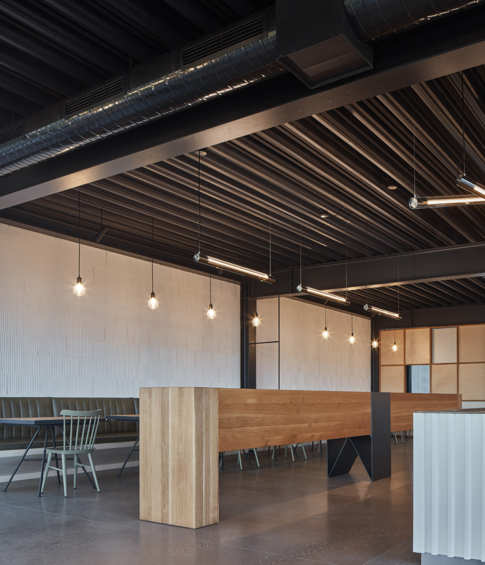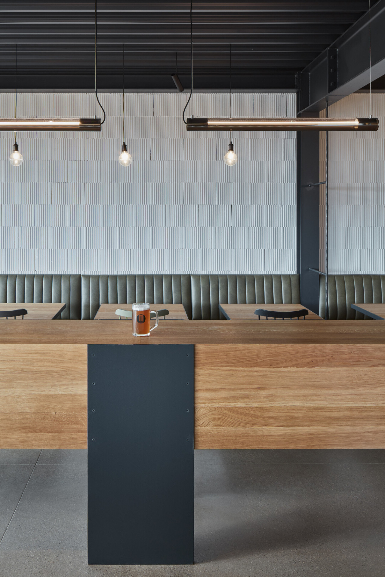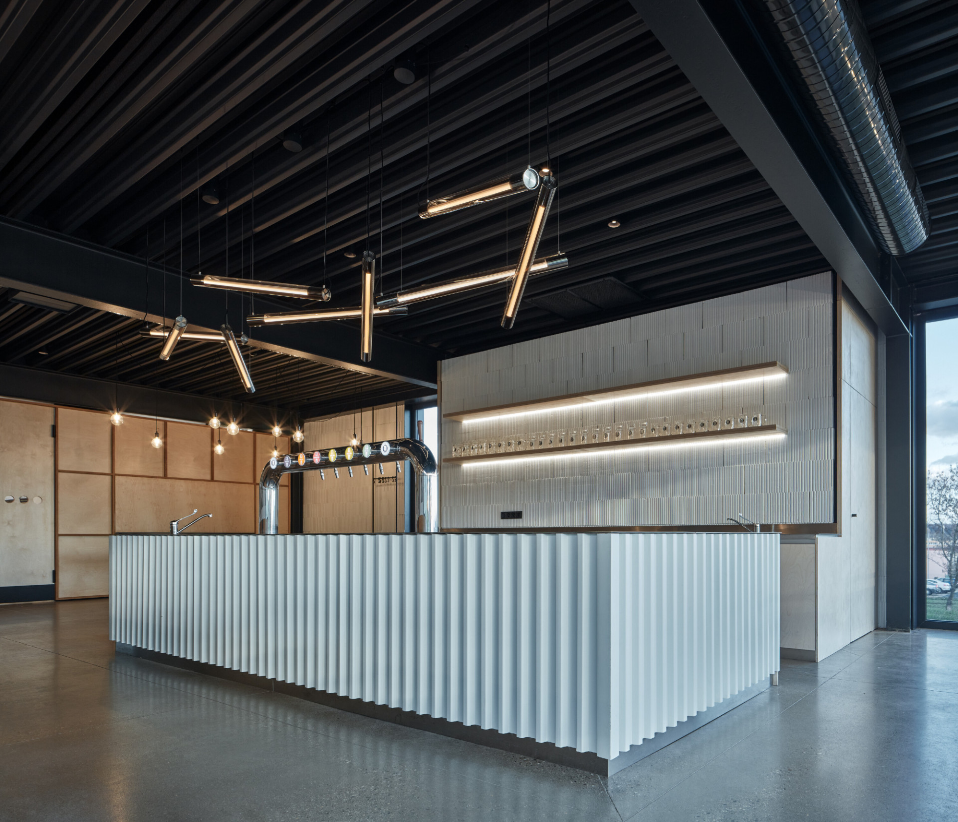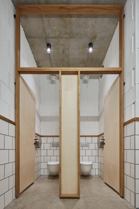 Vnitřní dispoziční uspořádání je dáno jeho provozními potřebami. V podlouhlém objektu lze nalézt dva hlavní provozní celky. Na severní straně je zázemí pivovaru, kde dochází ke vzniku hlavního produktu – výroby piva. Na opačném konci je pak prostor restaurace s výčepem a také zázemí kuchyně.Interiér objektu je též navržen velmi jednoduše. Stěny jsou ve velké míře ponechány v surovém, vyzděném stavu, přetřené pouze bílou výmalbou. Lokálně, např. v sociálním a kuchyňském zázemí, je cihla doplněna keramickým obkladem. Hlavní veřejný prostor objektu – restaurace – je kombinací cihelného zdiva, dřevěného nábytku s kovovými detaily, ocelových prvků konstrukčního rázu a betonové broušené podlahy. V centrální části místnosti jsou dva hlavní pulty, jeden výčepní a druhý barový.
