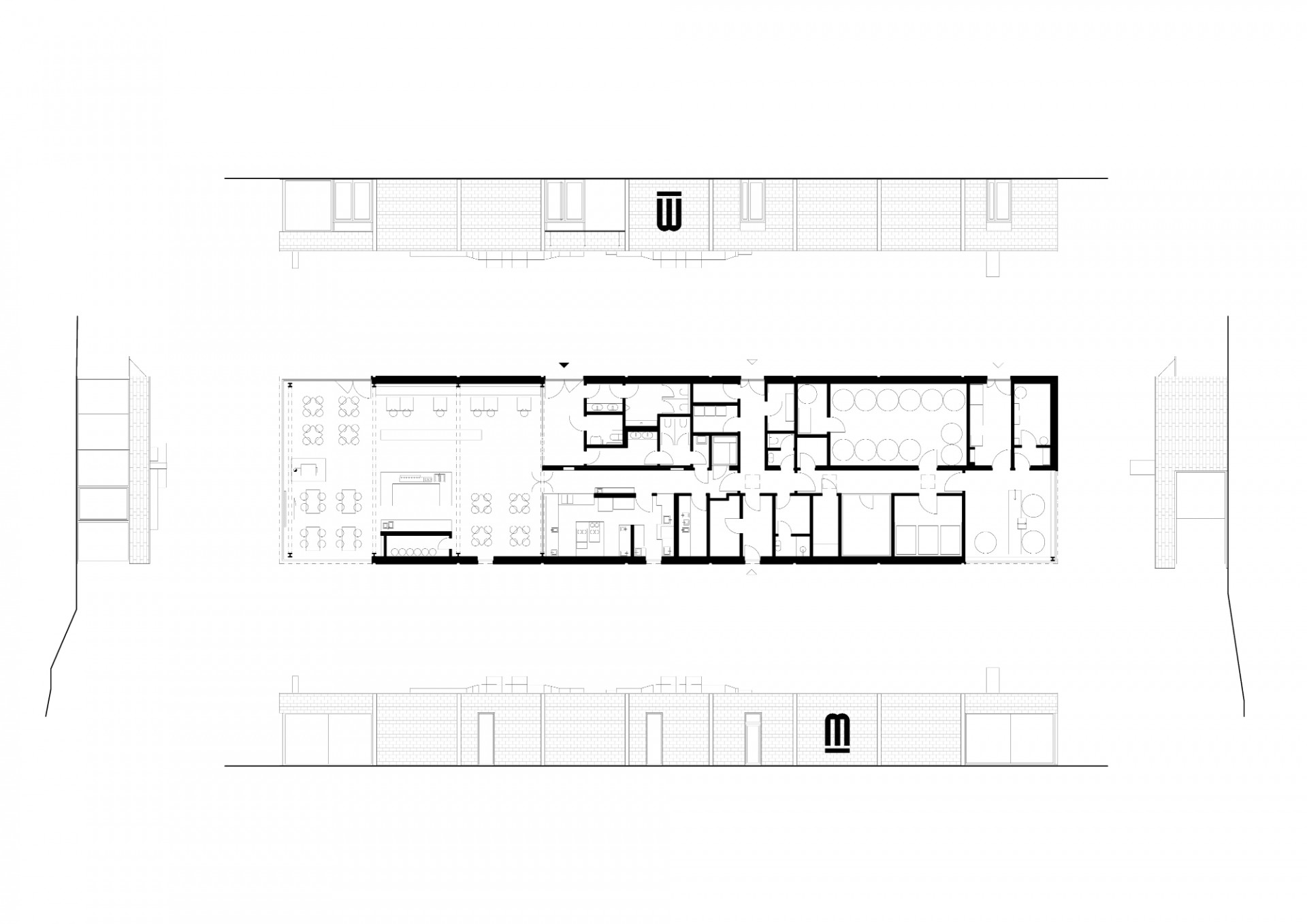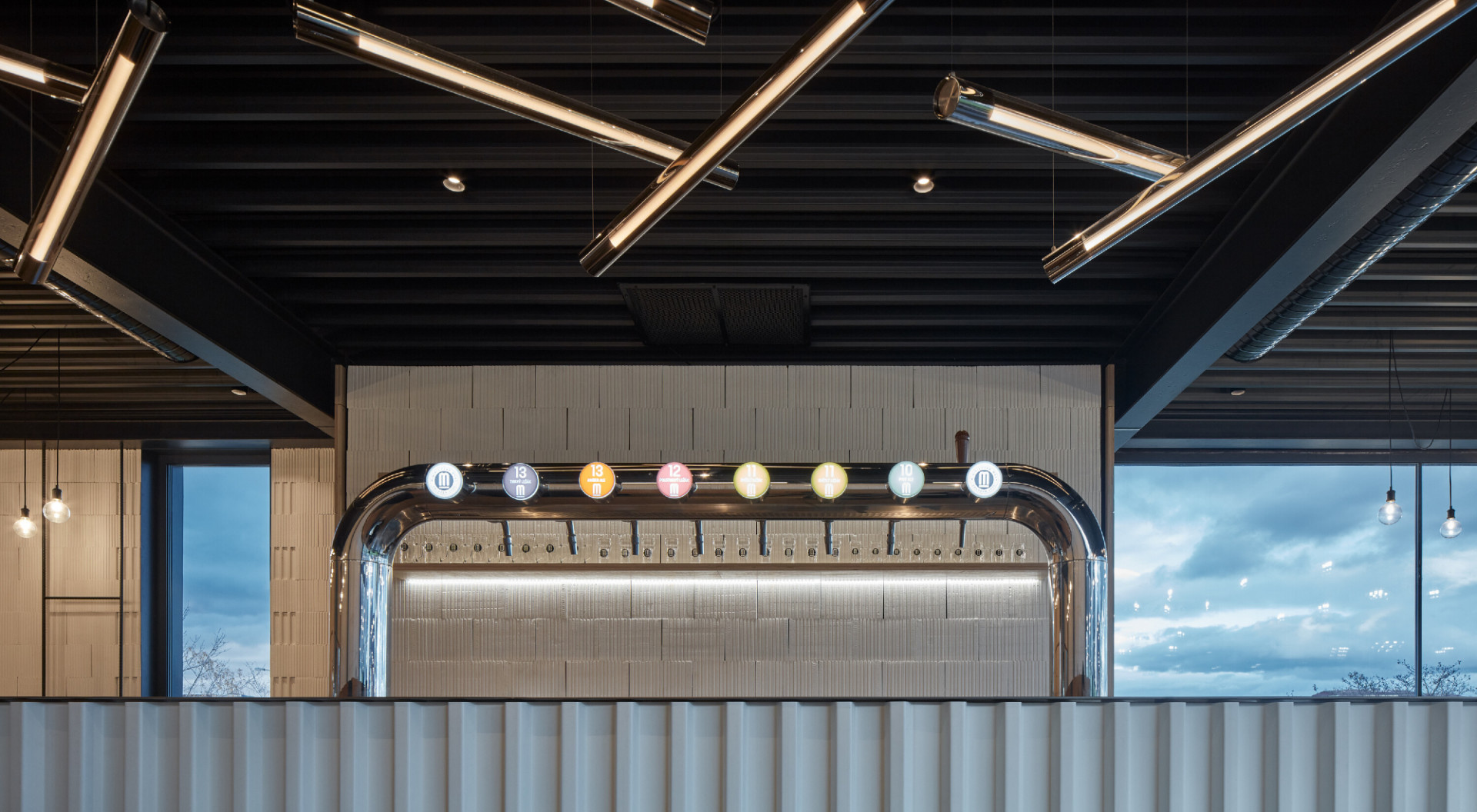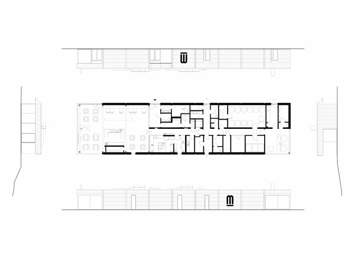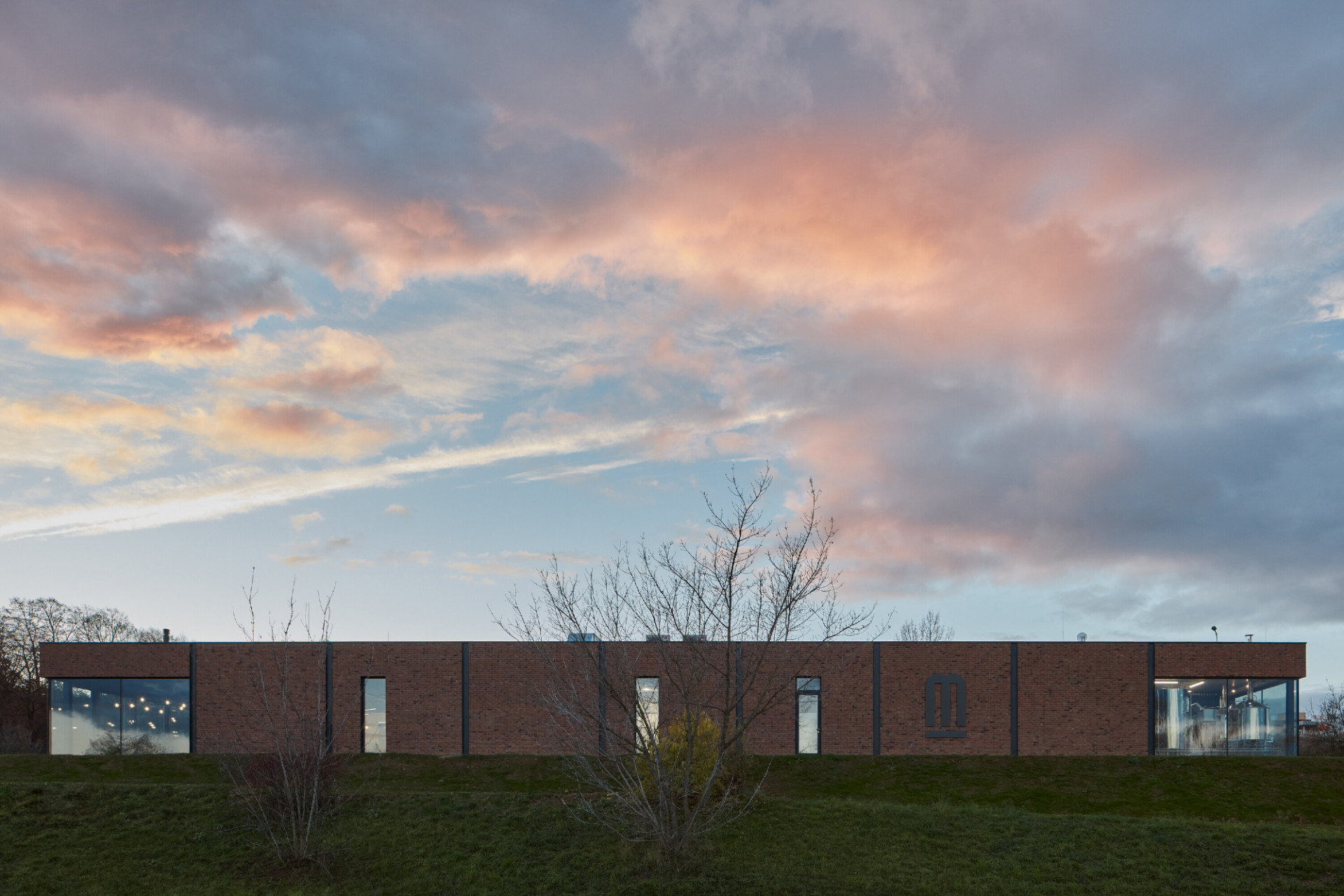 Kontakt s okolím i tvář pivovaru obecně doplňuje graficky ztvárněné logo v podobě písmene M, které je nejen základním označením piva, ale nakonec i fasády celého objektu. Logo, stejně jako celý objekt je jednoduché, čisté a na fasádě je provedeno z černého ocelového plechu.K restauraci také přiléhá venkovní terasa, která je z části překryta drátěnou konstrukcí po které se bude v letních obdobích popínat chmel, stejným způsobem jako na nedalekých chmelnicích.